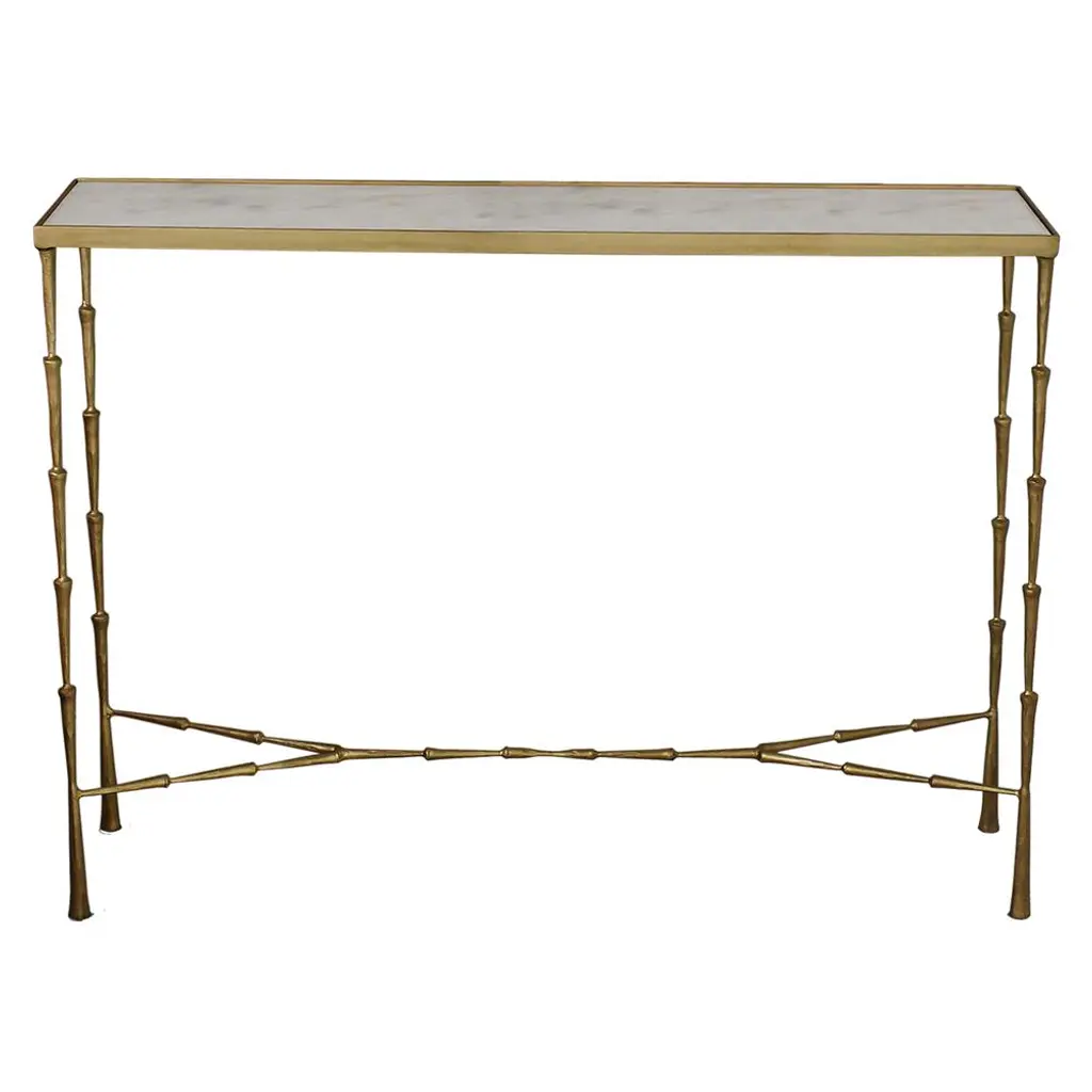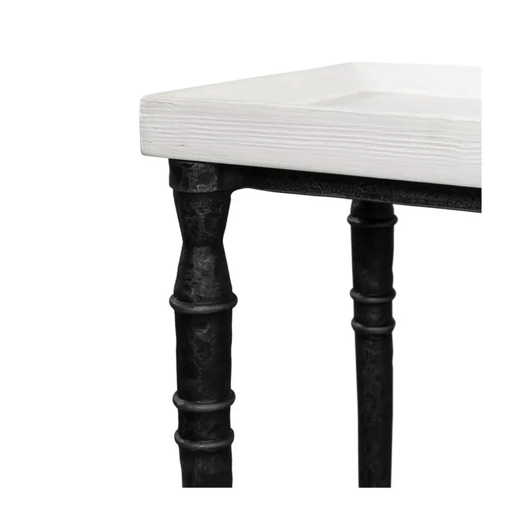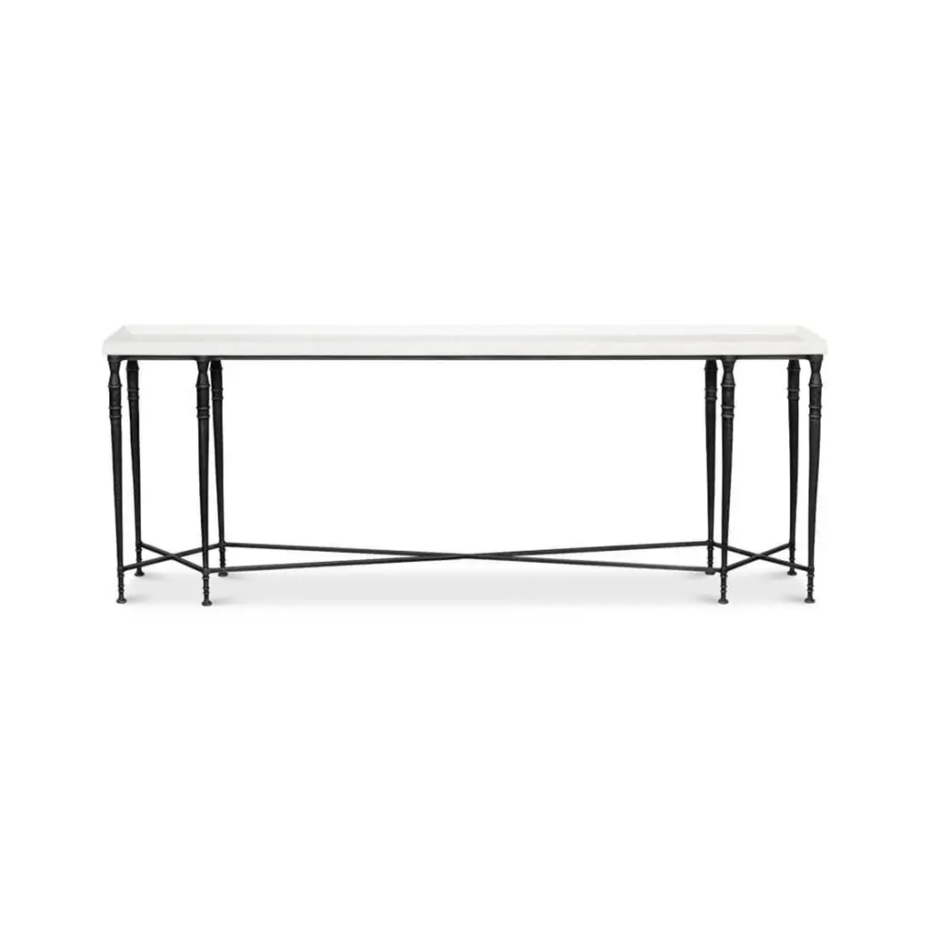 This table features a smooth, off-white wooden tabletop that sits atop a slender black iron frame. The eight iron legs boast subtle ornamental accents that hark back to traditional craftsmanship, while the overall simplicity of the design anchors it firmly in the contemporary.This piece is a versatile addition to any home, serving as a refined stage in your entryway, behind a sofa, or in a hallway. It provides a perfect balance of function and style, adding a touch of sophistication without overwhelming the space.Dimensions: 80" W x 12" D x 30" H