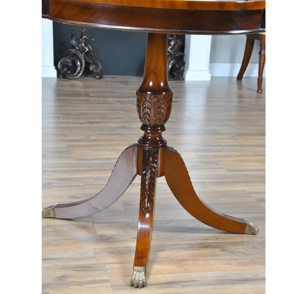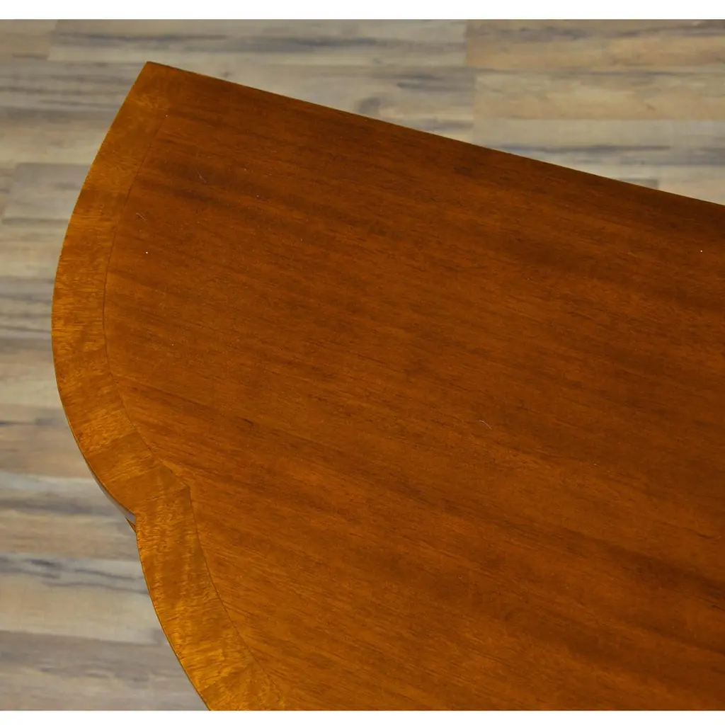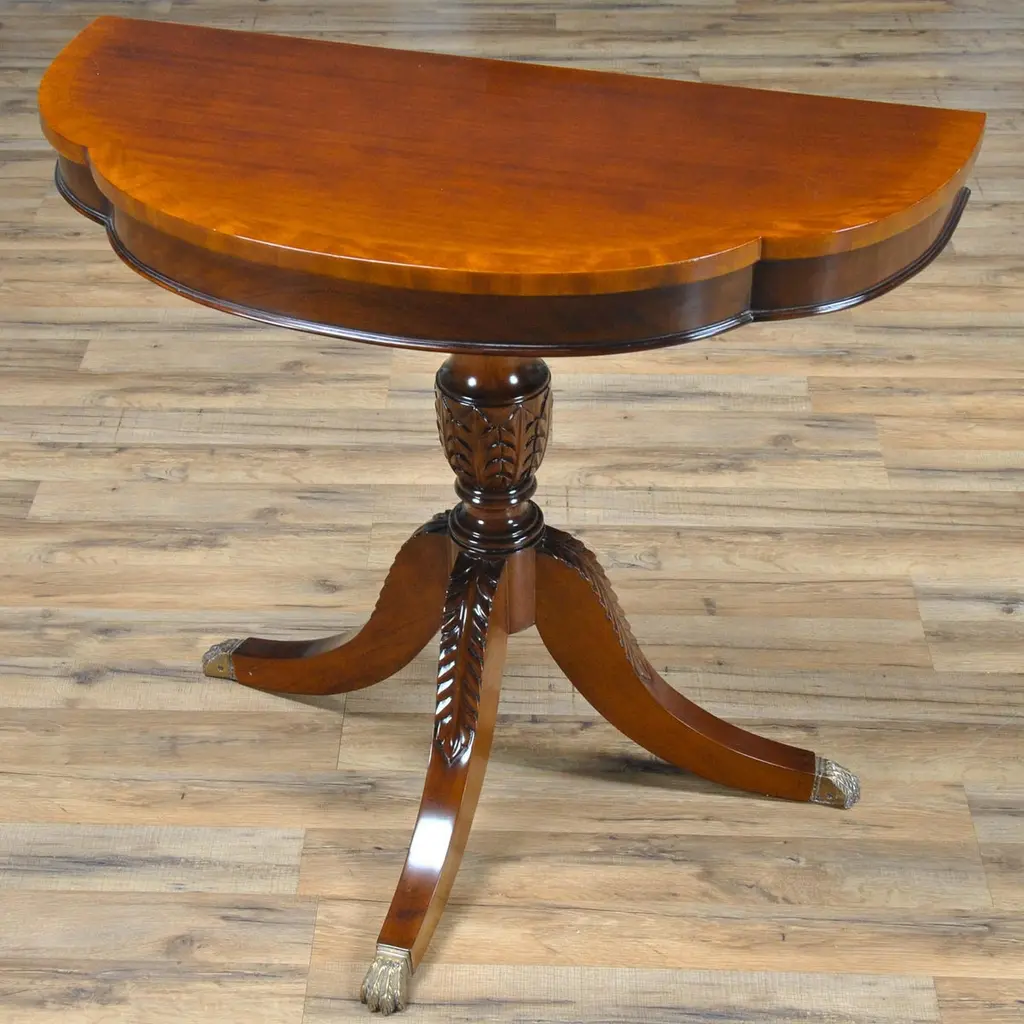 This high quality, antique reproduction Large Duncan Phyfe Console is very similar to our best selling model the NOC043 Console, please see the related products link at the bottom of this page for details. This console is just slightly larger and beefier to help fill larger spaces. The shaped mahogany top with satinwood banding is fastened on a central column with three hand carved legs sweeping out towards the brass capped feet. Hand carved solid mahogany base and legs.Measures 33″w x 16″d x 30″h metric 84 41 76