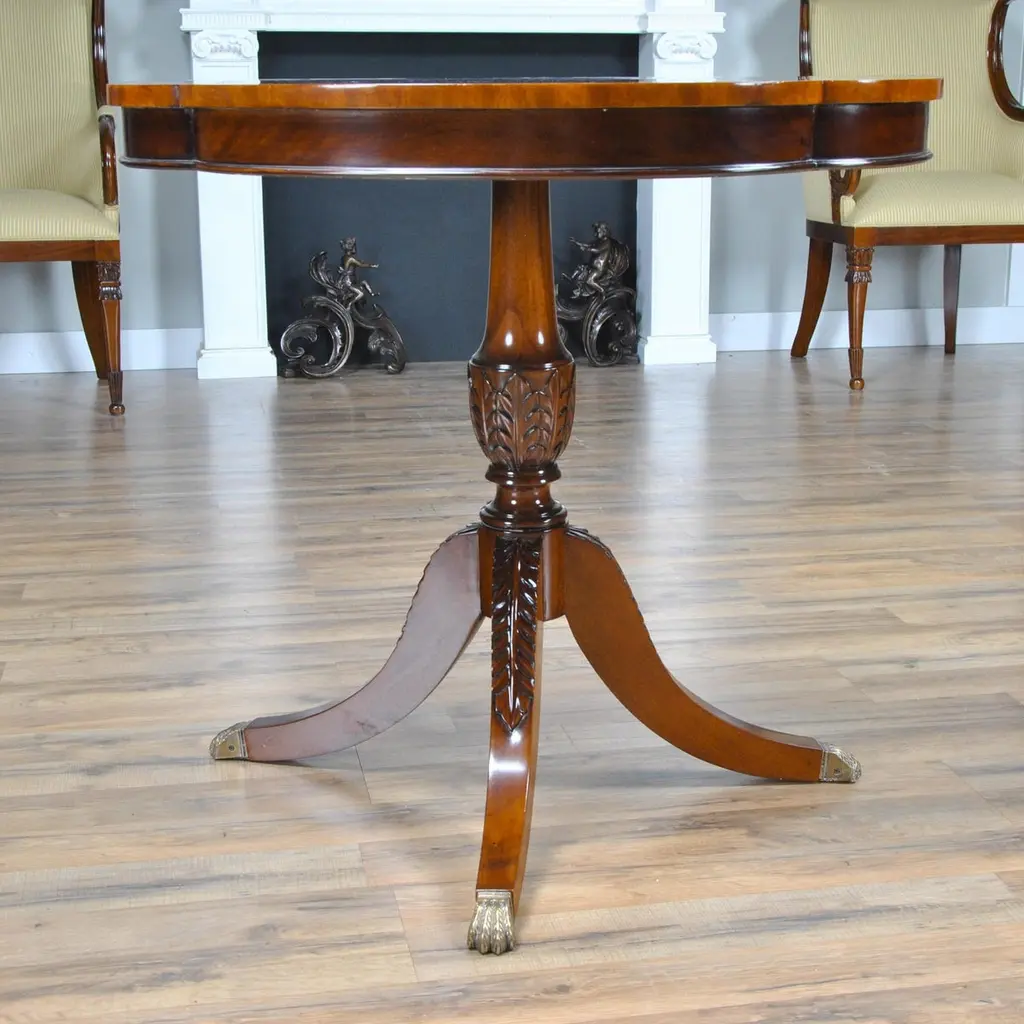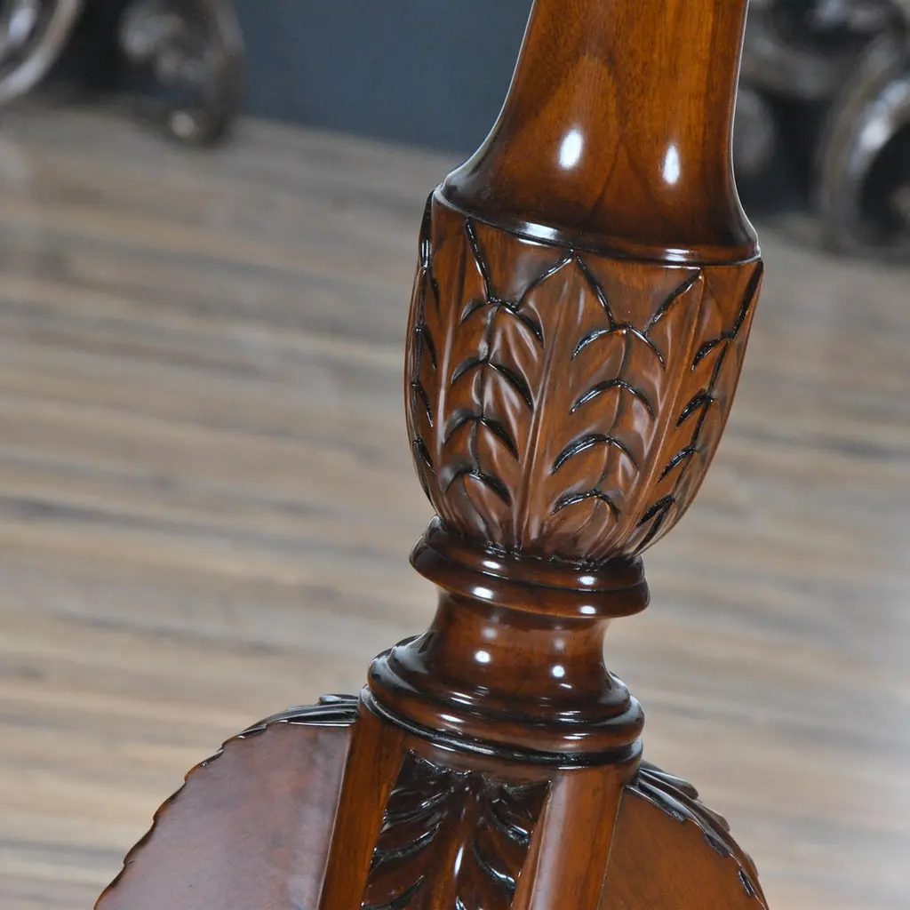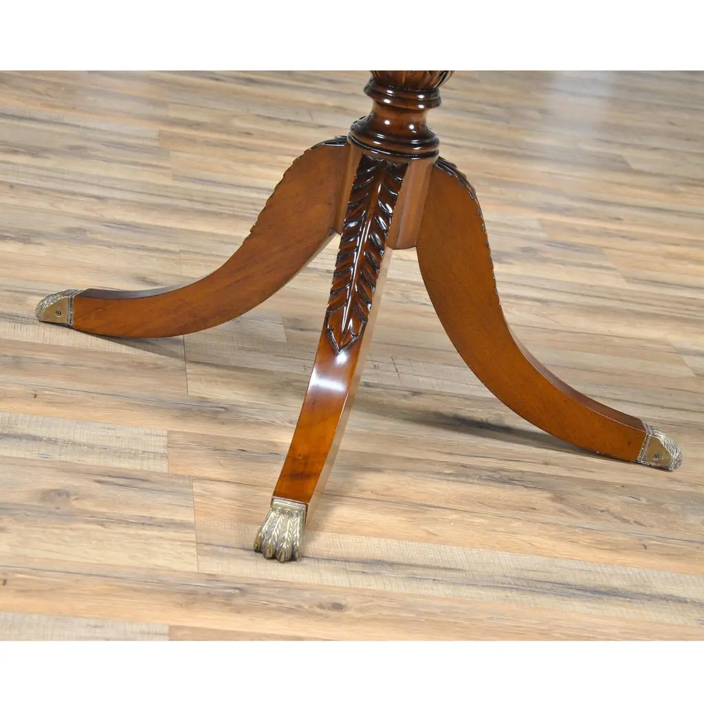 This high quality, antique reproduction Large Duncan Phyfe Console is very similar to our best selling model the NOC043 Console, please see the related products link at the bottom of this page for details. This console is just slightly larger and beefier to help fill larger spaces. The shaped mahogany top with satinwood banding is fastened on a central column with three hand carved legs sweeping out towards the brass capped feet. Hand carved solid mahogany base and legs.Measures 33″w x 16″d x 30″h metric 84 41 76