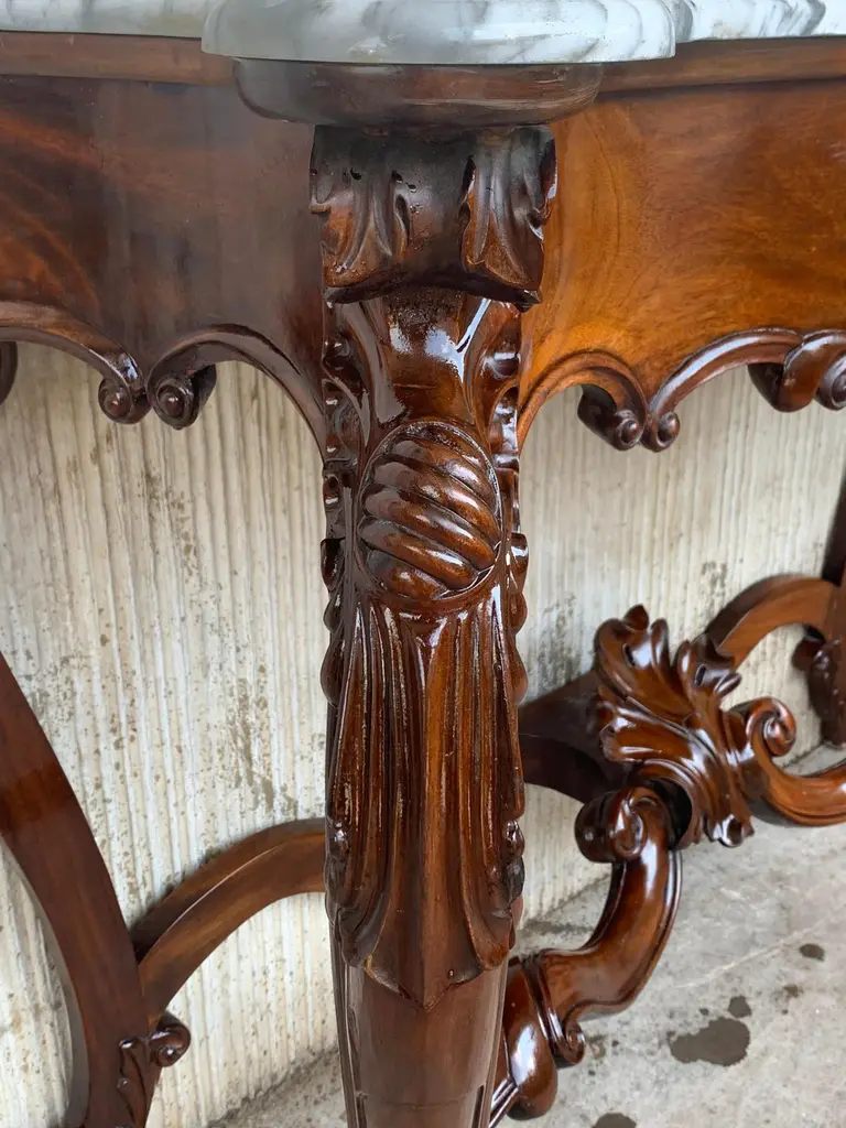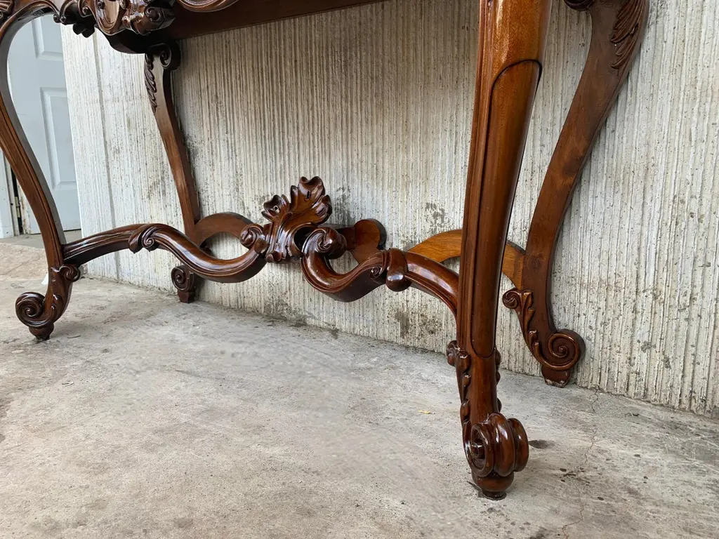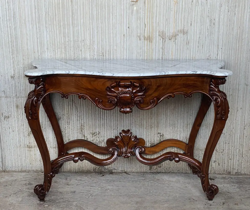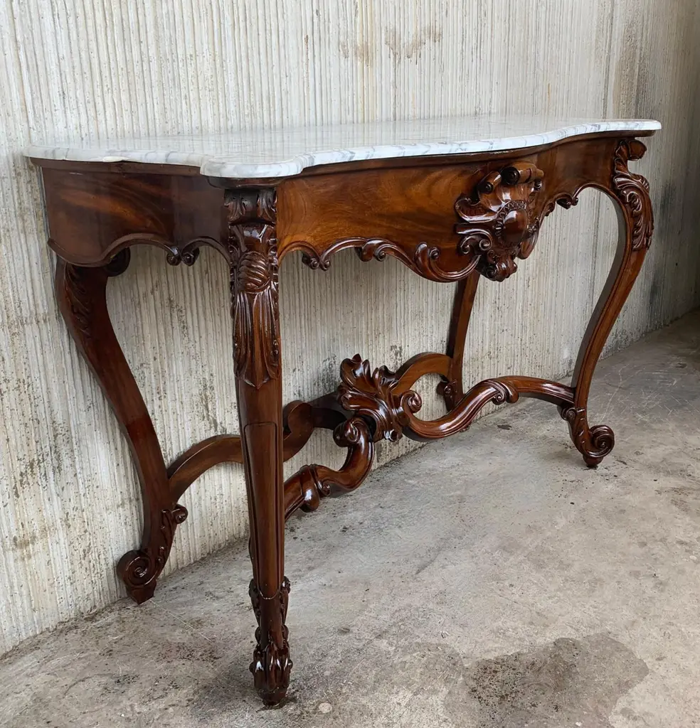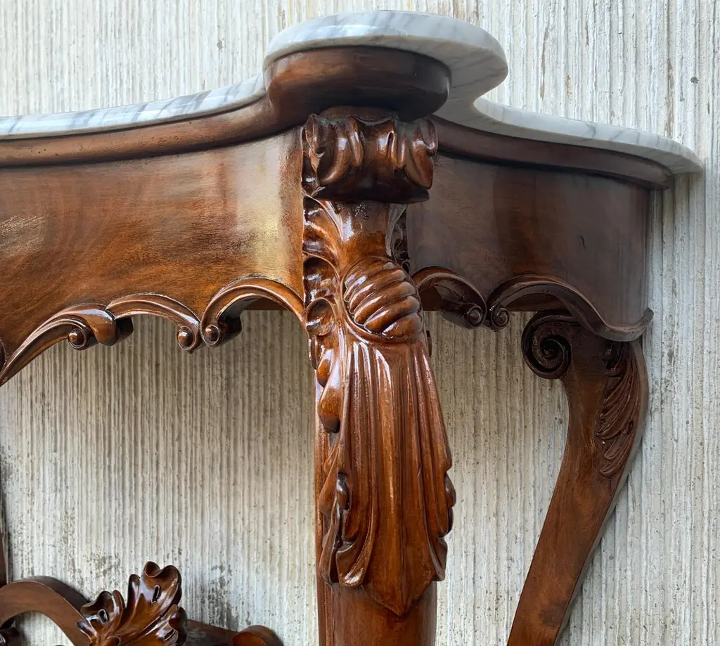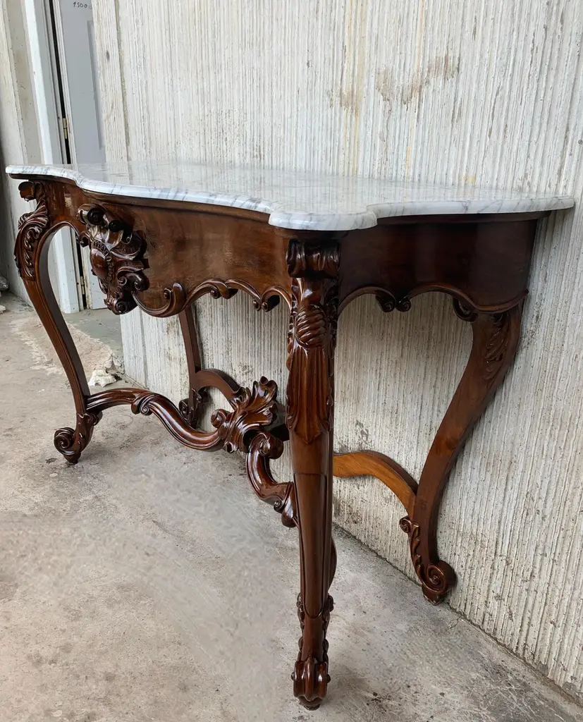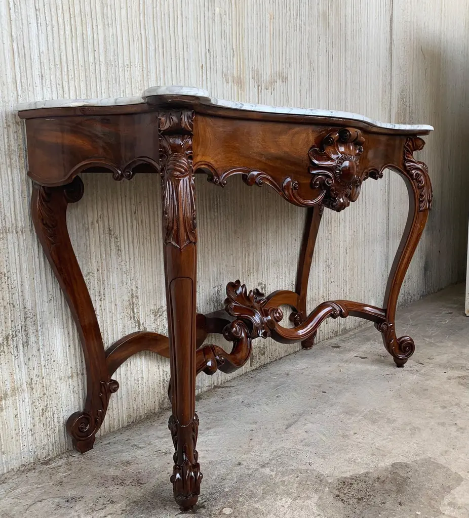 19th French Regency carved walnut console table with marble top19th century French Regence style beautifully carved with leaves walnut console. White marble top with carved front, over hand-carved frieze supported by four cabriole legs connected by X-form stretchers centered by large urn. Very massive and stabile console in very good condition.We have two pieces available.