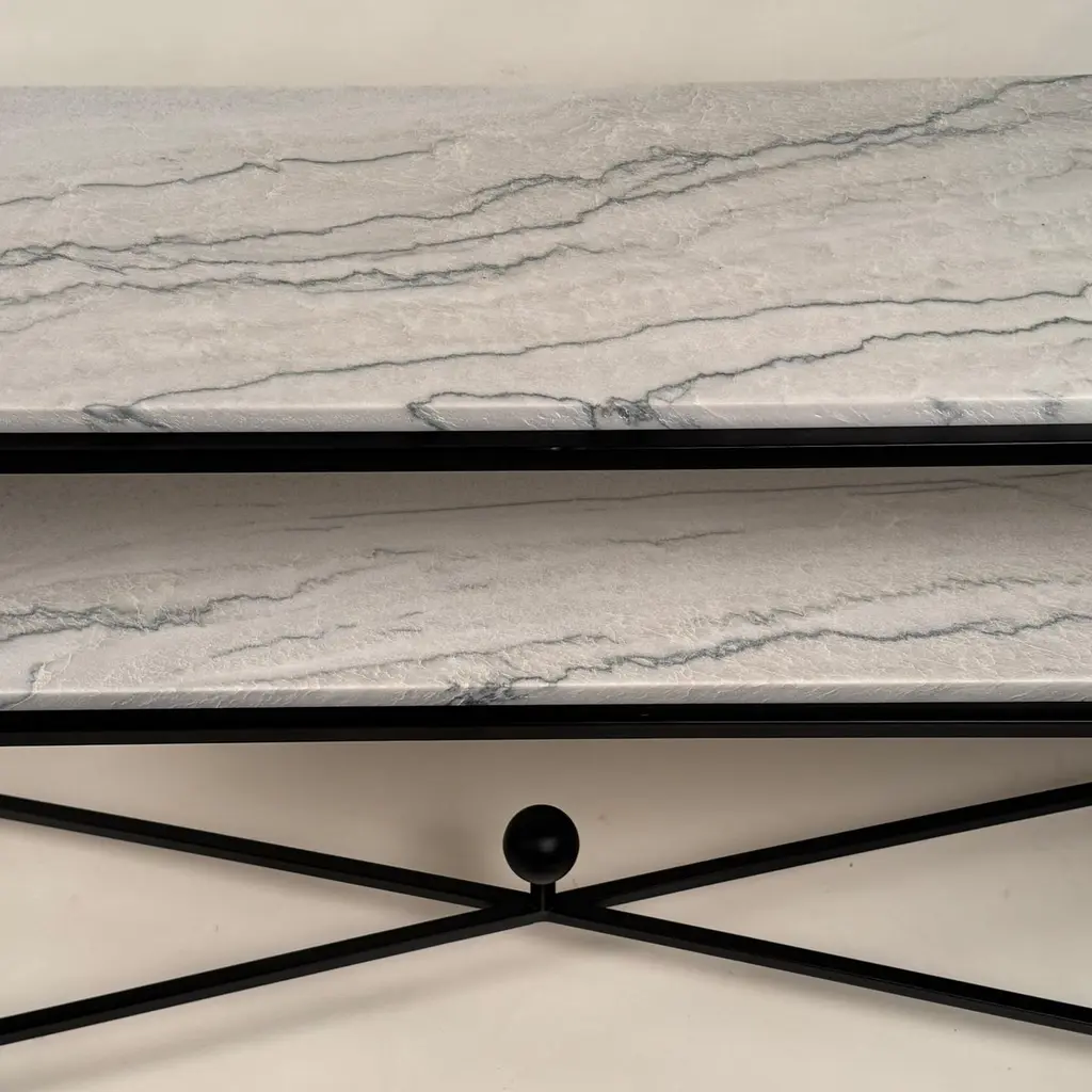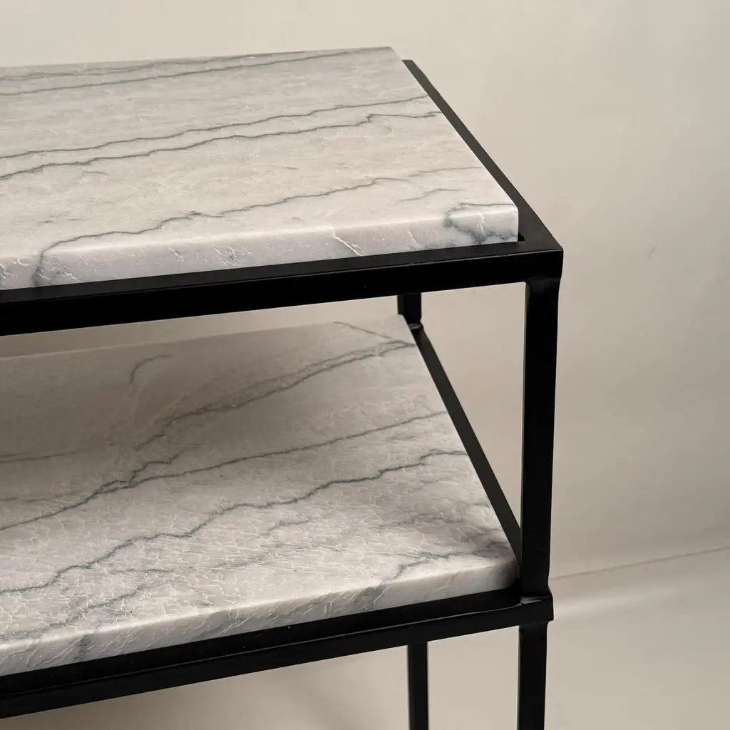 Large two-shelf console table in gorgeous Macaubas stone from Brazil.Please note that stone is a natural material so slab color and veining may vary.Please consult of FAQ page for more information in DESIGN FRÈRES line orders. Thank you.