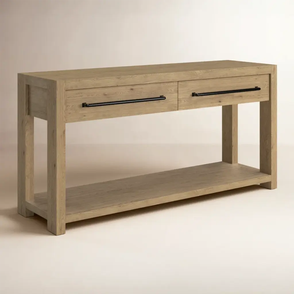 This sideboard combines classic design with practical storage for your living room or hallway. Made from solid and engineered wood, it has a pale oak finish that highlights the natural grain. The rectangular top and sturdy base support two smooth-gliding drawers with dovetail joinery, while a lower shelf adds extra storage or display space. Sleek black metal pulls add a subtle industrial touch, making this piece both stylish and functional.