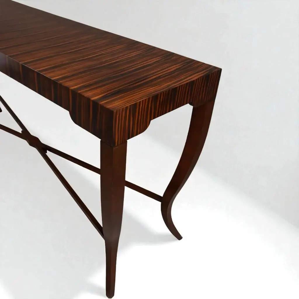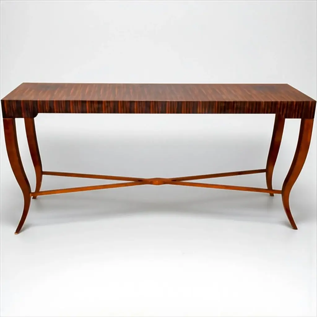 This is a striking organic modern exotic kingwood console table with clean lines. There are two available. It has a nicely carved cross stretcher and sloping legs. They are unmarked and in very good condition.