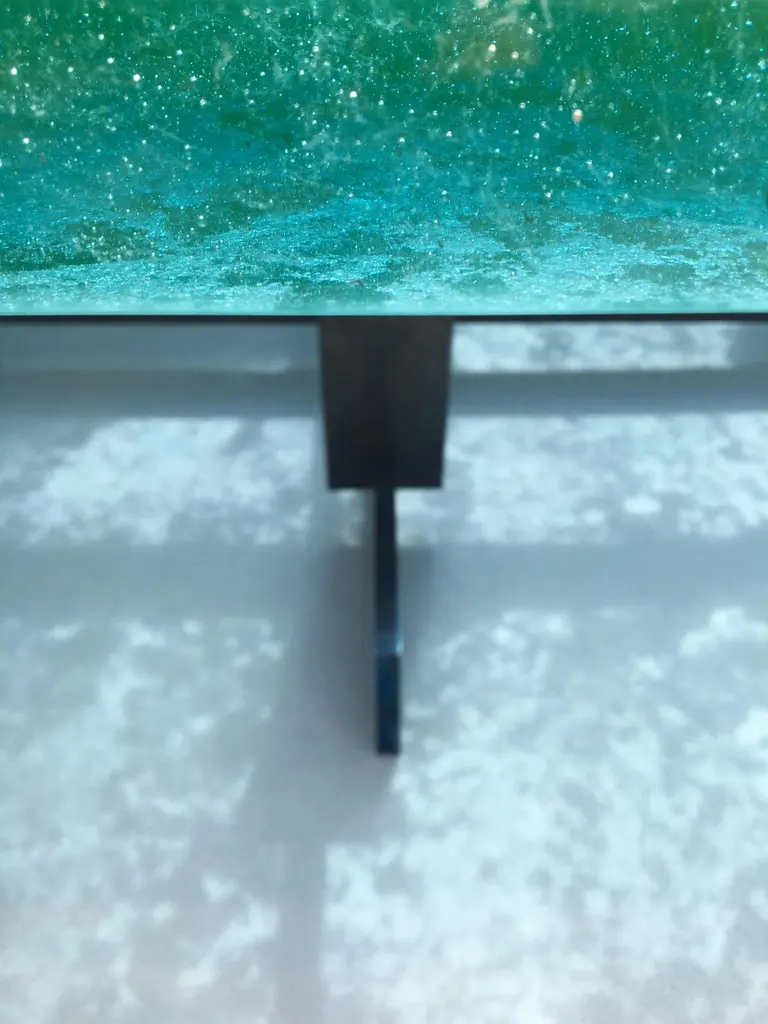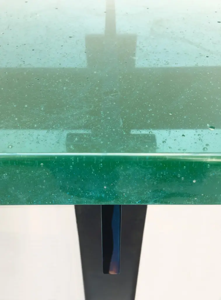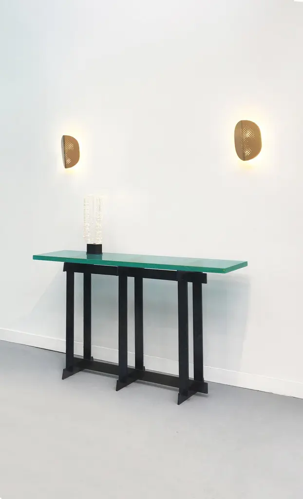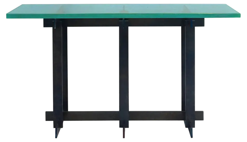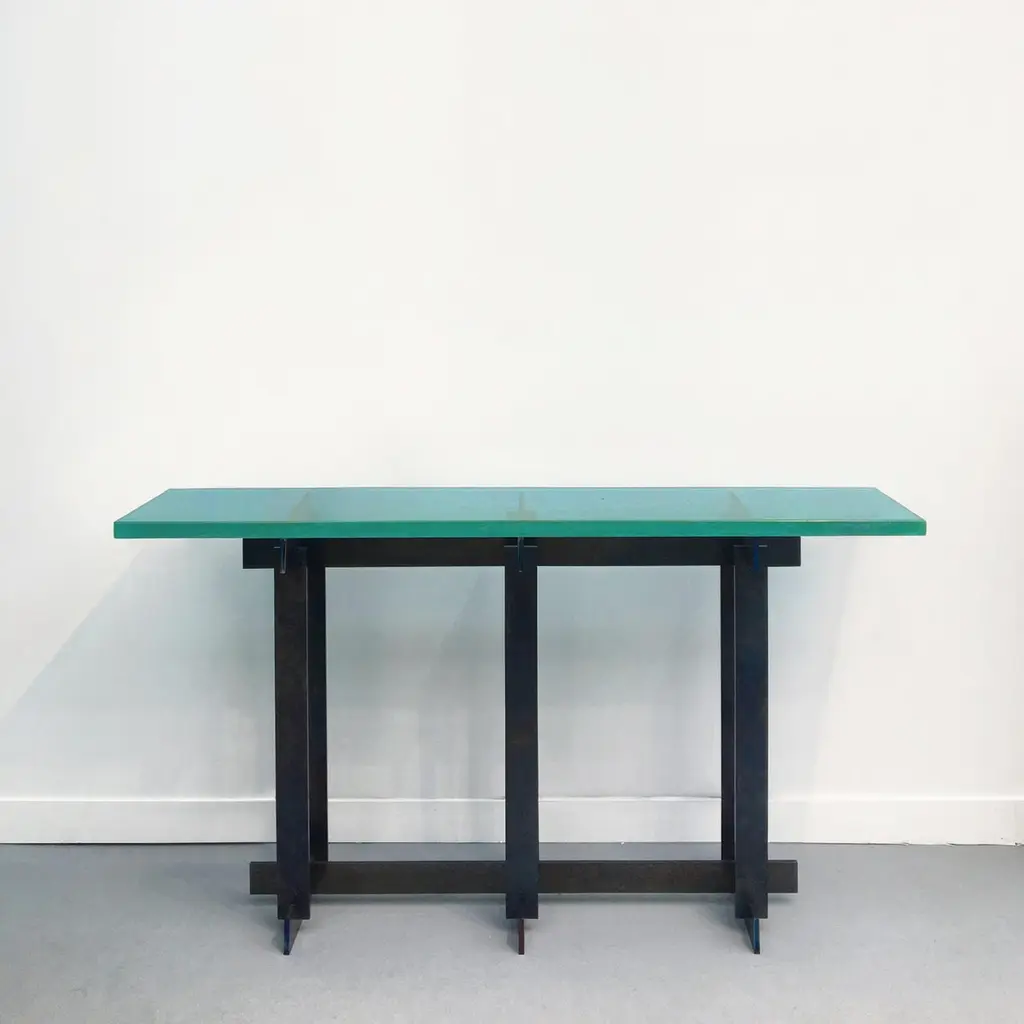 Lava console by SB26Dimensions: W 160, D 40, H 92 cmMaterials: Thick glass top, hot-rolled mid-iron steel.Lava console emphasizes the work of the Material, in a Brutalist expression, with its 35 mm thick glass top, and its architectural structure in hot-rolled mid-iron steel.Lava is also available in its low table version.Finishes: Blue textured steel, dichroic glass paste top, colored in the mass of which the latter is loaded with bubbles inside the Material (different possible colors, except red for technical reasons).SB26 is the brand created in 2018 by the designer Samuel Accoceberry and the blacksmith Bruce Cecere. This birth originates in the desire of Bruce Cecere to design and present an exceptional object during a program of co-creation Craftsman / Designer.For this, he chooses Samuel Accoceberry, renowned designer not only for his collaborations with major brands but also for his concern to promote the great know-how and their authors. Together, they explored the limits of metal work, such as goldsmiths, to create the line of luminaires Moon which one of the pieces was presented at the Milan Salon in 2018.To continue their collaboration and develop new projects, they create their joint signature SB26 (Samuel Accoceberry & Bruce Cecere Studio).