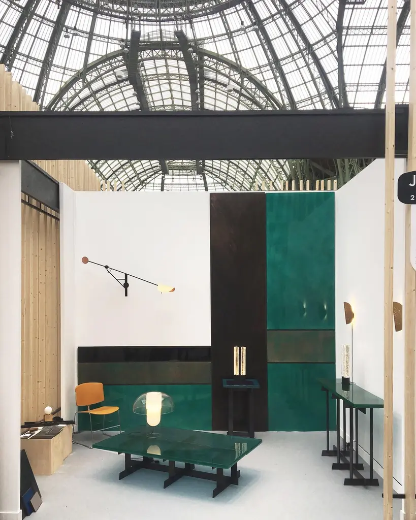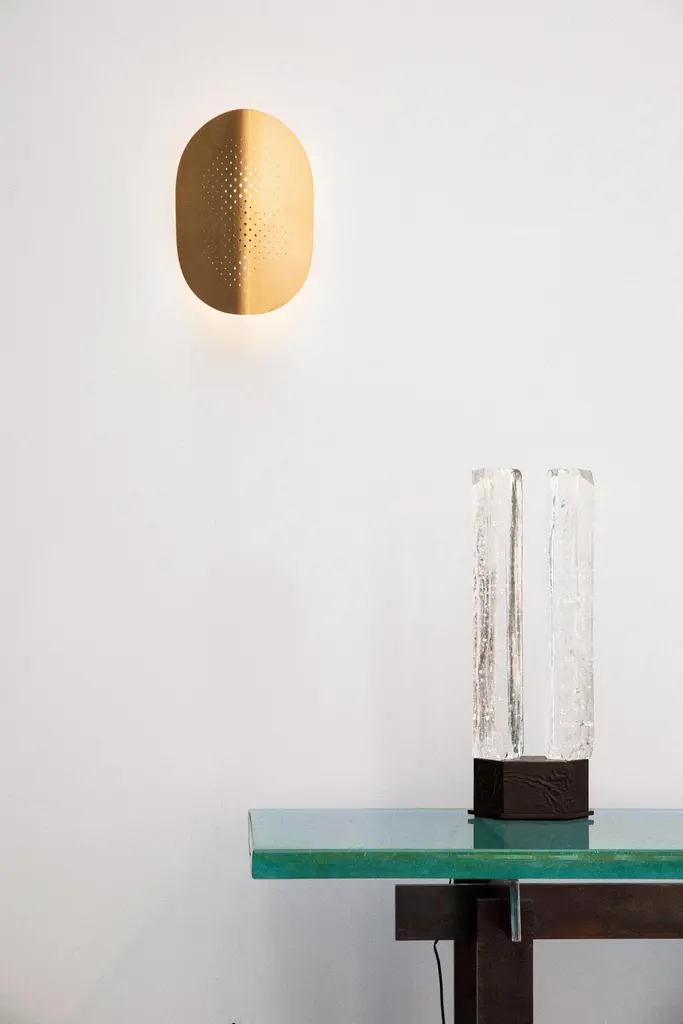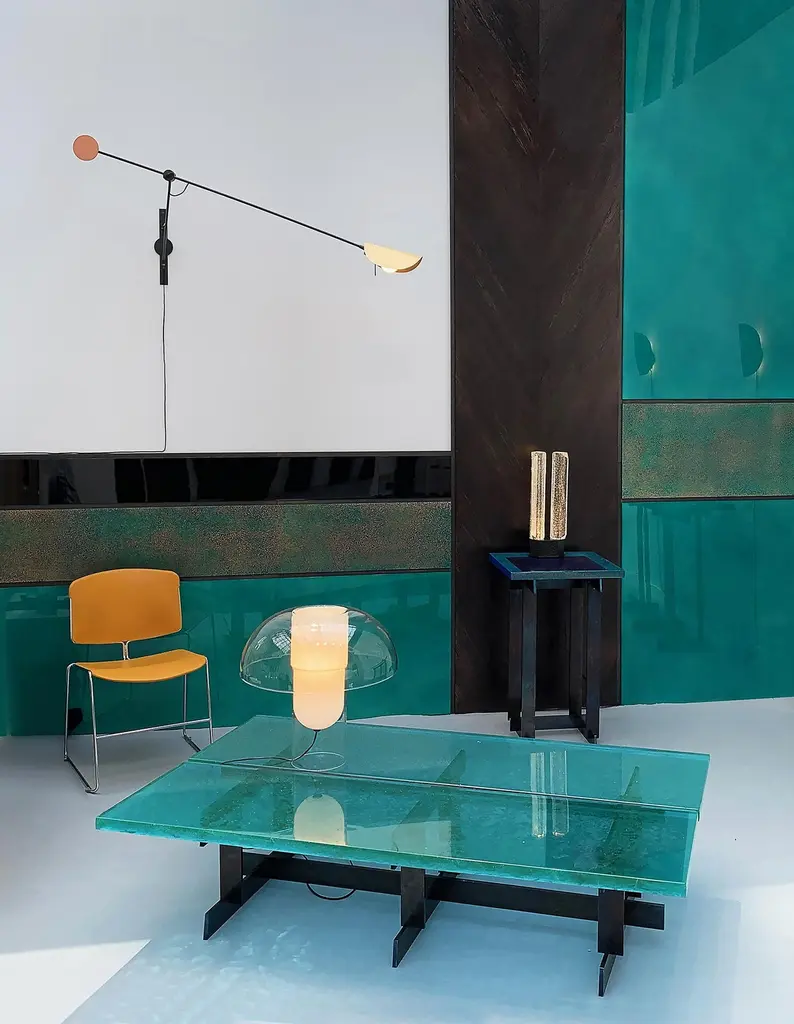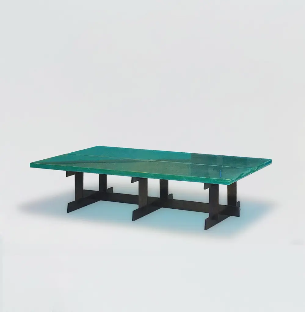Lava console by SB26Dimensions: W 160, D 40, H 92 cmMaterials: Thick glass top, hot-rolled mid-iron steel.Lava console emphasizes the work of the Material, in a Brutalist expression, with its 35 mm thick glass top, and its architectural structure in hot-rolled mid-iron steel.Lava is also available in its low table version.Finishes: Blue textured steel, dichroic glass paste top, colored in the mass of which the latter is loaded with bubbles inside the Material (different possible colors, except red for technical reasons).SB26 is the brand created in 2018 by the designer Samuel Accoceberry and the blacksmith Bruce Cecere. This birth originates in the desire of Bruce Cecere to design and present an exceptional object during a program of co-creation Craftsman / Designer.For this, he chooses Samuel Accoceberry, renowned designer not only for his collaborations with major brands but also for his concern to promote the great know-how and their authors. Together, they explored the limits of metal work, such as goldsmiths, to create the line of luminaires Moon which one of the pieces was presented at the Milan Salon in 2018.To continue their collaboration and develop new projects, they create their joint signature SB26 (Samuel Accoceberry & Bruce Cecere Studio).