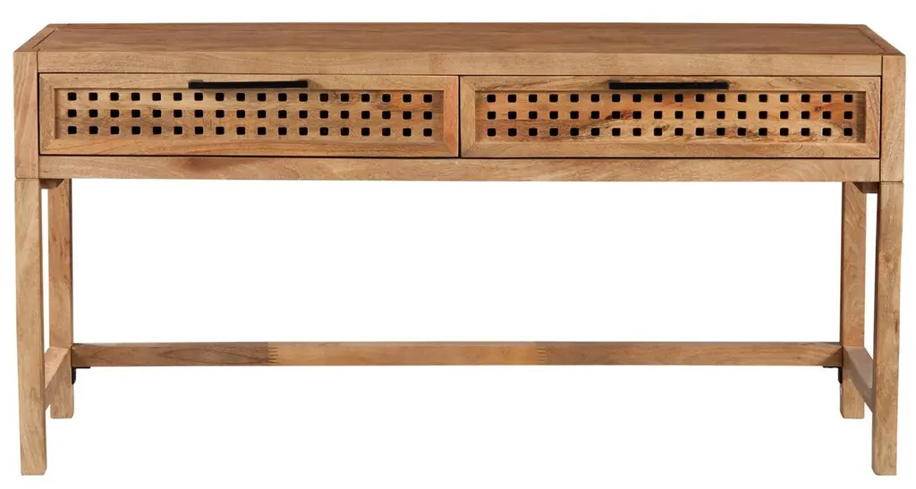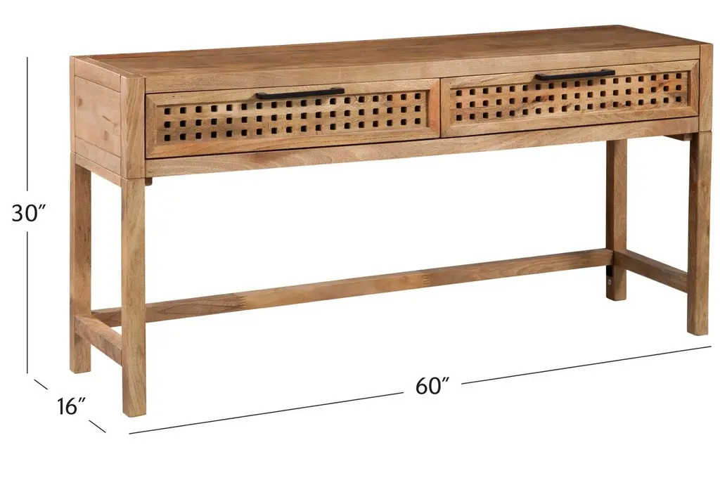 The Lazuli Console Table features modern Bohemian styling with an industrial flair. It includes two drawers accented with open pierced fretwork detailing and iron bar pull hardware. Constructed with mango wood, this console table is a product of nature and is completely unique. The natural material is subject to variations in characteristics such as color, density, grain, and finishing.