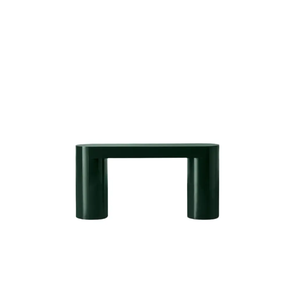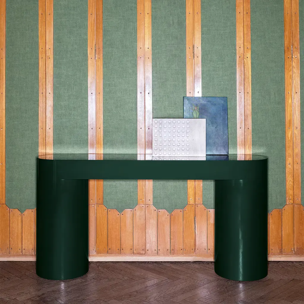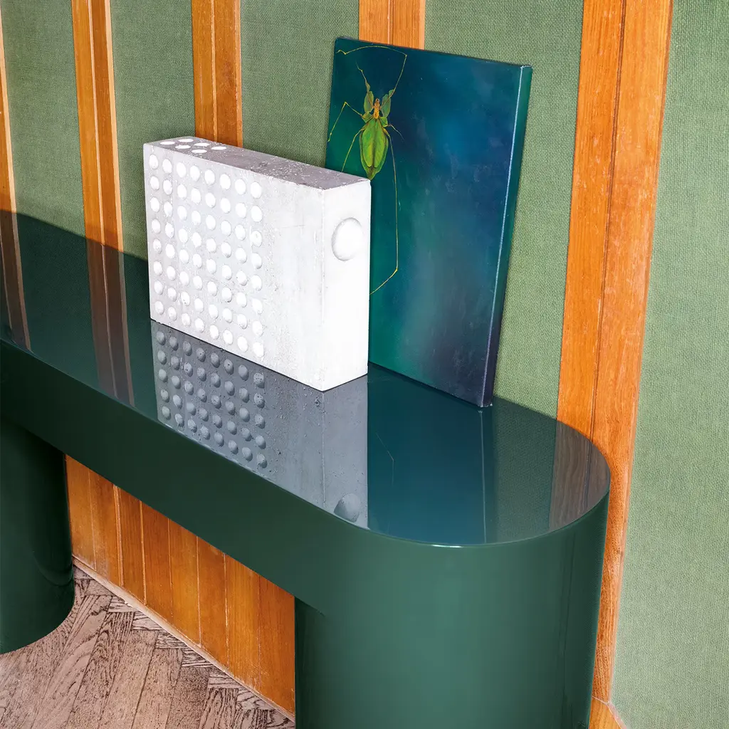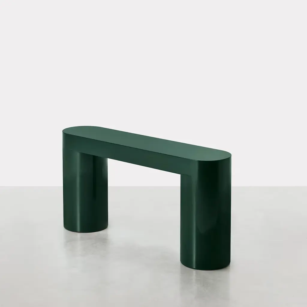 The console table plays on the subtle balance between exaggerated volumes. The rigor of the forms is softened by the insistent roundness of the legs, their dimensions contrasting the reduced thickness of the top. The piece, as a whole, takes on a playful and contemporary appearance. Monolithic structure composed of curved plywood and MDF. Dark green high gloss polyester lacquered finish. More lacquered finishes are available, please contact the concierge for more information.