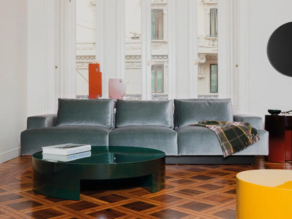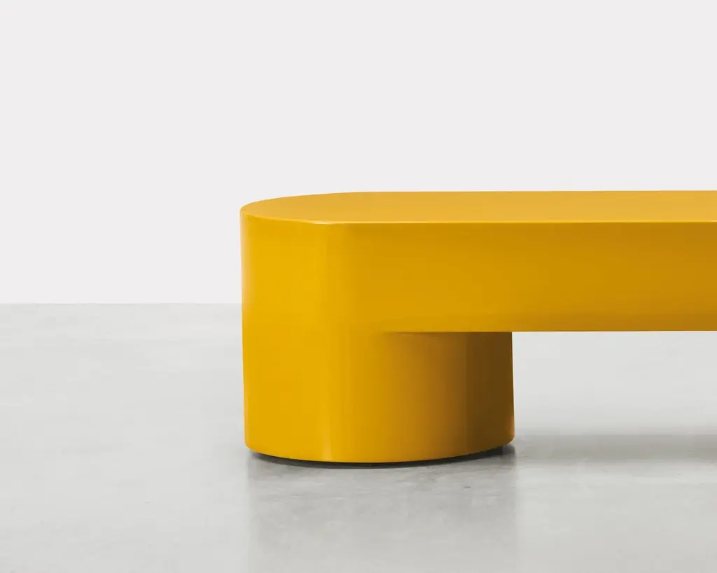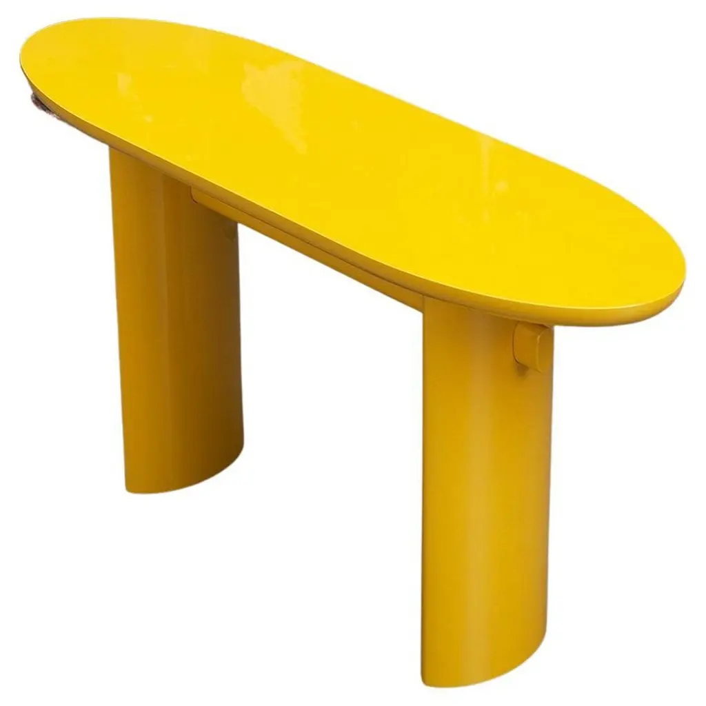 The exaggerated volumes of Lazy-O are the mantra of a series that includes a console table, side tables, anda bench. The vibrancy of the colors makes the simple, austere forms ironic and playful.Lightened mdf monolithic structure. Honey yellow lacquered polyester high gloss finish.More lacquered finishes are available as per sample book.The 100 gloss shiny polyester lacquers, with machine and manual brushing, are obtained thanks to a process that requires up to eight different paint coats. A range of colors specially designed for this collection is also available in matt finish.