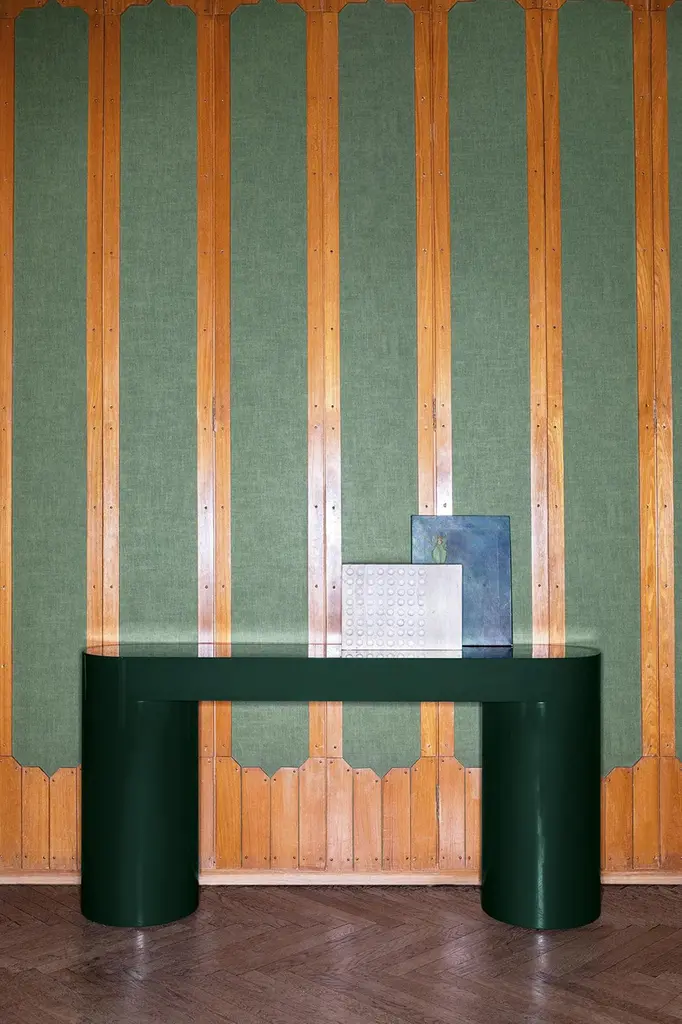 The console table plays on the subtle balance between exaggerated volumes. The rigor of the forms issoftened by the insistent roundness of the legs, their dimensions contrasting the reduced thickness of thetop. The piece, as a whole, takes on a playful and contemporary appearance.Monolithic structure composed of curved plywood and mdf. Dark green high glosspolyester lacquered finish.More lacquered finishes are available as per sample book.The 100 gloss shiny polyester lacquers, with machine and manual brushing, are obtained thanks to a process that requires up to eight different paint coats. A range of colors specially designed for this collection is also available in matt finish.