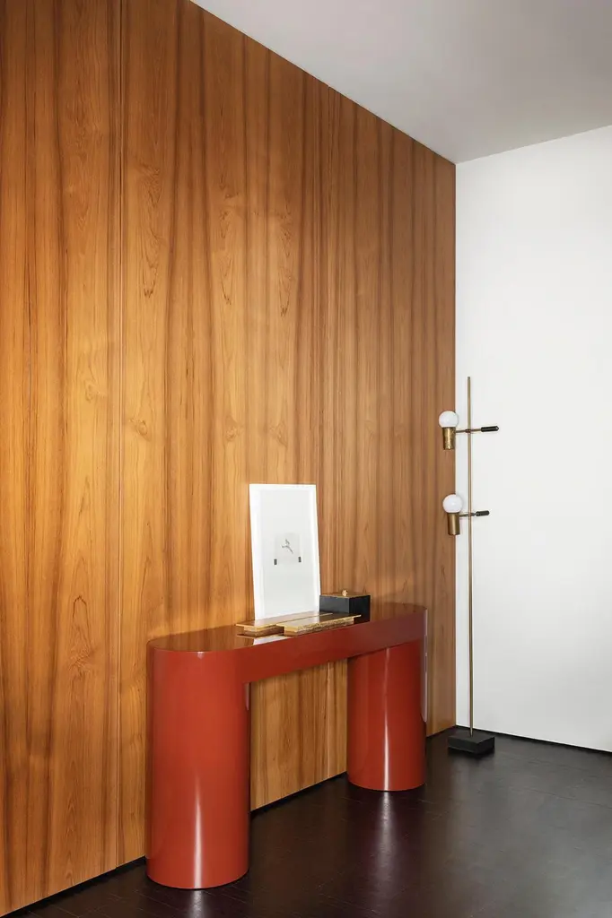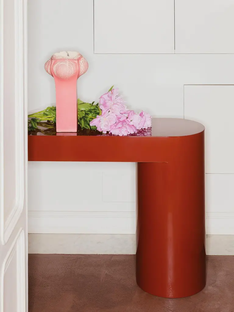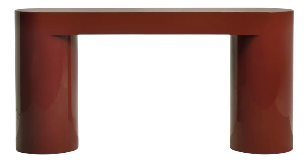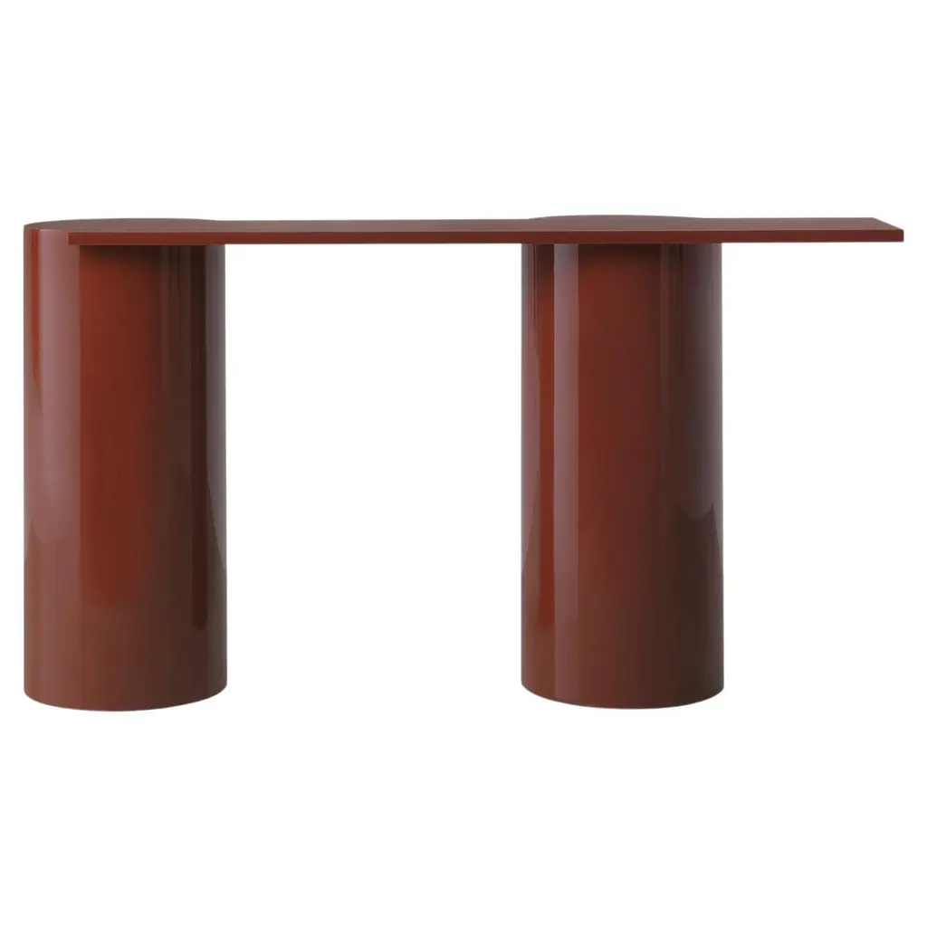The console table plays on the subtle balance between exaggerated volumes. The rigor of the forms issoftened by the insistent roundness of the legs, their dimensions contrasting the reduced thickness of thetop. The piece, as a whole, takes on a playful and contemporary appearance.Monolithic structure composed of curved plywood and mdf. Brown-red high gloss or Dark green high glosspolyester lacquered finish.More lacquered finishes are available as per sample book.The 100 gloss shiny polyester lacquers, with machine and manual brushing, are obtained thanks to a process that requires up to eight different paint coats. A range of colours specially designed for this collection is also available in matt finish.