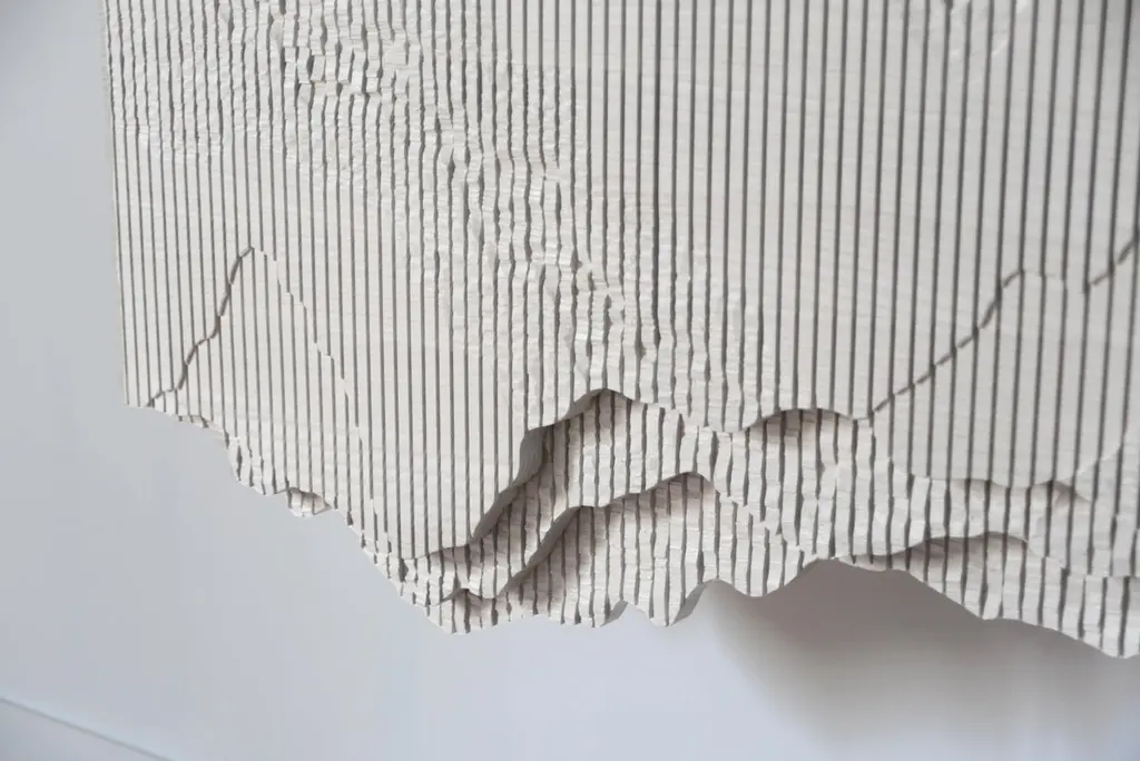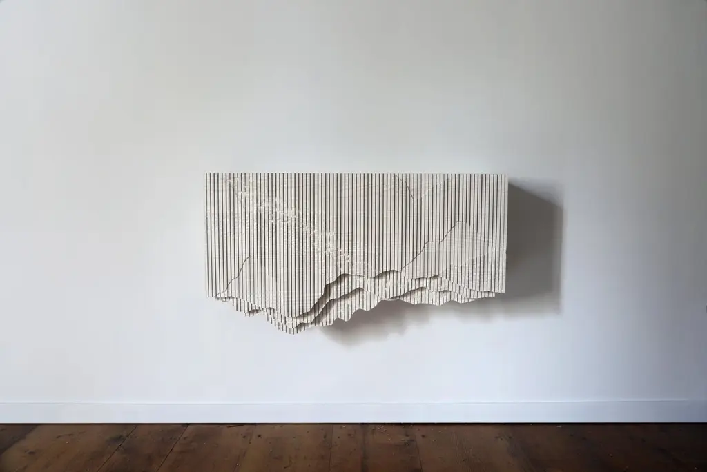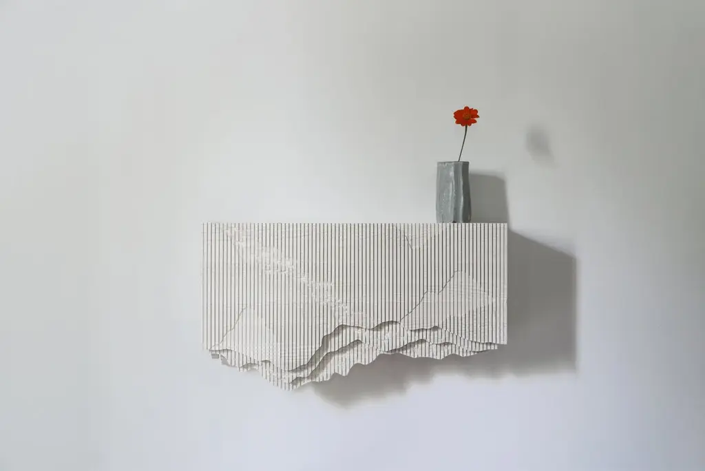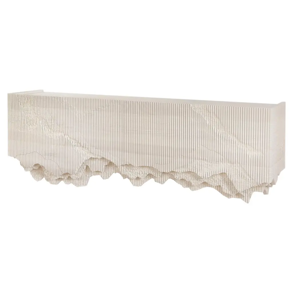 Ledge is a floating console, mounted to the wall, in solid ash with a black glass top. It stems from material exploration inspired by the cliffs around Johns’ studio, making solid ash reference crumbling stone through a unique technique. The wood components are scored across the grain, then carved by breaking the woods grain, to create patterns of variable depths, according to Johns’ sketch of the rock Formations outside. The facade of this piece wraps around to the sides, and the center opens up as two doors, to reveal a functional cabinet. The opaque black glass top nods to the mirror effects of water and contrasts with the minerality of the rest. Also available in black or grey finishes, in 60", 72", 84", 96" or custom versions . Due to the hand carved facade, no two pieces are quite the same.