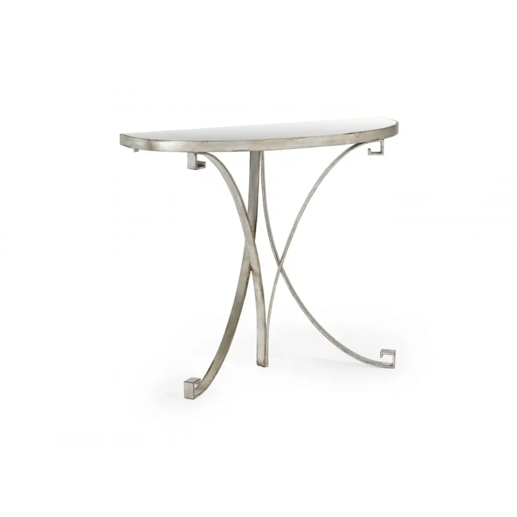 Leili Console Table creates a dramatic silhouette with its textural circle base in antique pewter and top that is wrapped in white linen and lightly washed in a silver.