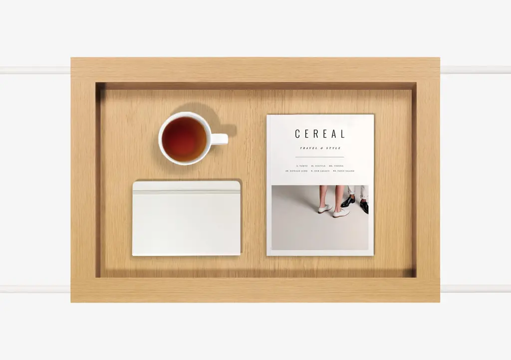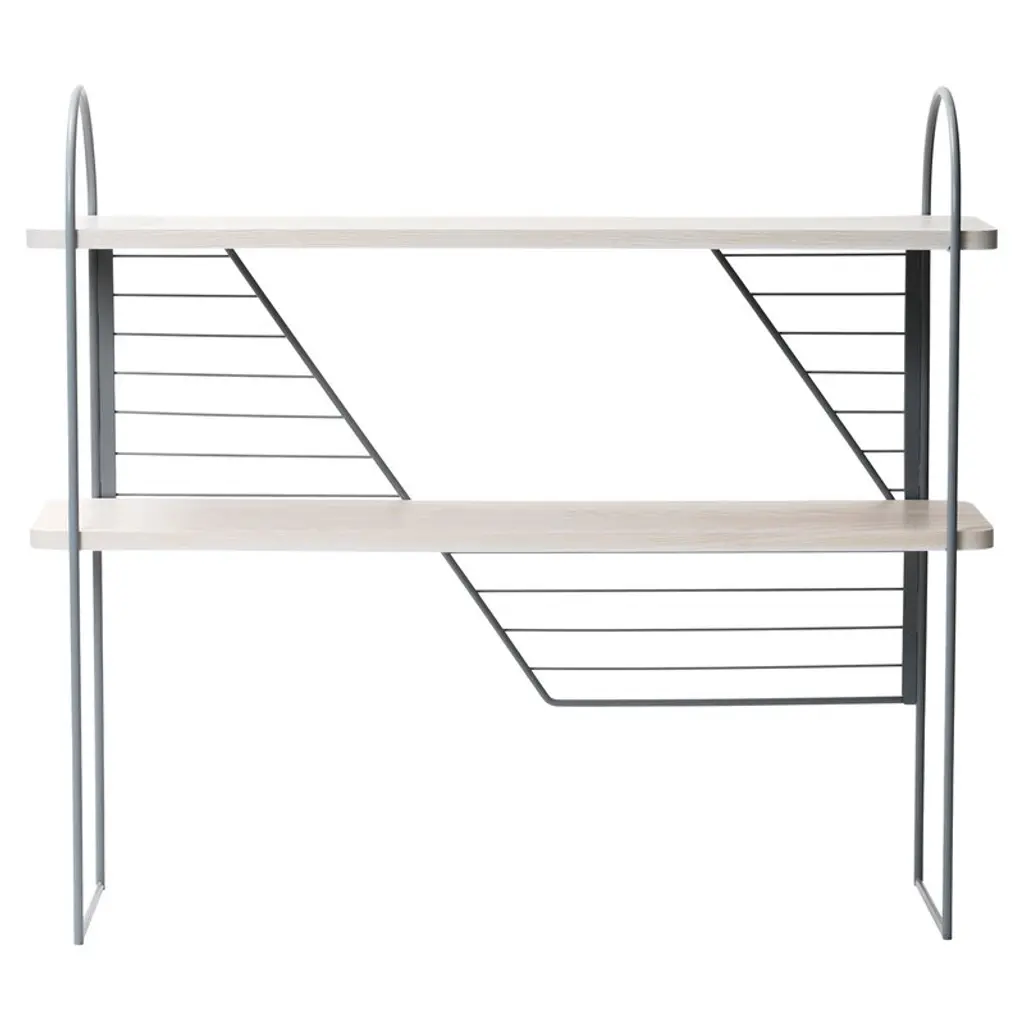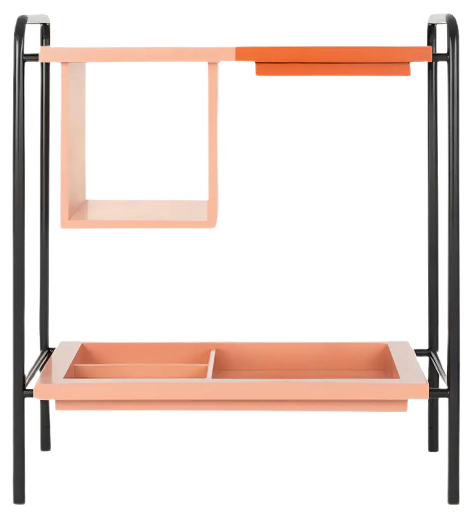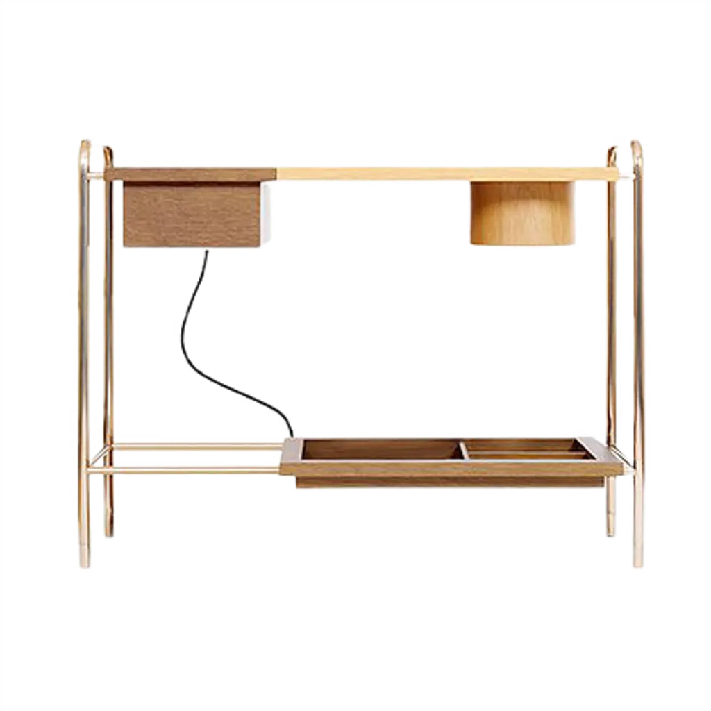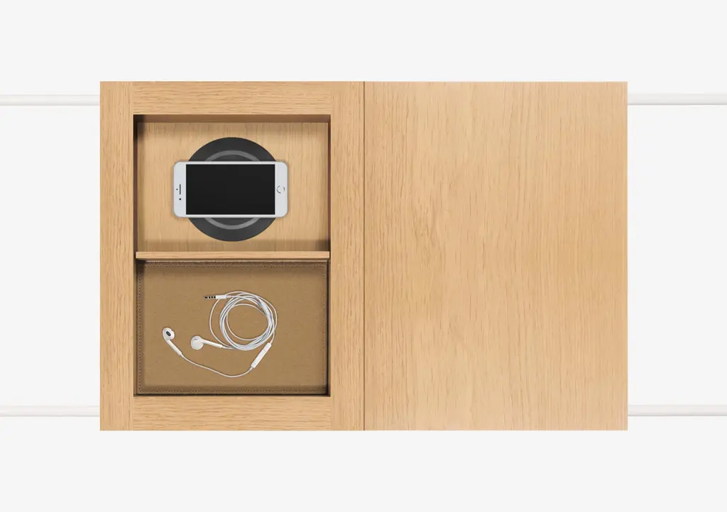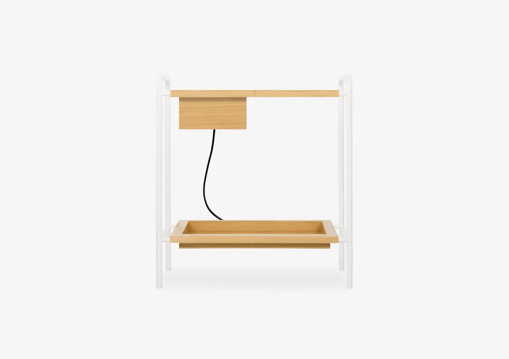 Console table composed of 1 lacquered steel structure with fixed feet and 3 tops in solid oak wood and MDF veneered with natural oak leaf. The Living tops have a recess that allows a simple fit into the structure and you can easily change the order of placement. This set includes: 1 Console structure with fixed feet - Lacquered steel - White 1 Charging box - Oak - Natural - Choose between 1 power strip with 1 socket + 2 USB chargers or wireless charger (15 watts of charging power) (schuko, british, or american sockets/plugs) 1 Small top - Oak - Natural 1 Large tray - Oak - Natural 1 Top Pad - Burel - Natural
