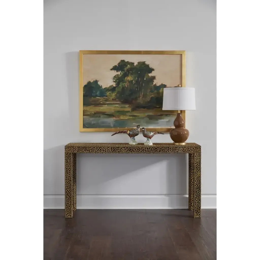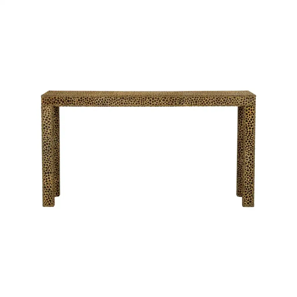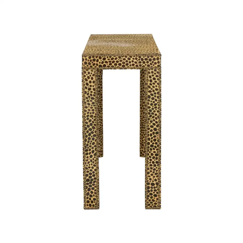Elevate your interior decor with the untamed glamour of the Leopard Console, where exotic luxury meets modern sophistication The clean lines and simple silhouette of the Parsons design provide a modern contrast to the exotic nature of the hair-on-hide, creating a harmonious balance between contemporary chic and untamed beauty. Whether placed in a foyer, living room, or hallway, this console instantly becomes the focal point of the room, commanding attention with its bold presence.