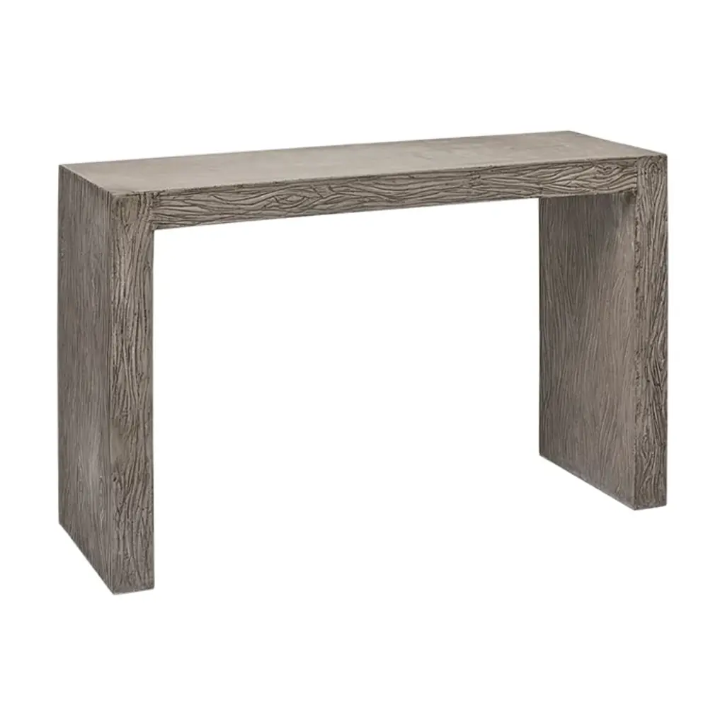 Simplicity + style come together to create this strong and durable console table. Its' dark gray finish is etched in faux bois, then waxed and oiled to perfection. A subtle statement piece for your entryway or patio. Built to withstand varied elements and temperatures.
