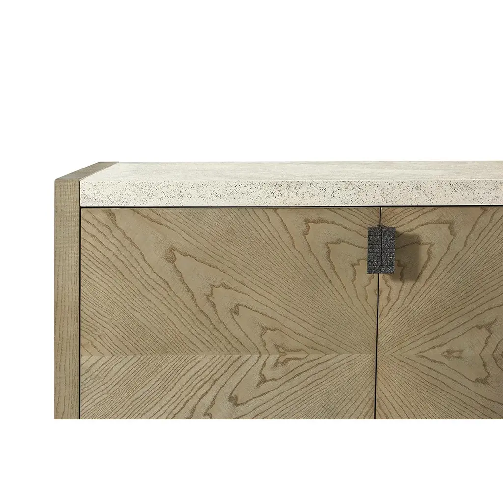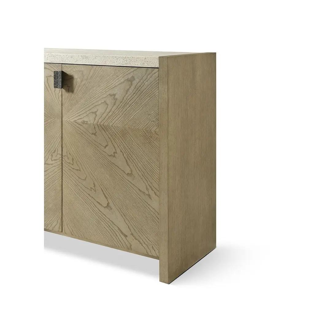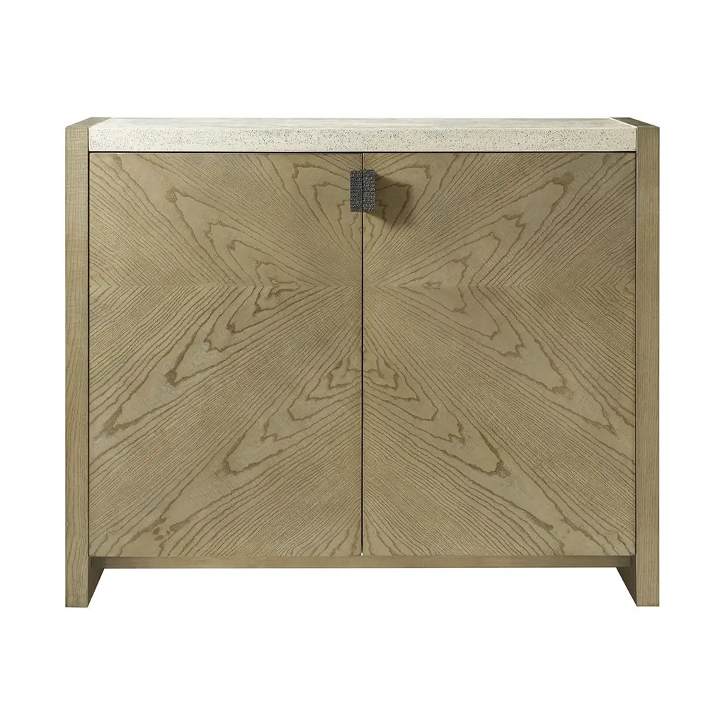 A two-door cabinet with cathedral ash in our light dune finish. Completed with textured metal pulls in our new Ember finish and a stone-like porous top in our exclusive Mineral finish. Includes an adjustable shelf.Dimensions: 46"W x 19" D x 38" H