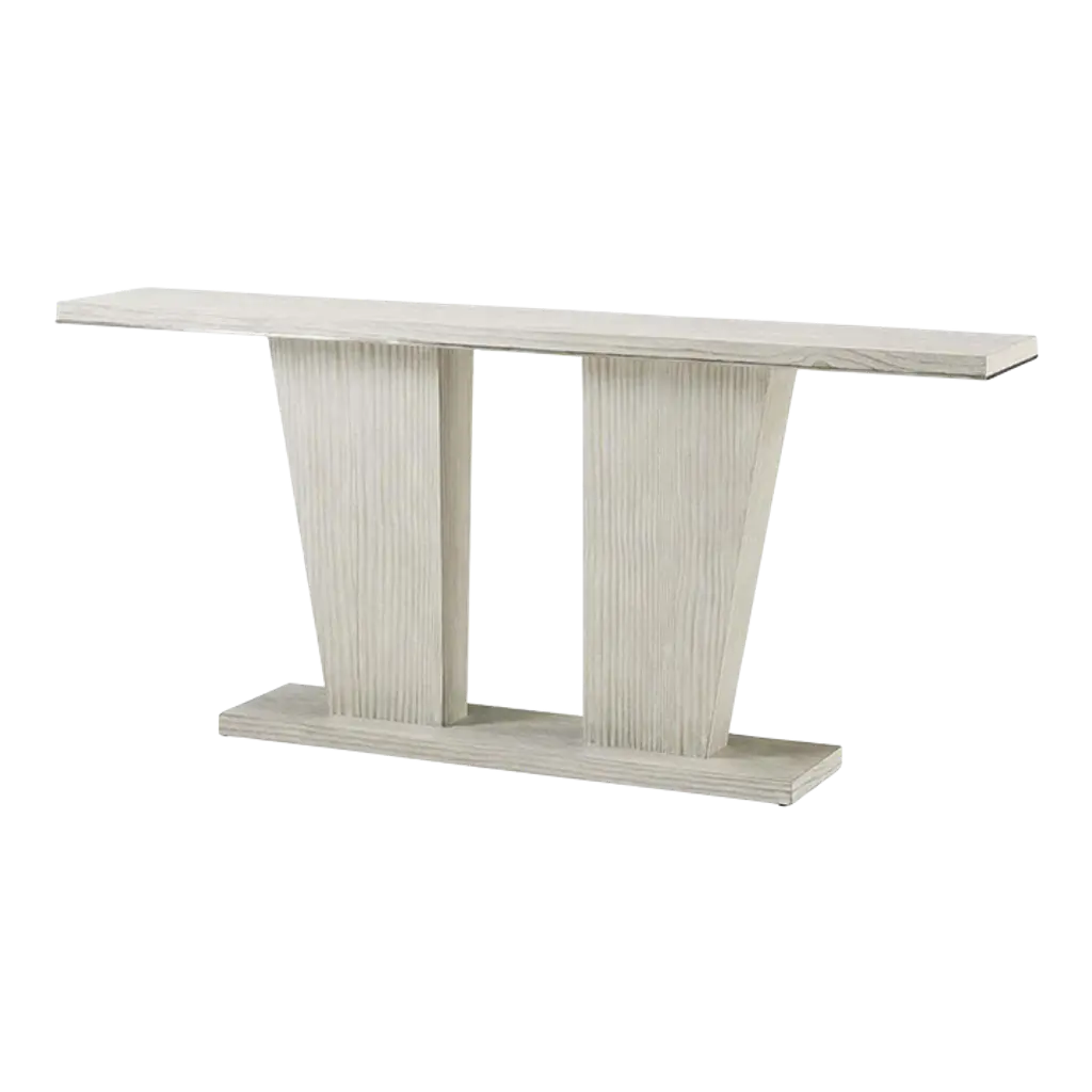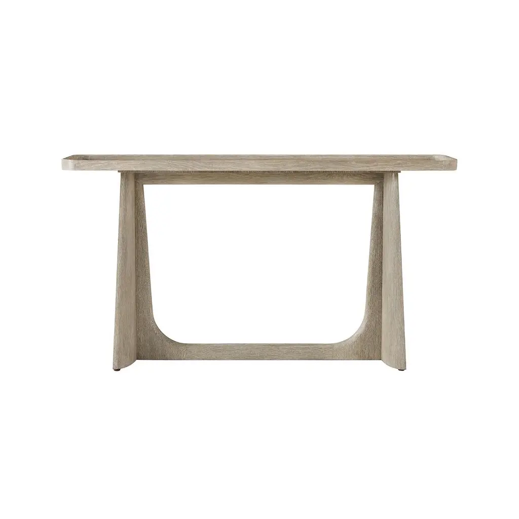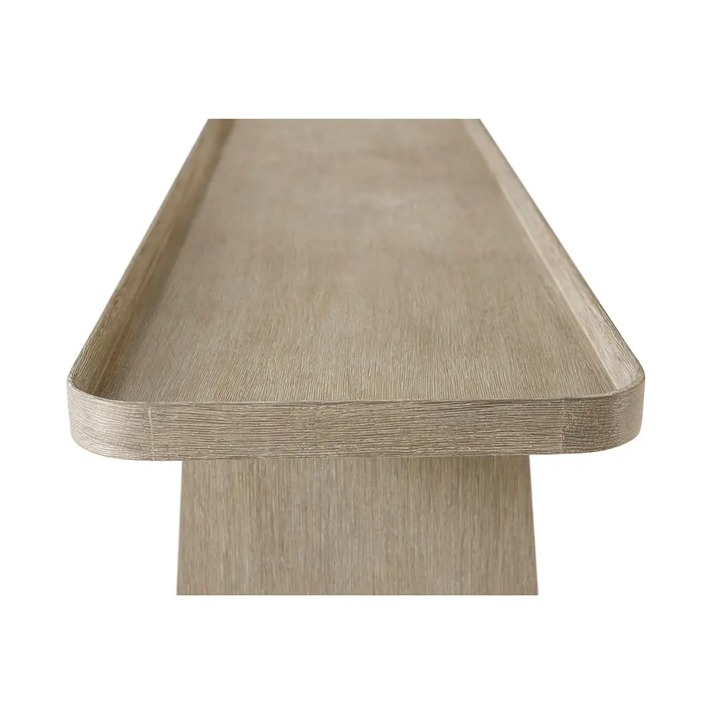 Featuring a wire-brushed white oak in our light grey oak finish. With deep dish galleried top raised on trapezoidal form trestle ends with a stretcher.Dimensions: 60" W x 16" D x 32" HShown in Grey Oak Finish