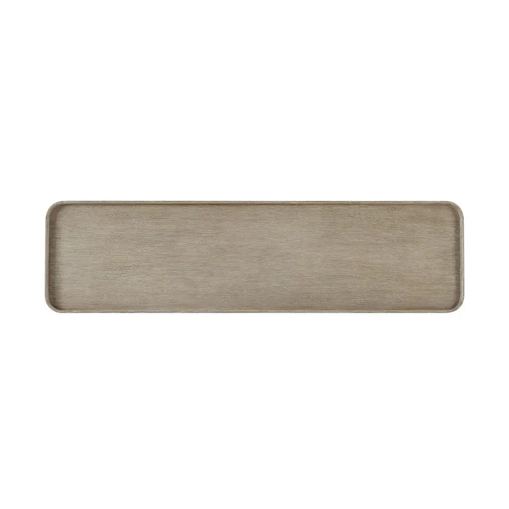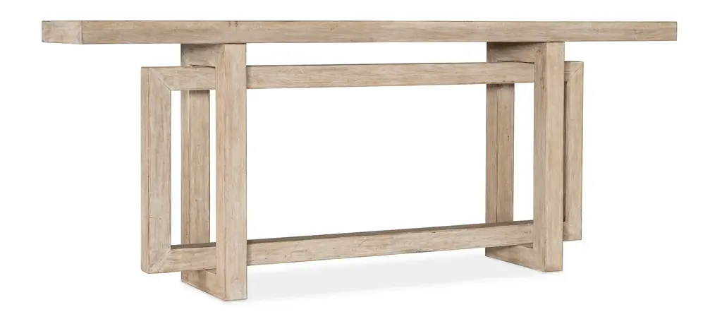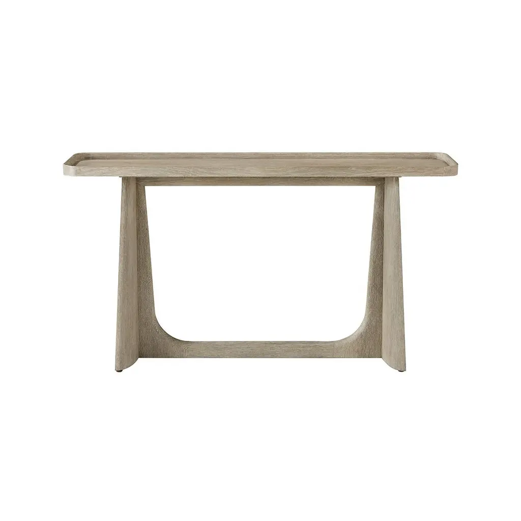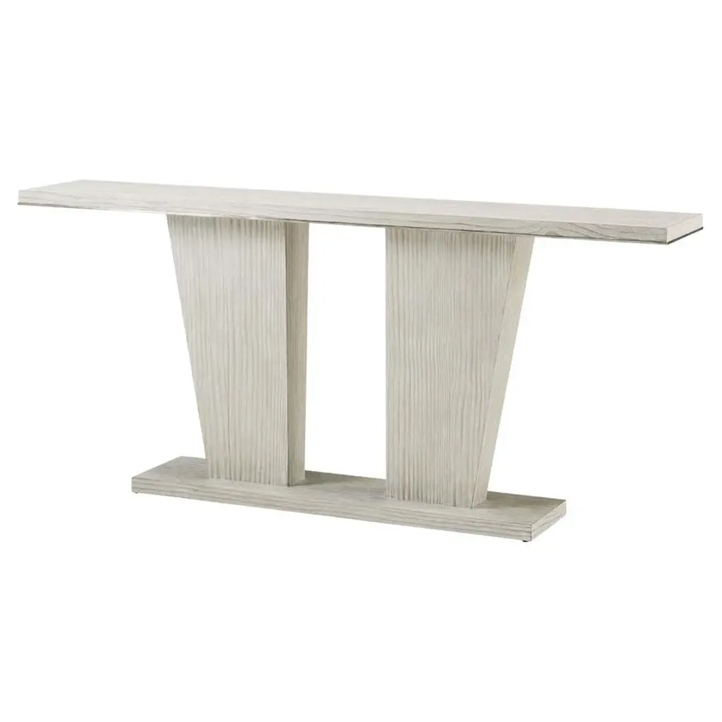 Featuring a wire-brushed white oak in our light grey oak finish. With deep dish galleried top raised on trapezoidal form trestle ends with a stretcher.Dimensions: 60" W x 16" D x 32" HShown in Grey Oak Finish