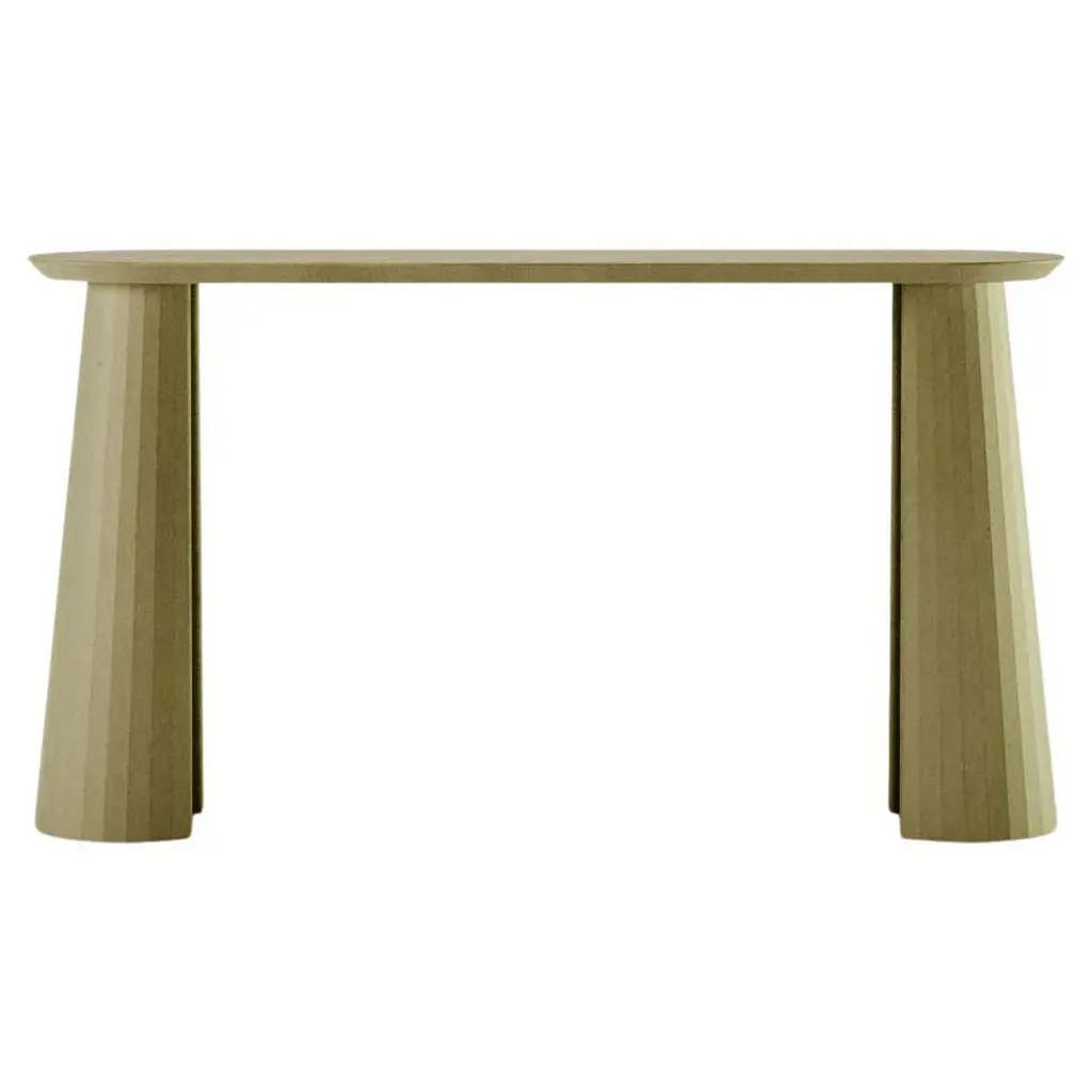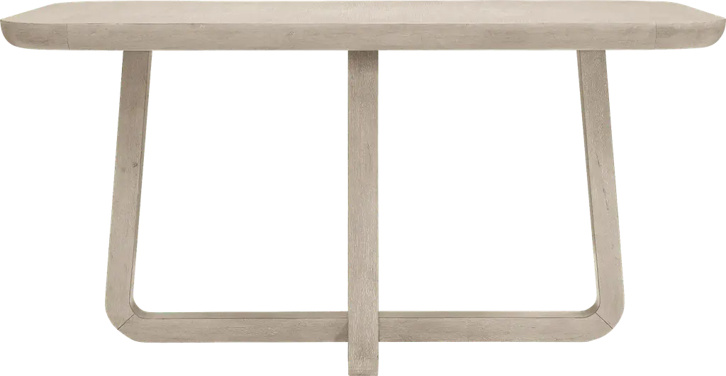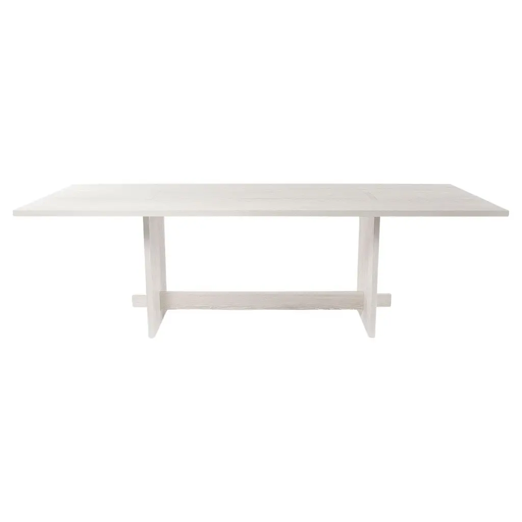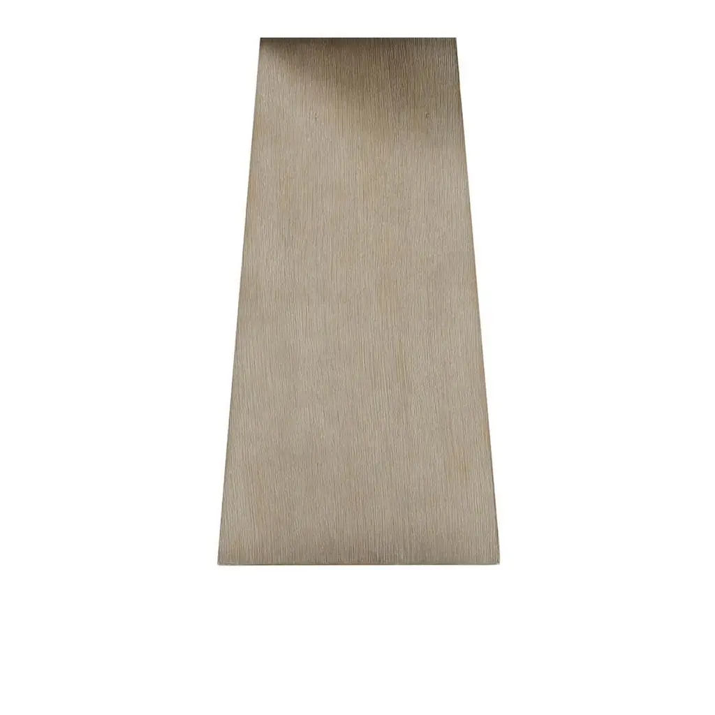 Featuring a wire-brushed white oak in our light grey oak finish. With a Gan Edan quartz top raised on trapezoidal form trestle ends with a stretcher.Dimensions: 72" W x 16" D x 31.75" H