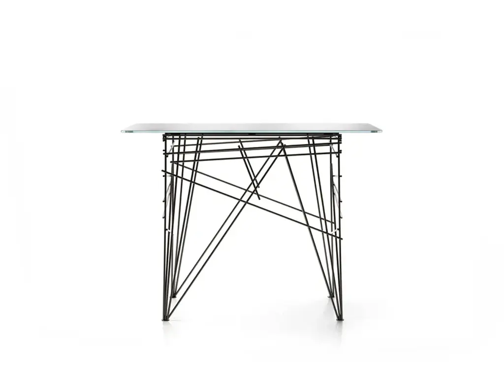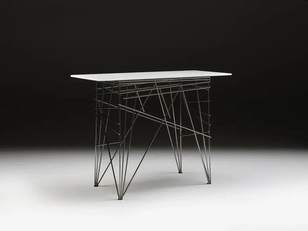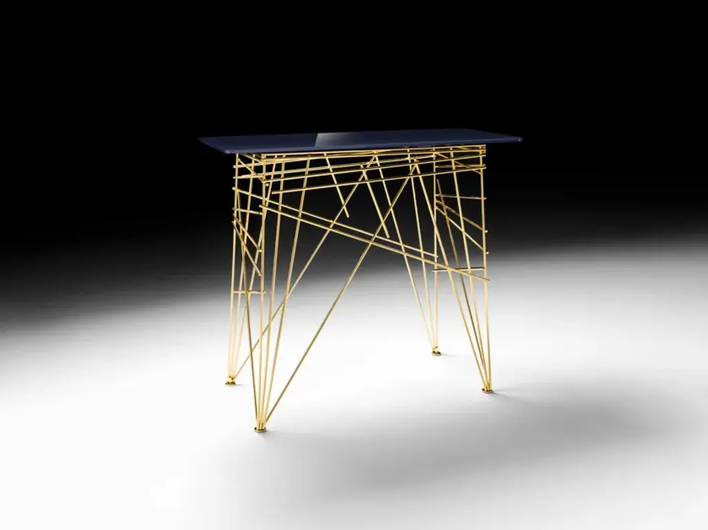 Lin is a rectangular glass and stainless steel console table. Consolle with structure in stainless steel polished gold or dark chrome, back lacquered glass top Blue-black, Rosso fuoco or Bianco grigio. When a piece of furniture becomes an icon, its style stands out at a first glance: the bold personality of the Blue-Black, Rosso fuoco or Bianco grigio back lacquered glass top is harmoniously supported by the playful sculptural effect of the thin gold-plated or dark chrome steel legs. Consolle for highly demanding environments with great character.