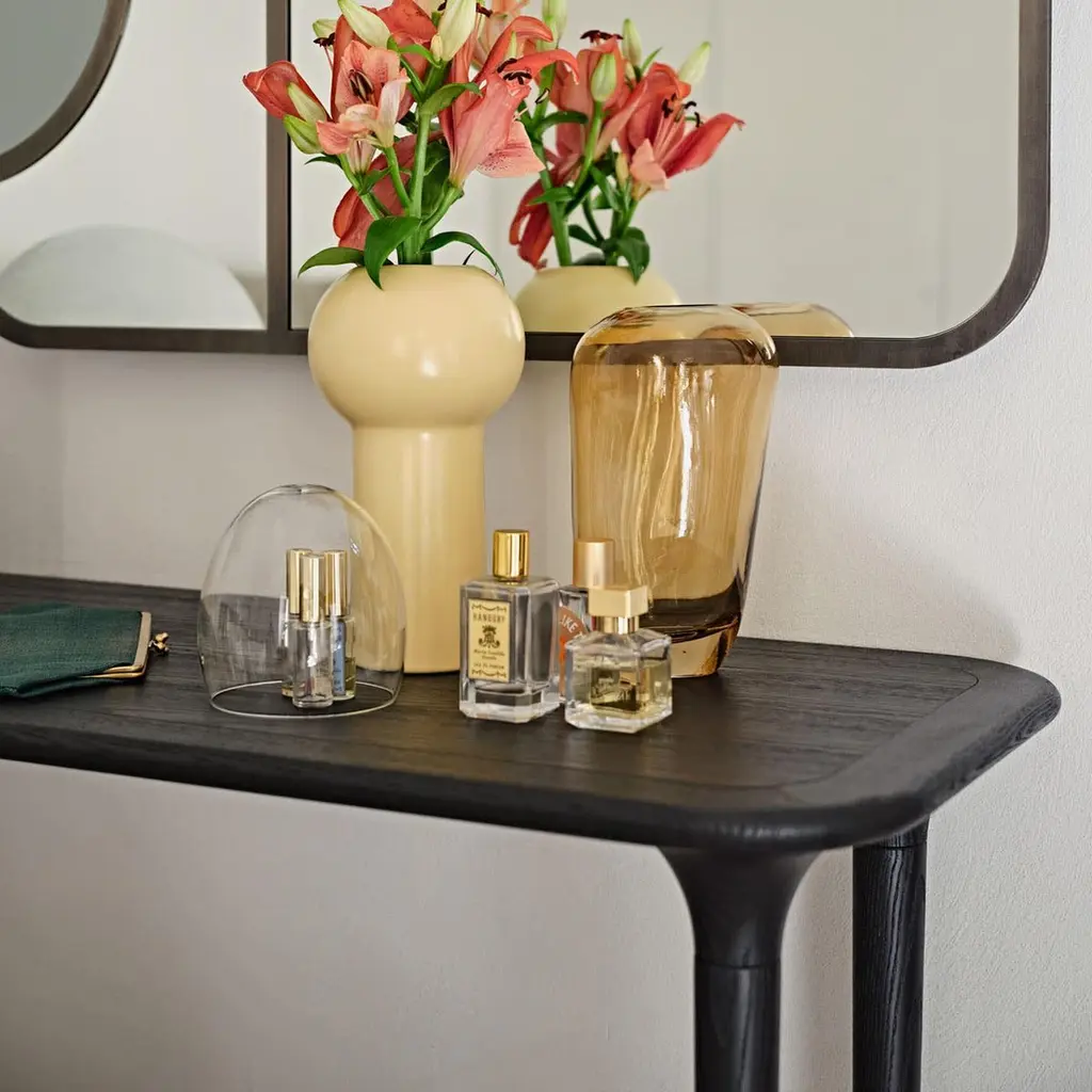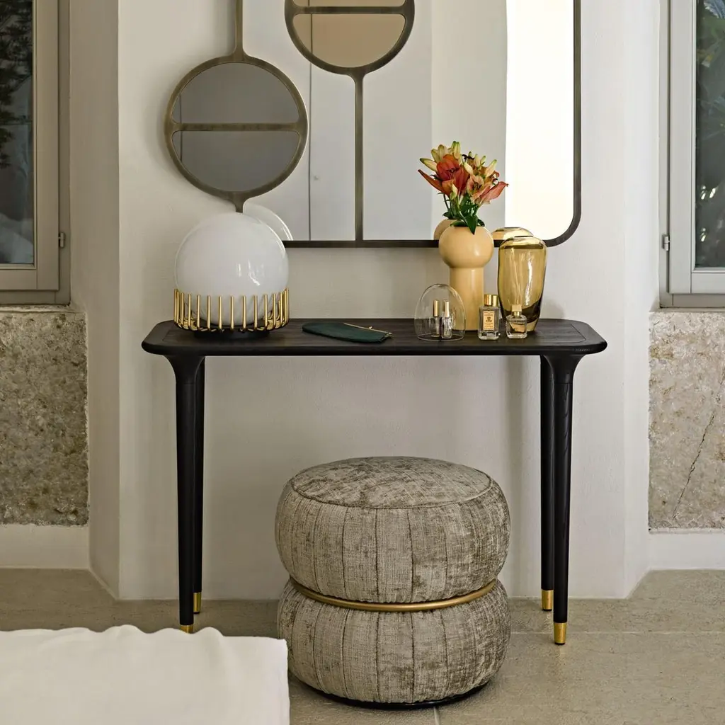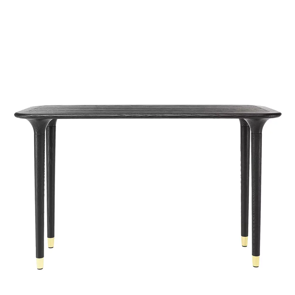 Thoughtfully balanced proportions combined to smooth curves define the elegant look of this console in solid mocha-stained ash. Illuminated by the presence of galvanized golden tips, the tapered legs meet the top by following a progressively flaring profile, for an indulgence in smooth edges that gets confirmed by its rounded corners. Contact the Concierge for finishing variants.