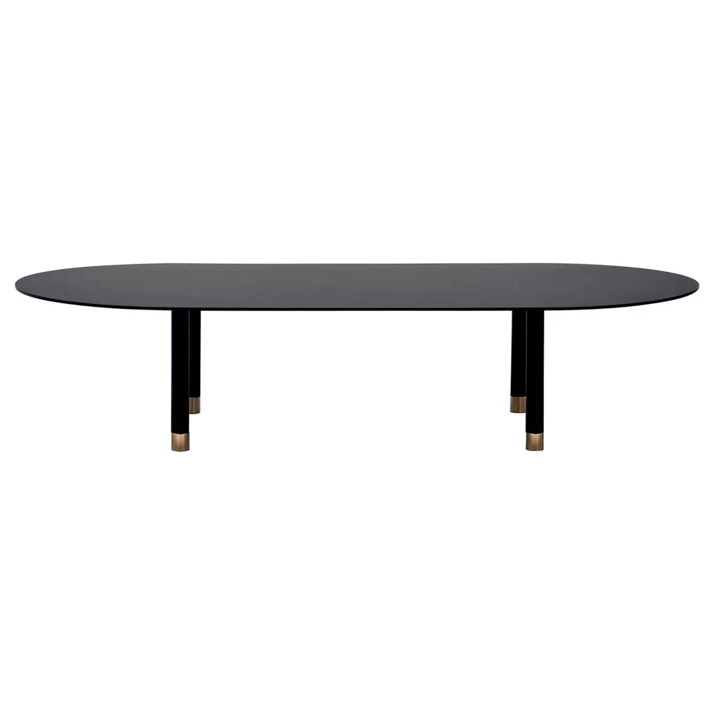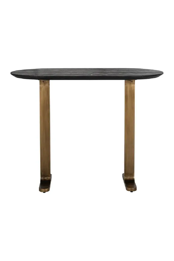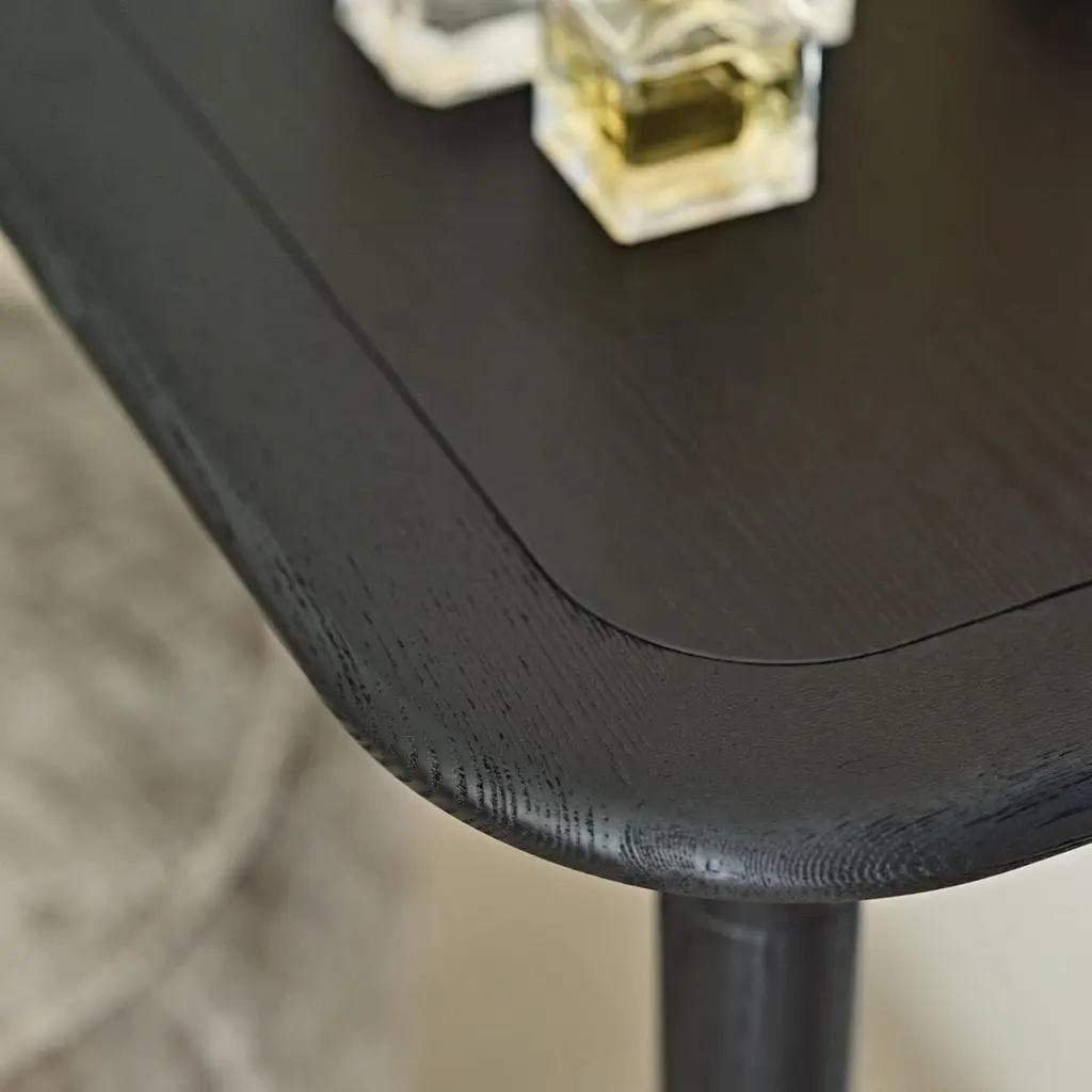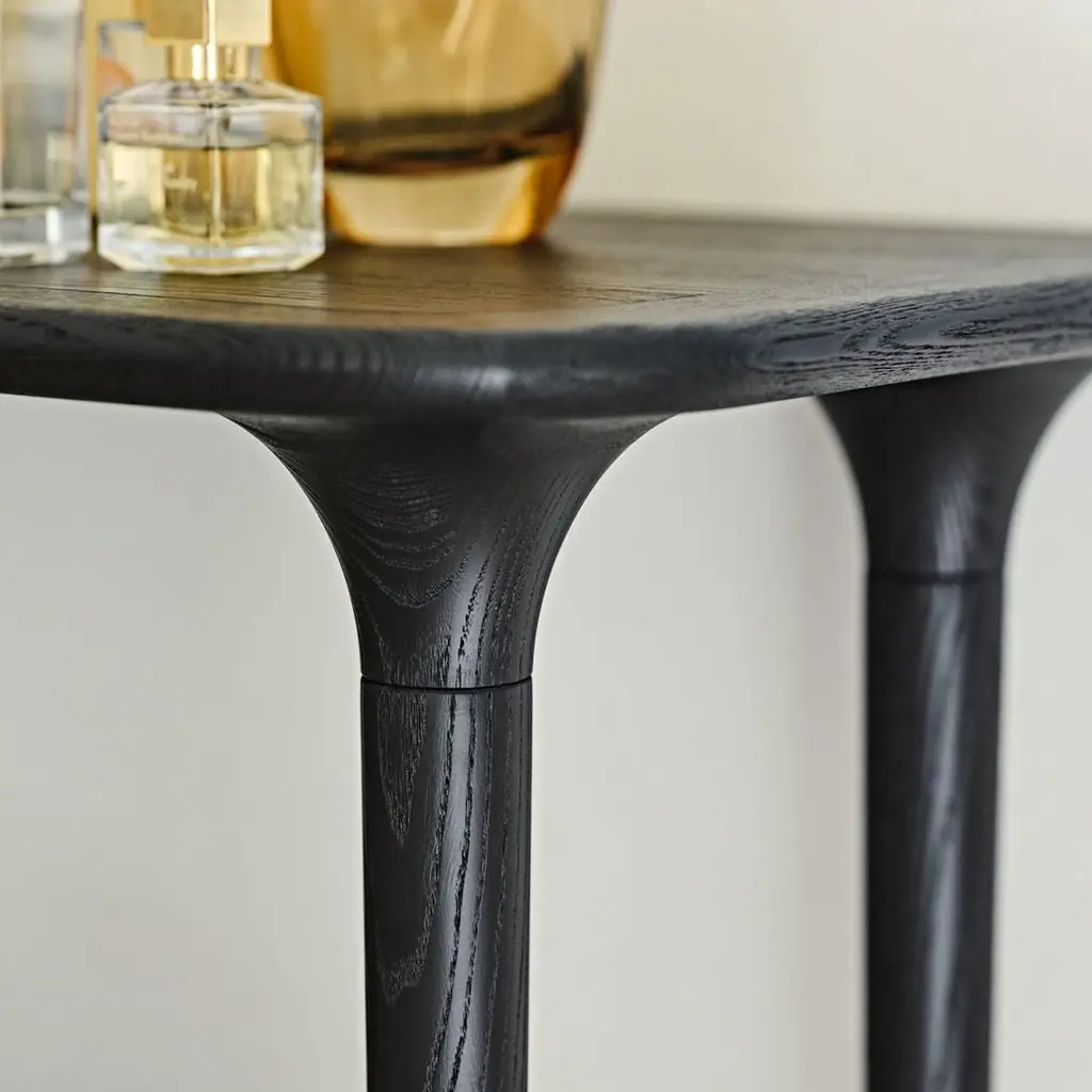 Thoughtfully balanced proportions combined to smooth curves define the elegant look of this console in solid mocha-stained ash. Illuminated by the presence of galvanized golden tips, the tapered legs meet the top by following a progressively flaring profile, for an indulgence in smooth edges that gets confirmed by its rounded corners. Contact the Concierge for finishing variants.