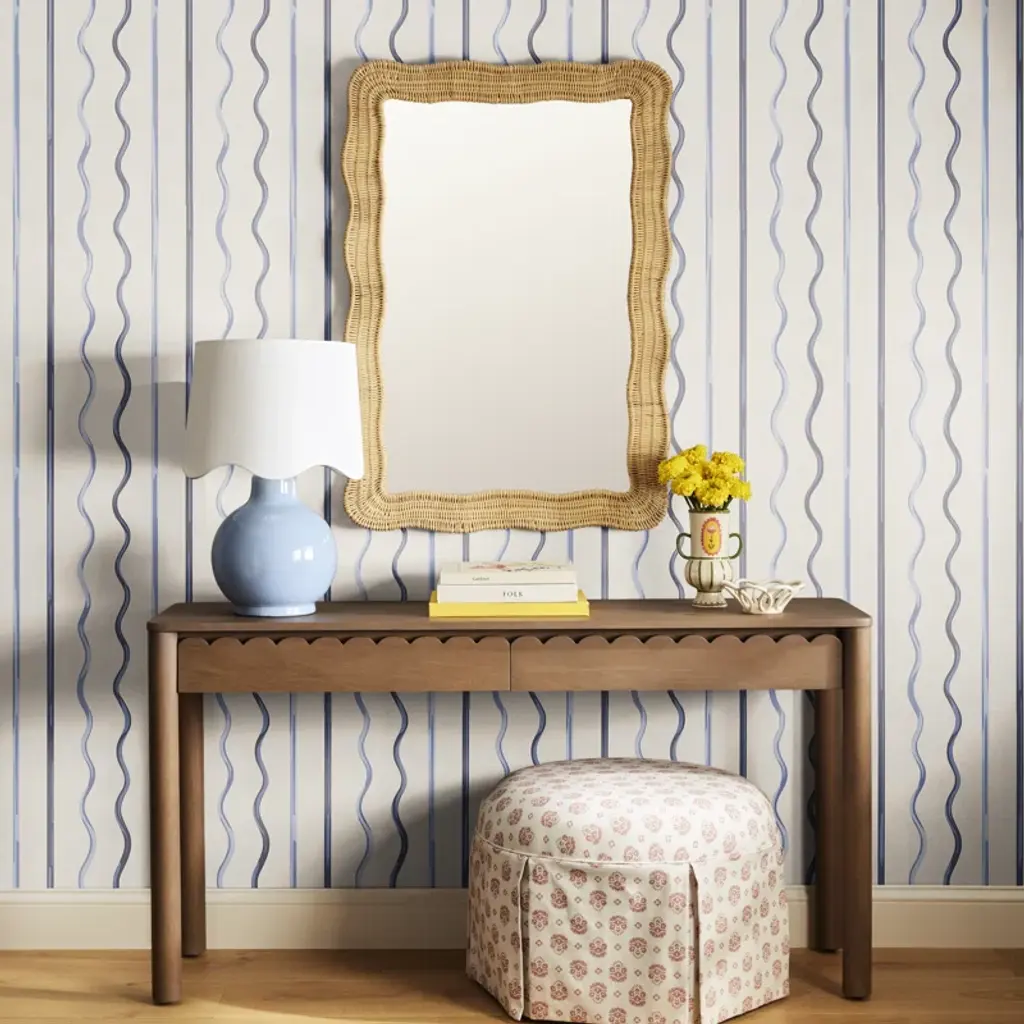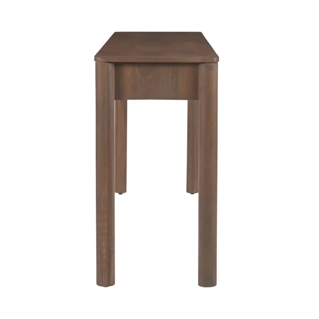 This console table is a warm and inviting addition to your home, featuring intricate scalloped edge details on the faces of its two drawers for a timeless charm. The natural wood grain color variation of the mango wood adds to its character, while the stain-resistant finish ensures it remains looking fresh. Equipped with soft-close metal glides, the drawers offer convenient storage with a touch of sophistication. Best of all, no assembly is required, so you can enjoy this delightful piece right away.