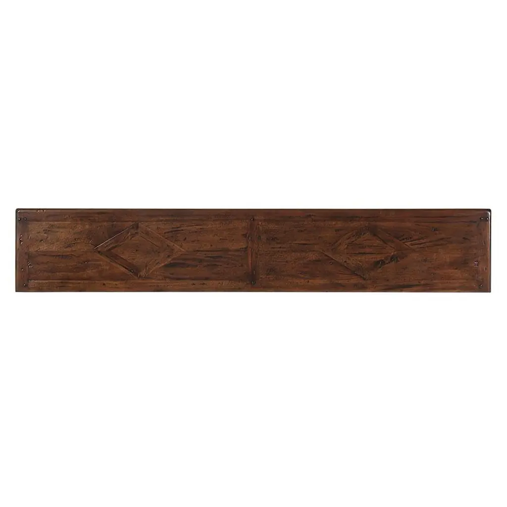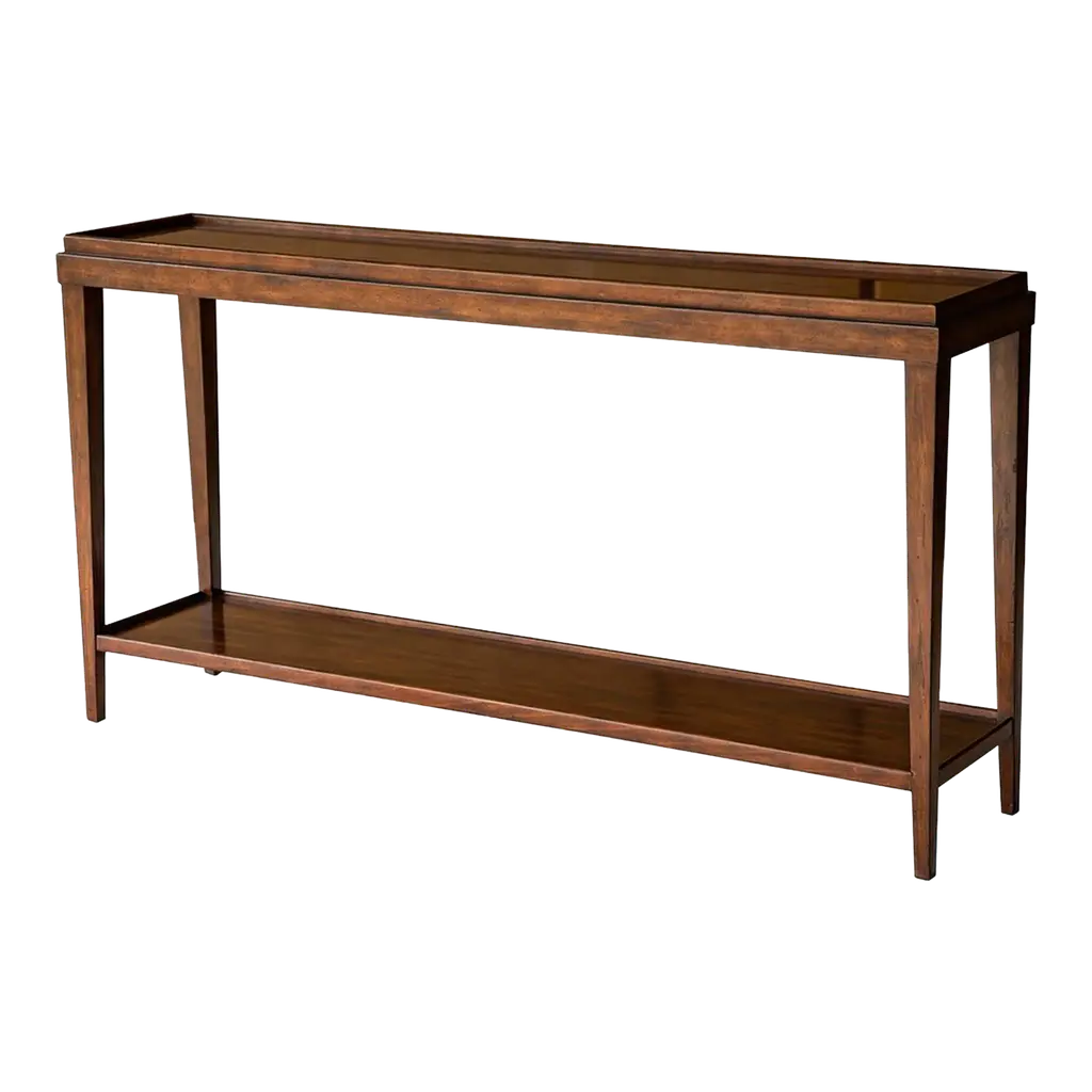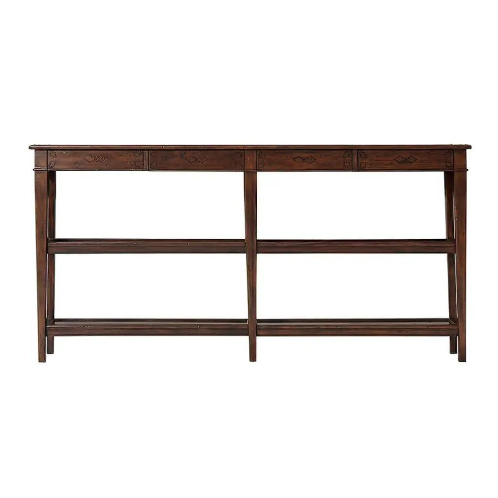 An antiqued wood console table, with four frieze drawers and two further tiers between square tapering supports. The original French Provincial.Dimensions: 72" W x 12" D x 36" H.