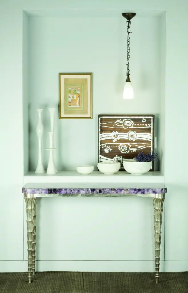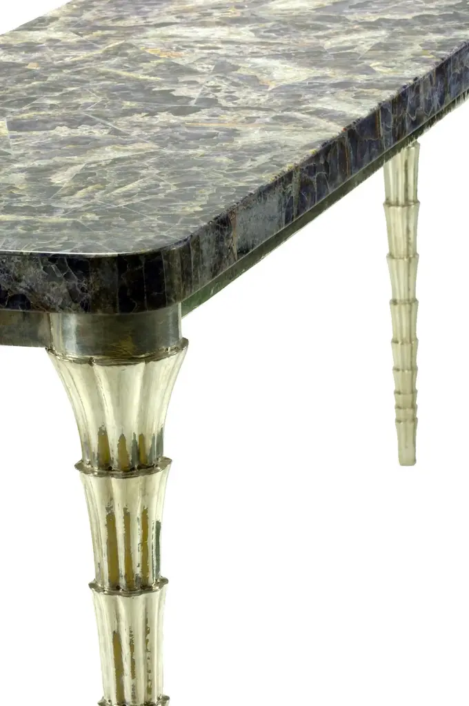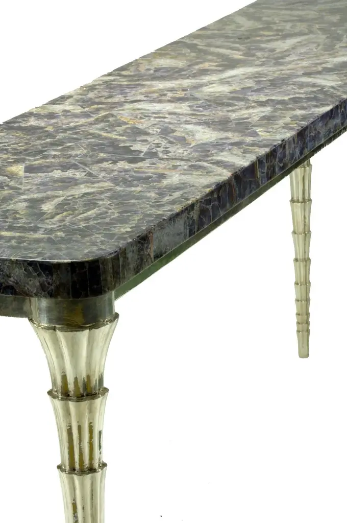 This long narrow console table was designed by Paul Mathieu for Stephanie Odegard Co. Ltd. Jewellery for The Home Collection and was name as "Cornet Table". This long narrow console table is hand-carved in teak and then is clad in metal and adorned with an amethyst mosaic top. The long narrow console table also know as the Cornet Table is named after the elements of the legs which are named after the Cornet Flower Arum shape.The Cornet, long narrow console table is one of the best selling long narrow console tables from the Stephanie Odegard Co. Ltd. Jewellery for The Home Collection. The build quality is outstanding and the design is unique and rare. The Cornet long narrow console table looks elegant in every situation. The master craftsmen carve and cut complex forms that will cover the console table from thick sheets of copper, silver or white bronze. Once the long narrow console table is joined together, it is meticulously encased in a tight-fitting skin of copper, purest silver or white bronze. The silver used was assayed at 96% purity, which exceeds the minimum standard for sterling of 92.5%. Brass, White Bronze, Antiqued bronze, Silver and Copper are the available options for the metal skin. Both silver and copper will tarnish over time. Regular non-abrasive household metal polishes can be used to restore the original finish.The Cornet table was designed by Paul Mathieu for Stephanie Odegard Co. Ltd. Jewellery for The Home Collection and was hand-made in India. The design is unique, exceptional and rare.Long Narrow Console Table in Amethyst and White Bronze Clad Hand-made by Paul MathieuSize- (L) 60" x (B) 18" x (H) 31"Materials: Amethyst, Teak, Wood, Metal-sheet Techniques: Hand-Carved, Metalwork, Mosaic