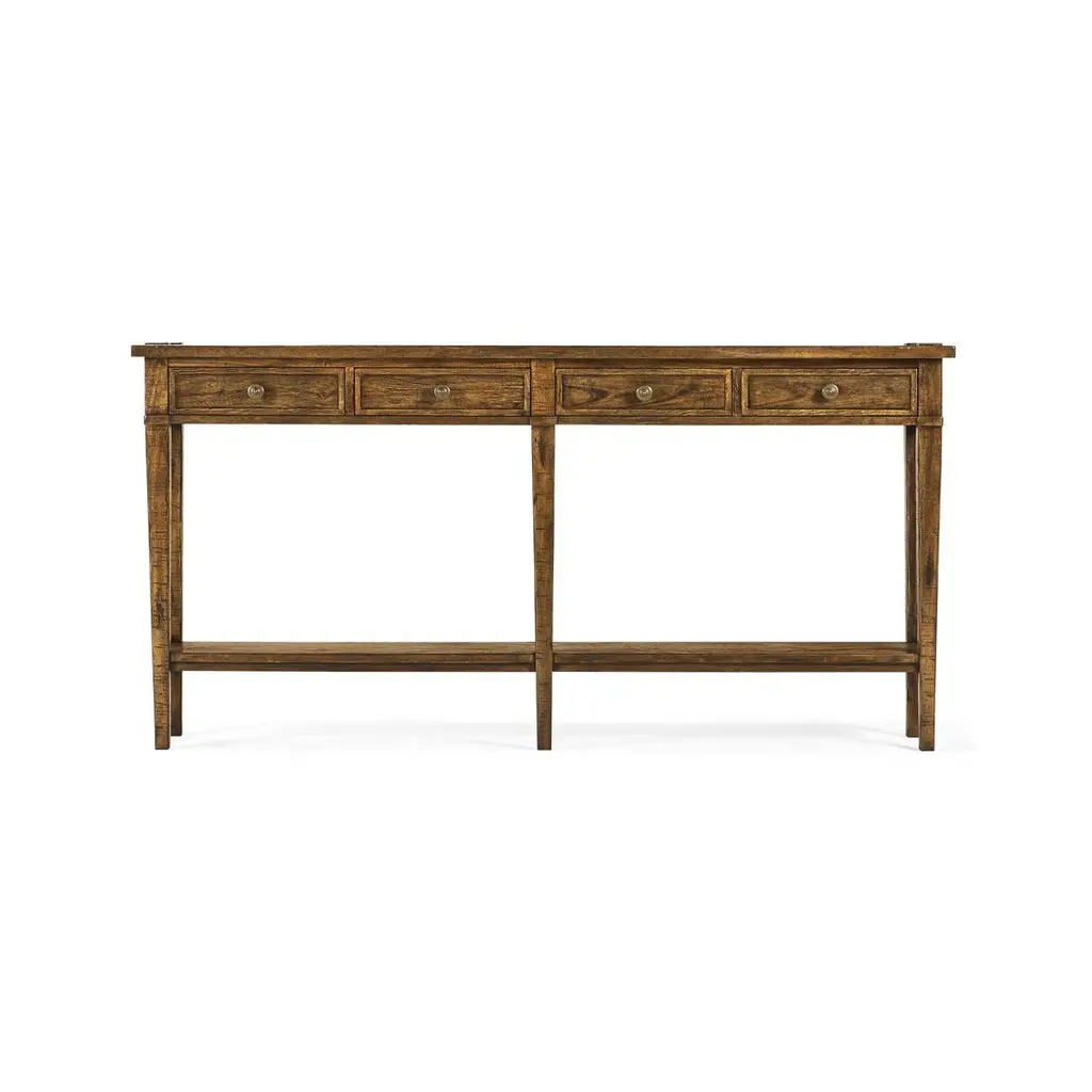 Long narrow country console. This rectangular hall table has a rustic country finish with a paneled top showing exposed saw marks above four drawers set on square tapered legs with a shelf stretcher base.Dimensions: 68 1/8" W x 12" D x 34 1/4" H.