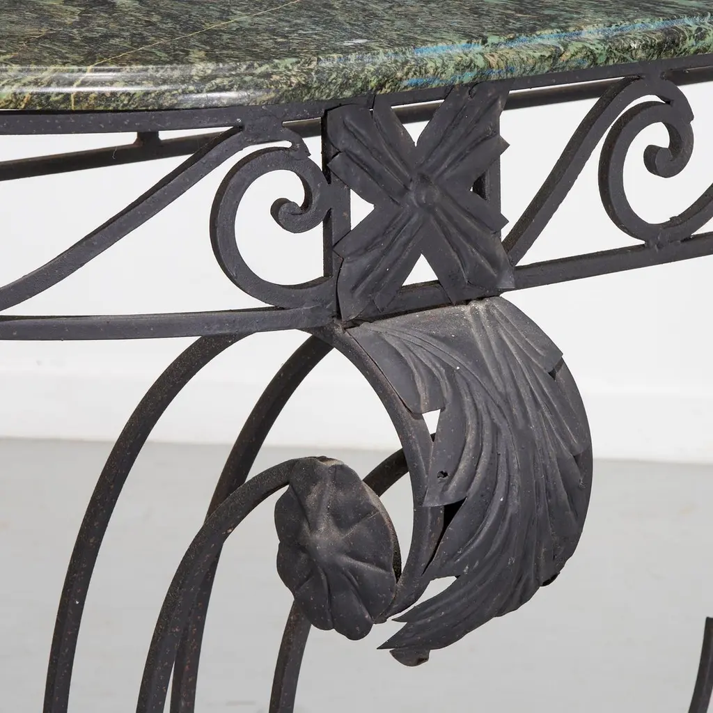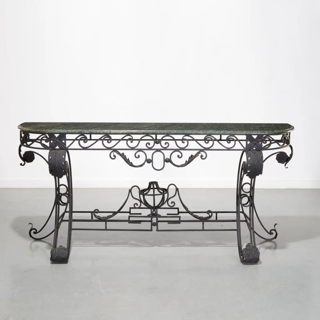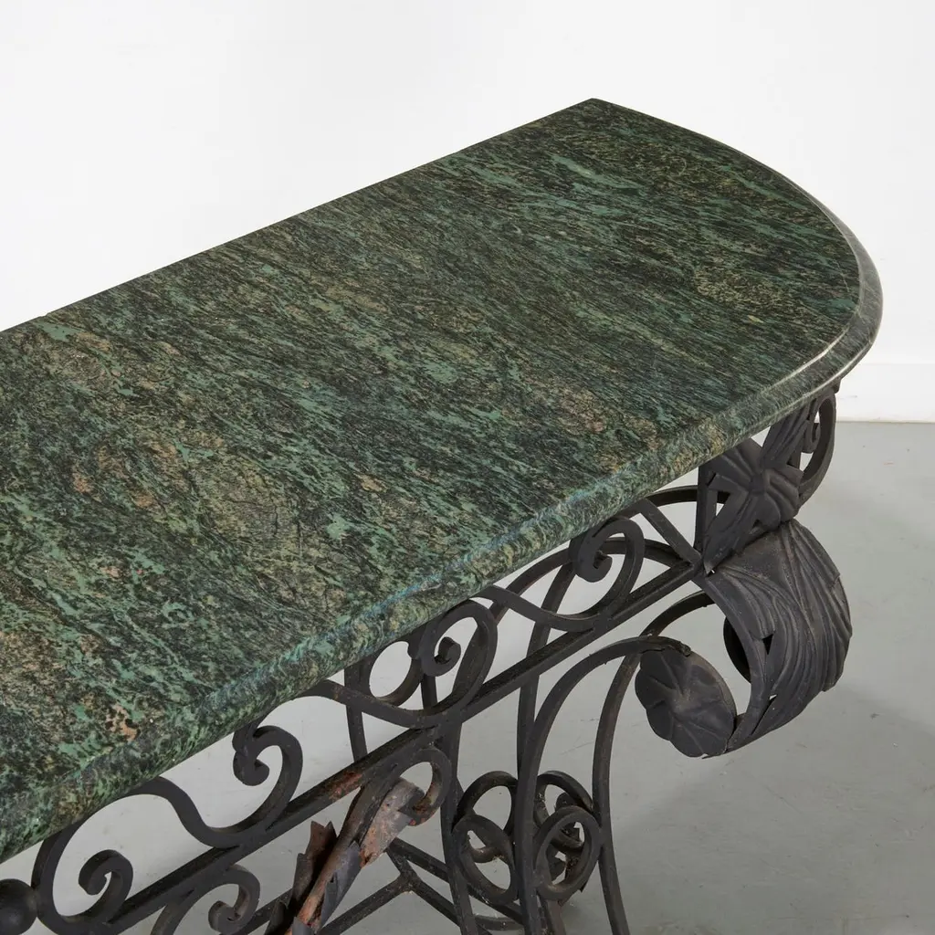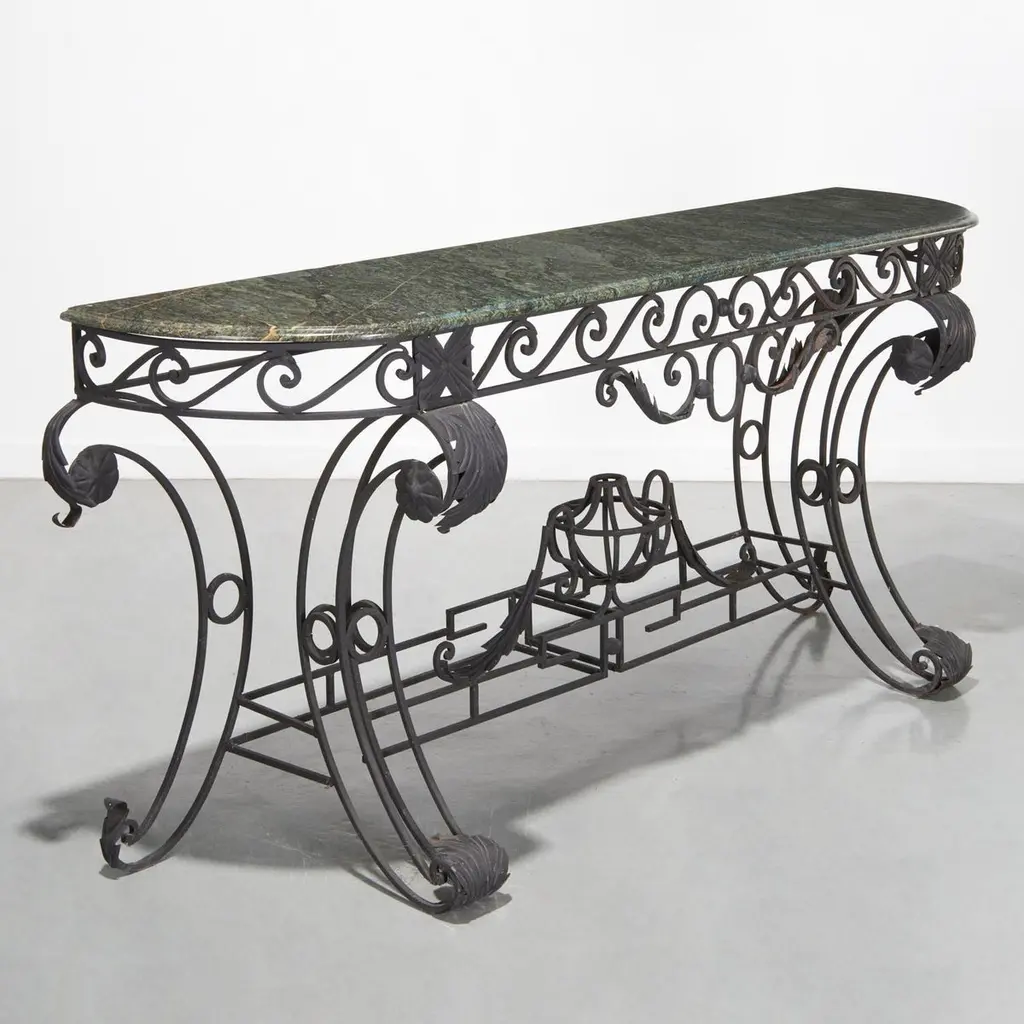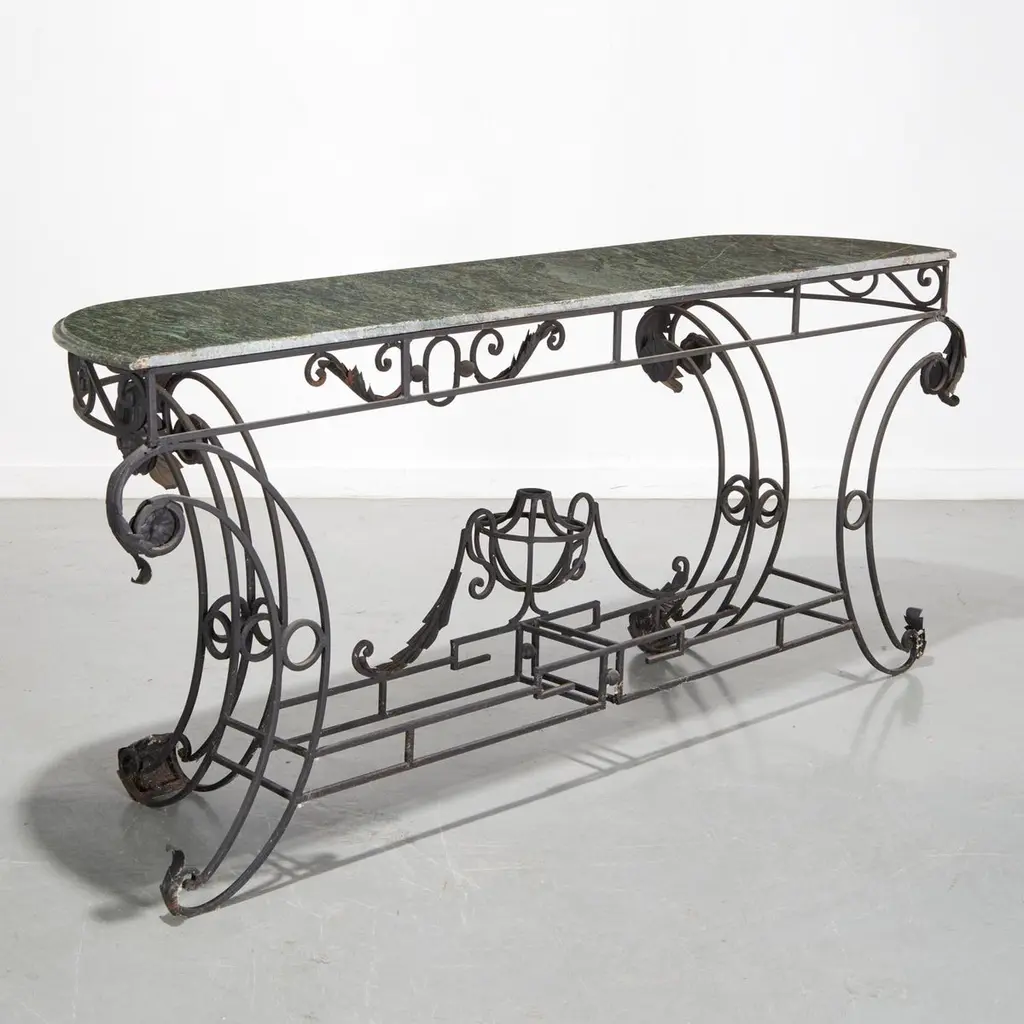 A grand and elegant wrought iron console table in the Louis XV style, dating to the early to mid-20th century. The hand-forged iron base is composed of intricately scrolled supports, stylized acanthus leaves, and symmetrical flourishes, all characteristic of Rococo Revival design. The table is topped with a substantial green marble slab with richly mottled veining in hues of emerald, moss, and deep forest green, offering a luxurious contrast to the dark patinated iron.The composition and ornamental vocabulary are strongly evocative of the work of Edgar Brandt, the celebrated French master of Art Deco ironwork, known for blending classical motifs with modern materials. While this piece is unsigned, its design and craftsmanship align with pieces executed in his style or by contemporaneous ateliers influenced by his work.Dimensions: 37" H × 81" W × 23.5" DConditionGood overall condition. Scattered surface oxidation and minor wear to the iron consistent with age and use. Marble top has light edge wear, a few small nicks, and natural inclusions. Structurally sound and ready to place.ProvenanceProperty from LuShan Farm, Chester, New Jersey, an esteemed private estate known for its curated collection of decorative arts and garden furnishings.