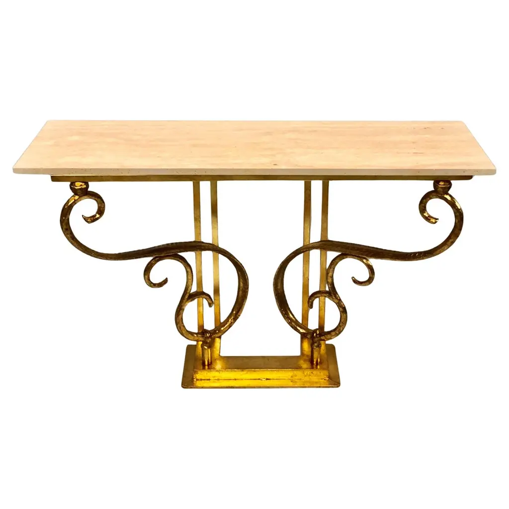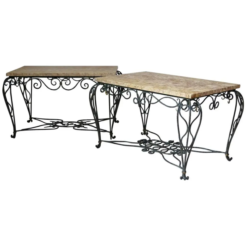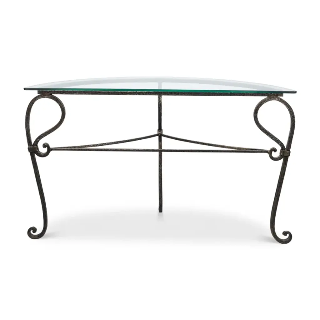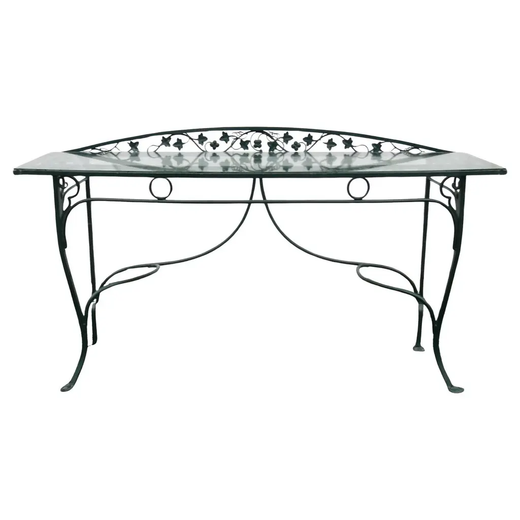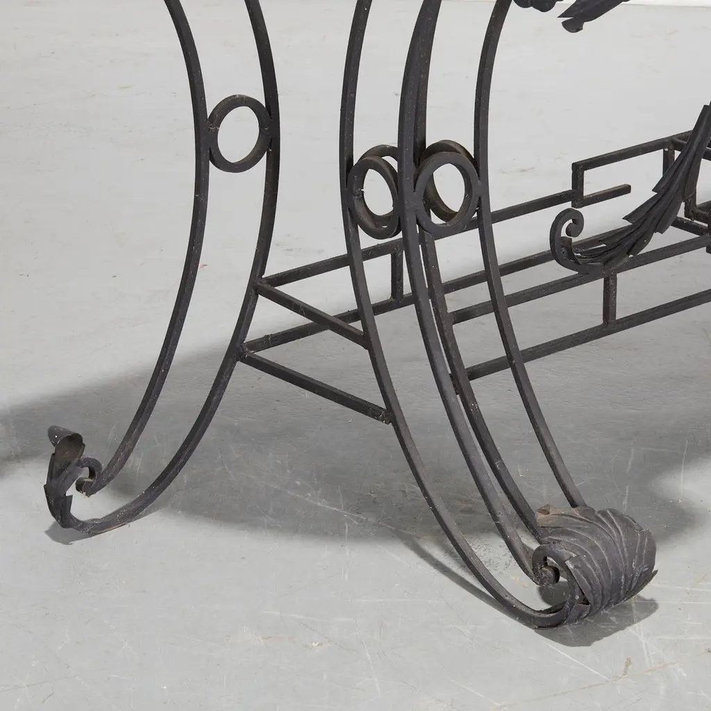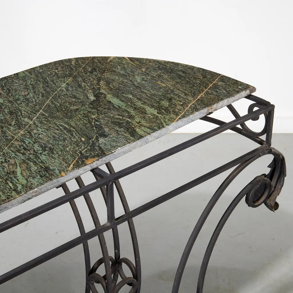 A grand and elegant wrought iron console table in the Louis XV style, dating to the early to mid-20th century. The hand-forged iron base is composed of intricately scrolled supports, stylized acanthus leaves, and symmetrical flourishes, all characteristic of Rococo Revival design. The table is topped with a substantial green marble slab with richly mottled veining in hues of emerald, moss, and deep forest green, offering a luxurious contrast to the dark patinated iron.The composition and ornamental vocabulary are strongly evocative of the work of Edgar Brandt, the celebrated French master of Art Deco ironwork, known for blending classical motifs with modern materials. While this piece is unsigned, its design and craftsmanship align with pieces executed in his style or by contemporaneous ateliers influenced by his work.Dimensions: 37" H × 81" W × 23.5" DConditionGood overall condition. Scattered surface oxidation and minor wear to the iron consistent with age and use. Marble top has light edge wear, a few small nicks, and natural inclusions. Structurally sound and ready to place.ProvenanceProperty from LuShan Farm, Chester, New Jersey, an esteemed private estate known for its curated collection of decorative arts and garden furnishings.