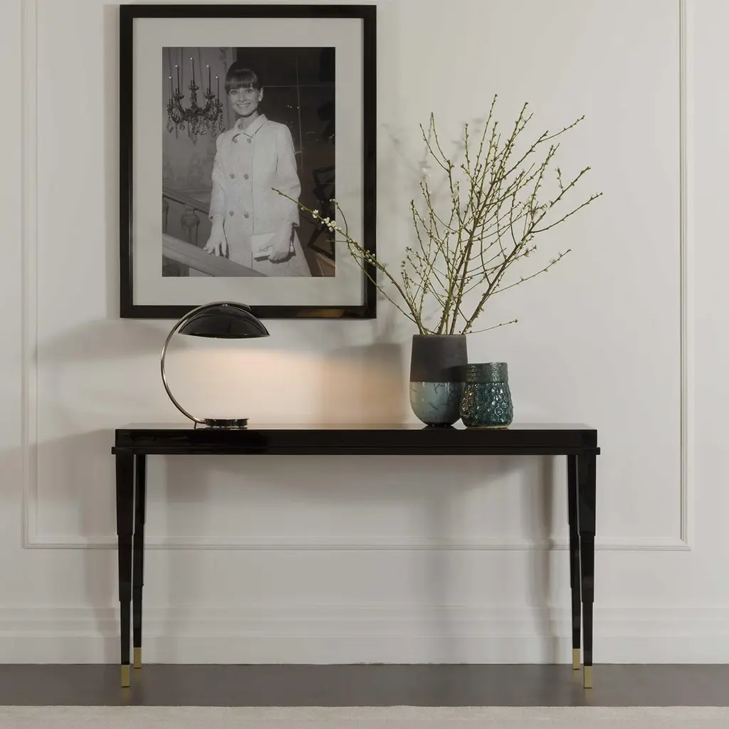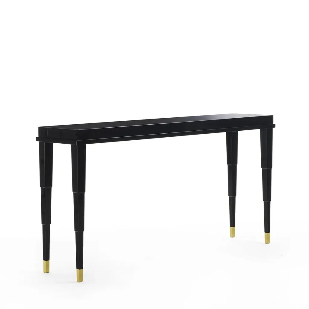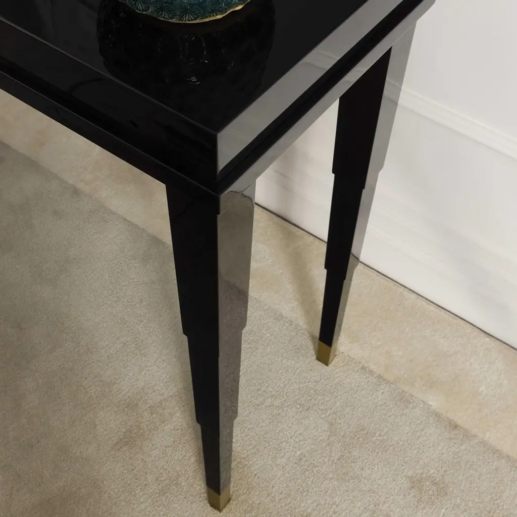 Sophisticated and timeless, this console is a stunning entryway piece for a modern or Classic home, where it will create a glamorous first impression, thanks to its elegant materials and unique silhouette. The structure in solid wood boasts a lacquered top and sculptural legs that taper toward the brass feet with a satin finish. The metal details can also be made of bronzed metal.