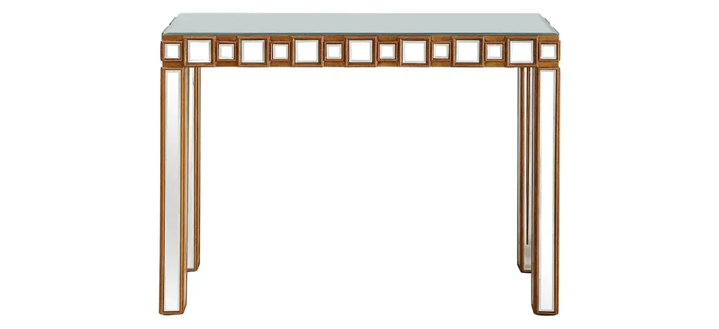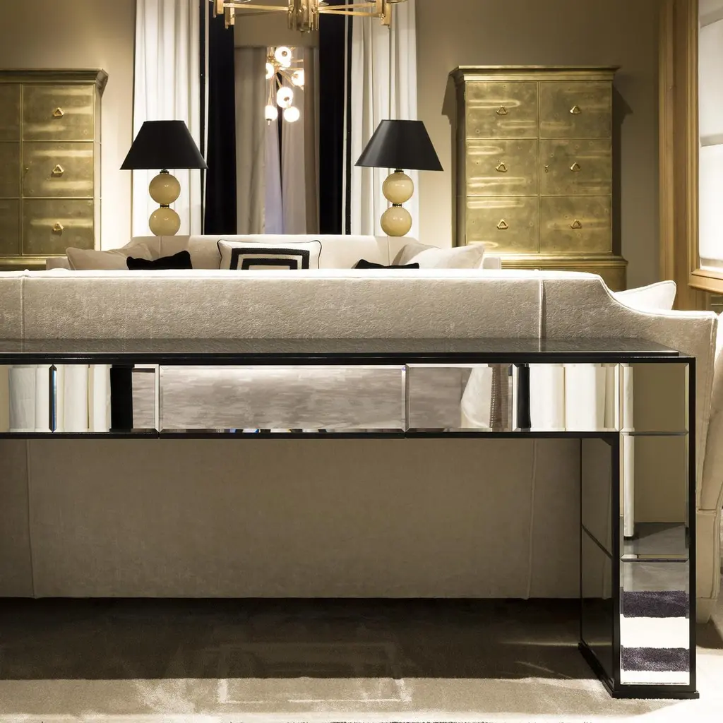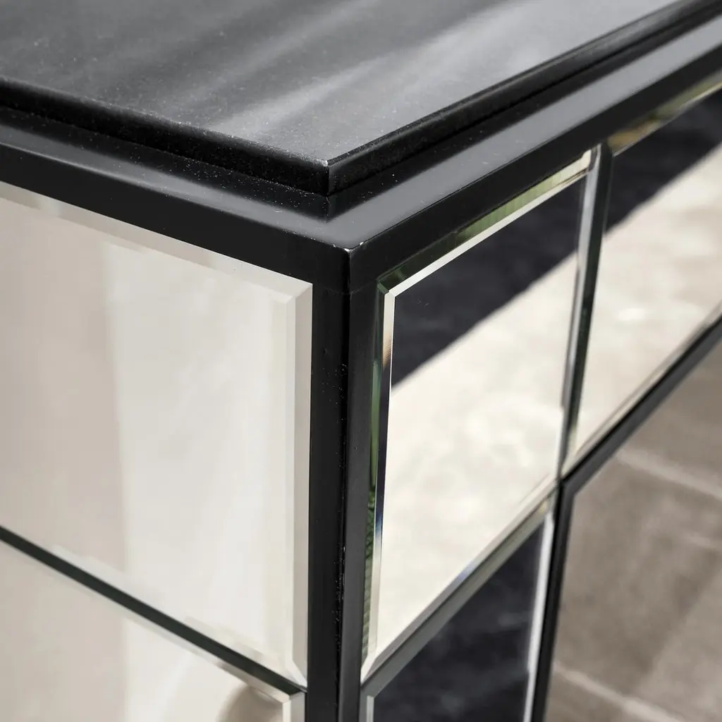 Inspired by the bold and luxurious style of art deco furniture, this console is sure to be a standout addition to a living room or a striking welcoming piece in an entryway, both classic and contemporary. Its minimalist silhouette features a black wooden structure adorned with mirror inserts mirror that strikingly reflect the surrounding light. The black marble top adds a lavish accent to the piece.