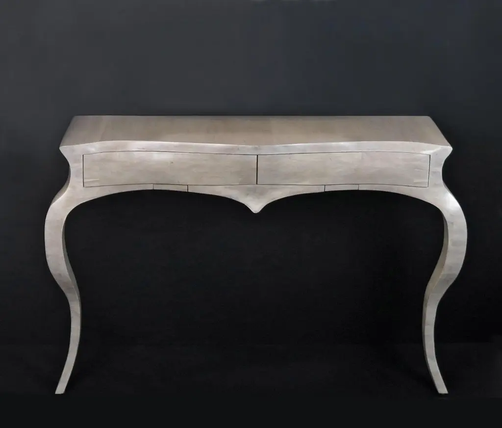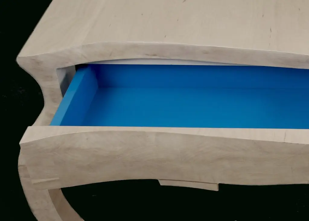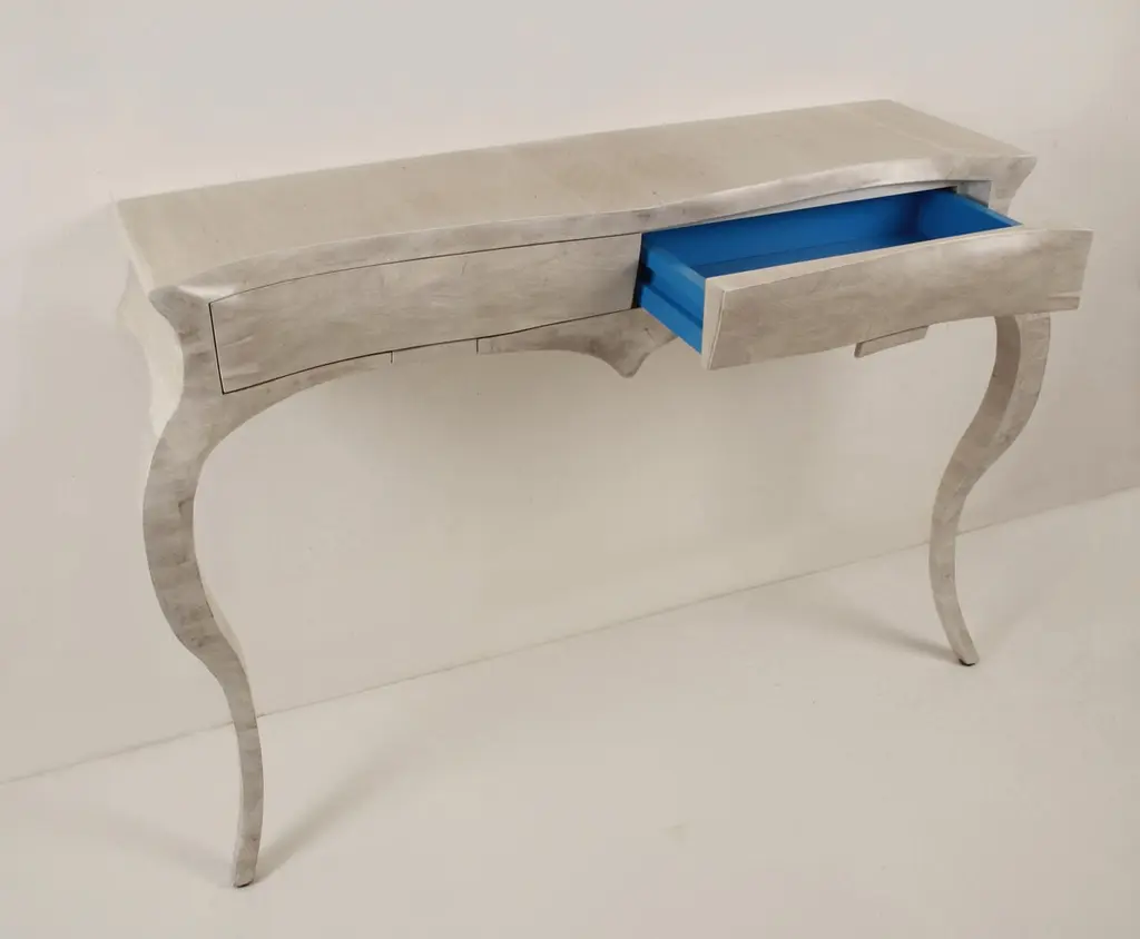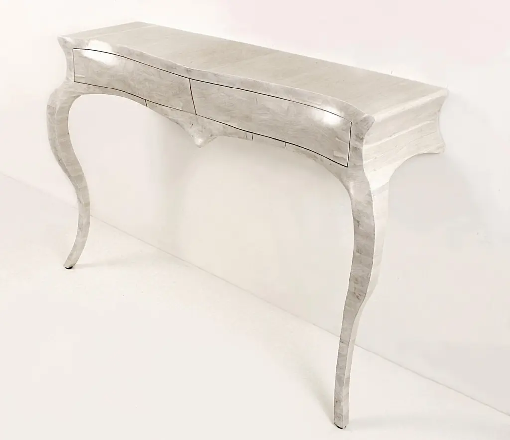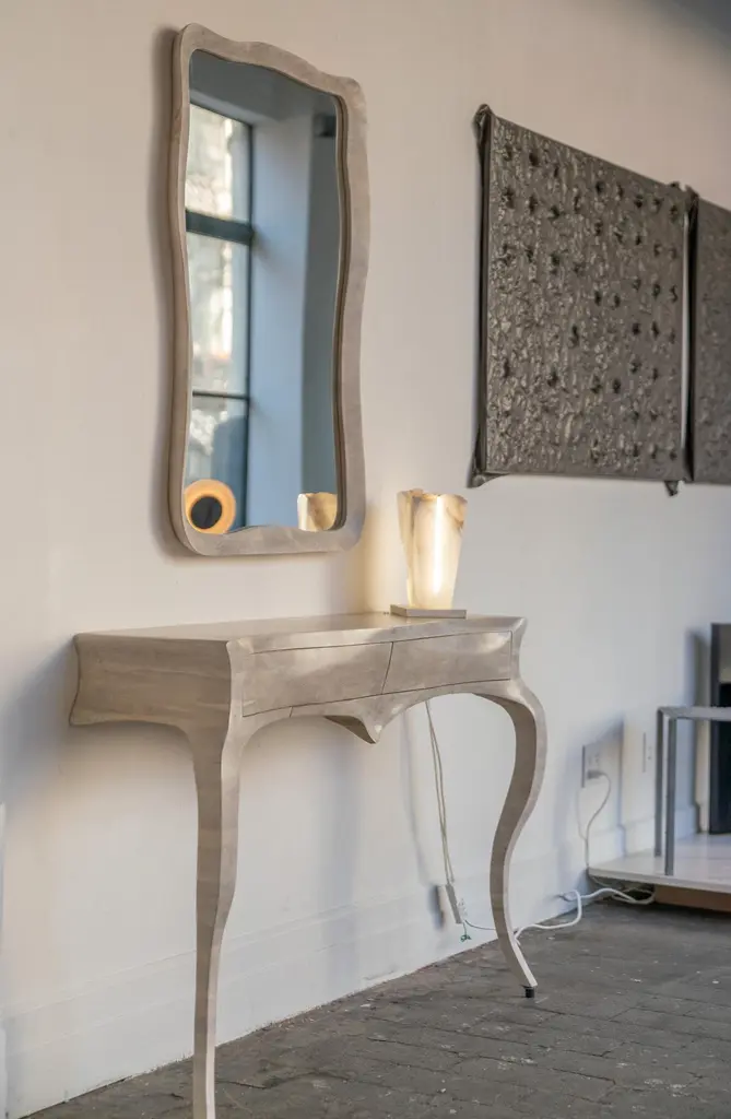 LXV console table by Aaron ScottDimensions: D 33.5 x W 112 x H 81.5 cmMaterials: bleached cherry.Also available in other woods: walnut, ebonized cherry, ebonized walnut. Brooklyn-based designer Aaron Scott was raised in the mountains and forests of Southwest Oregon. He studied philosophy at the University of Colorado,Boulder, followed by fine art at the San Francisco Art Institute. Since moving toNYC in the late 90s Scott has worked in a variety of mediums – film, sculpture,writing and furniture design. Drawing inspiration from nature, science andmathematics, Scott’s work explores relationships of space, light and movement.Using a meticulous, labor-intensive process that relies on the hand and the eye, improvisation and experimentation, Scott has developed a body of sculptural furniture characterized by complex geometries, rotational symmetry and unconventional engineering. Since the early 2000s Scott’s furniture has been built using the stacked-laminate method – a technique that relies on the careful laying-out of alternating grain patterns on parallel pieces of wood, overlapped in successive layers. The process is both additive and subtractive. In the first stage the rough form is built by stacking glued-up layers, each corresponding to a given point on the x, y or z axes. These layers, laminated together in a stair-like or topographical form, are then sculpted with handheld power tools to obtain the final, smooth surface. With each new piece Scott attempts to push the boundaries of the medium of wood and his own imagination, posing and re-posing the question to himself: Which parts of the form are essential and which can be removed?