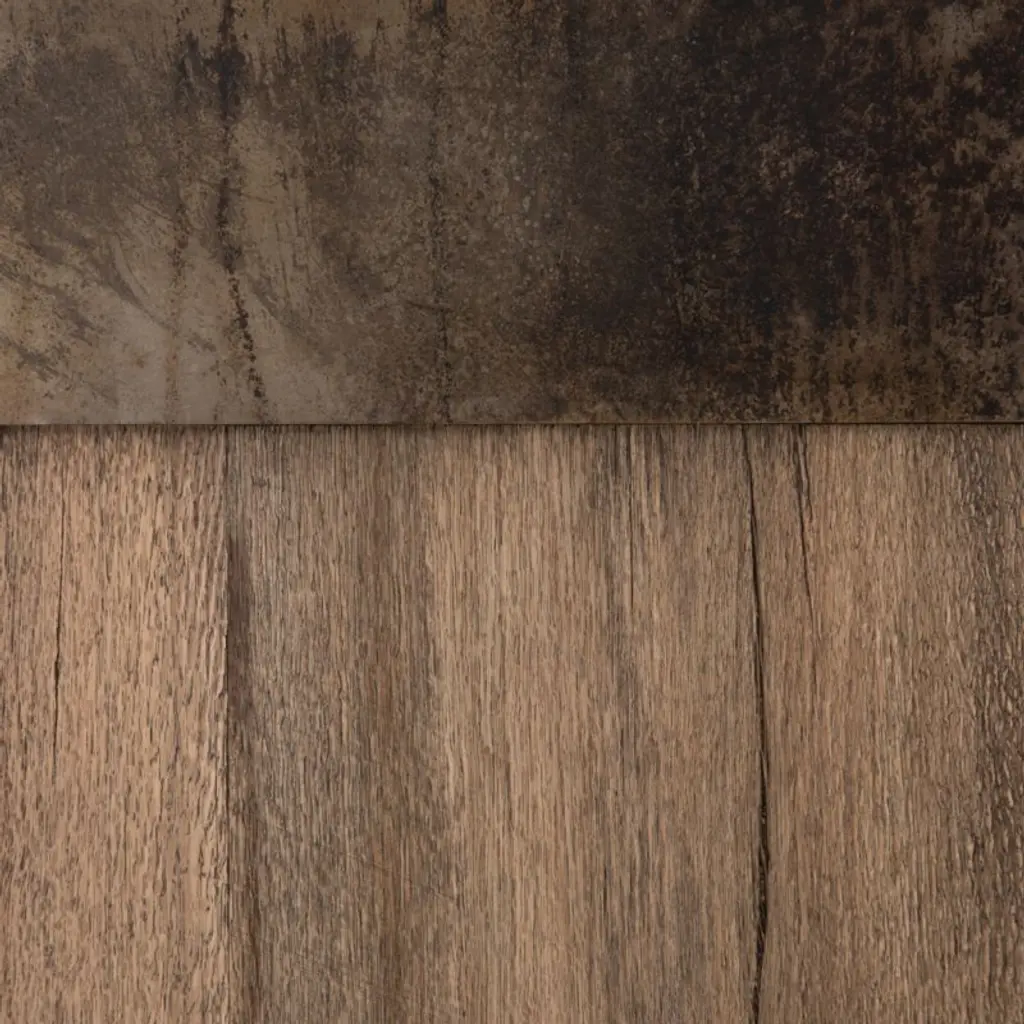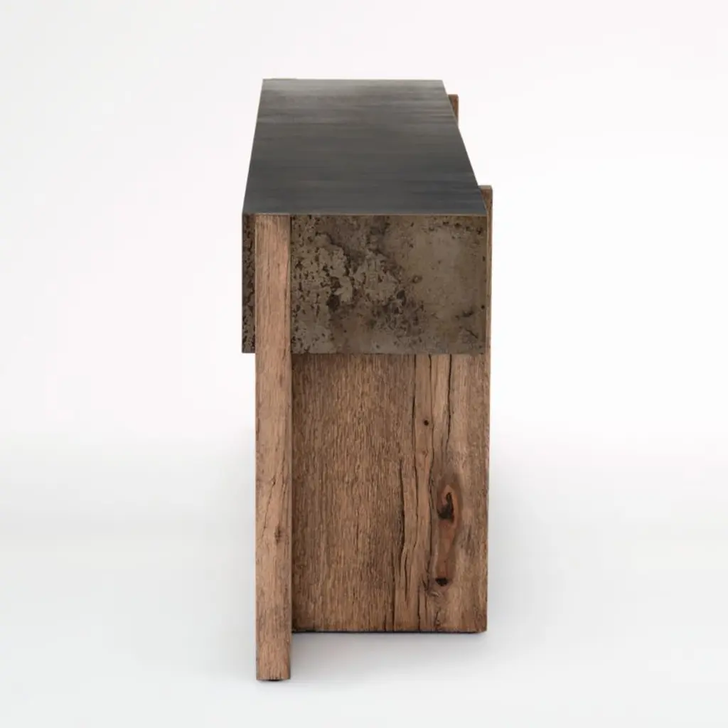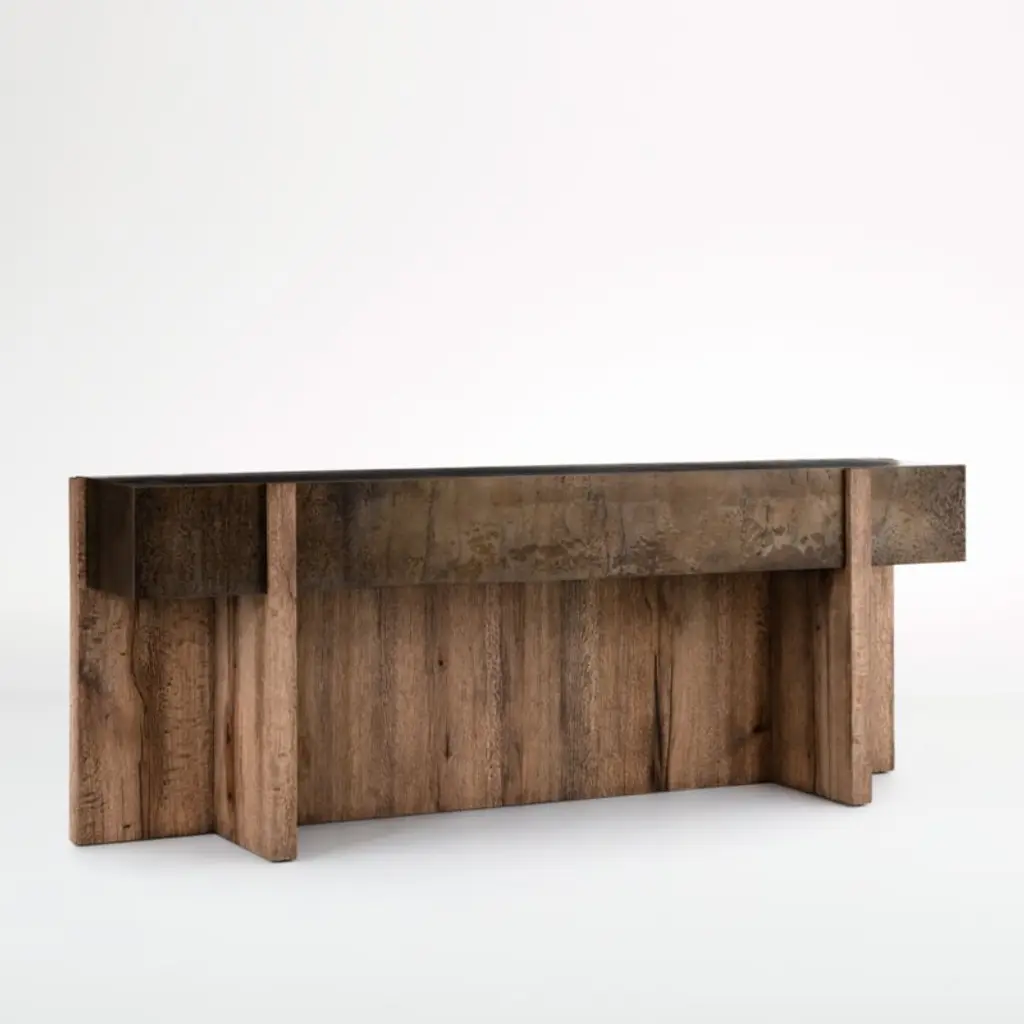 Our Mackinley console table mixes materials in a sculptural design that's organic in spirit. Character-rich oak veneer crafts the table's sculptural base composed of two plank-style legs set at right angles to a solid wall of vertical boards. Set within the legs, the thick rectangular iron top displays the unique markings and color of the distressed patina. Beautiful at any angle, the console table anchors the back of a sofa or floats in the room as a space divider with a dramatic industrial-meets-rustic look.