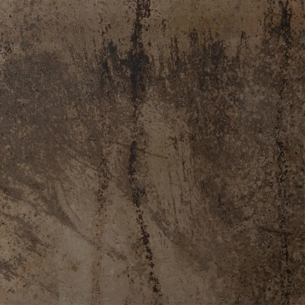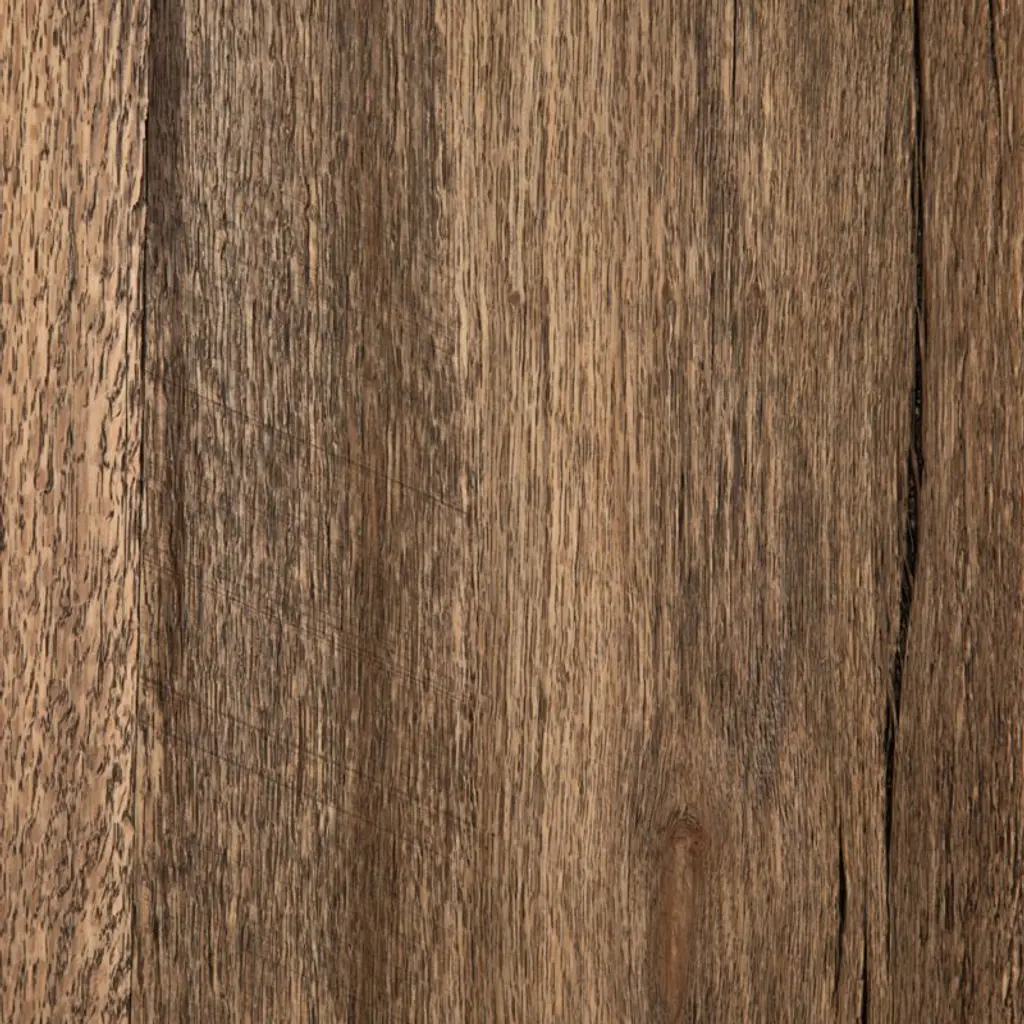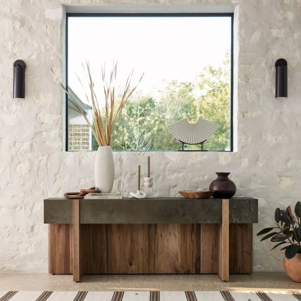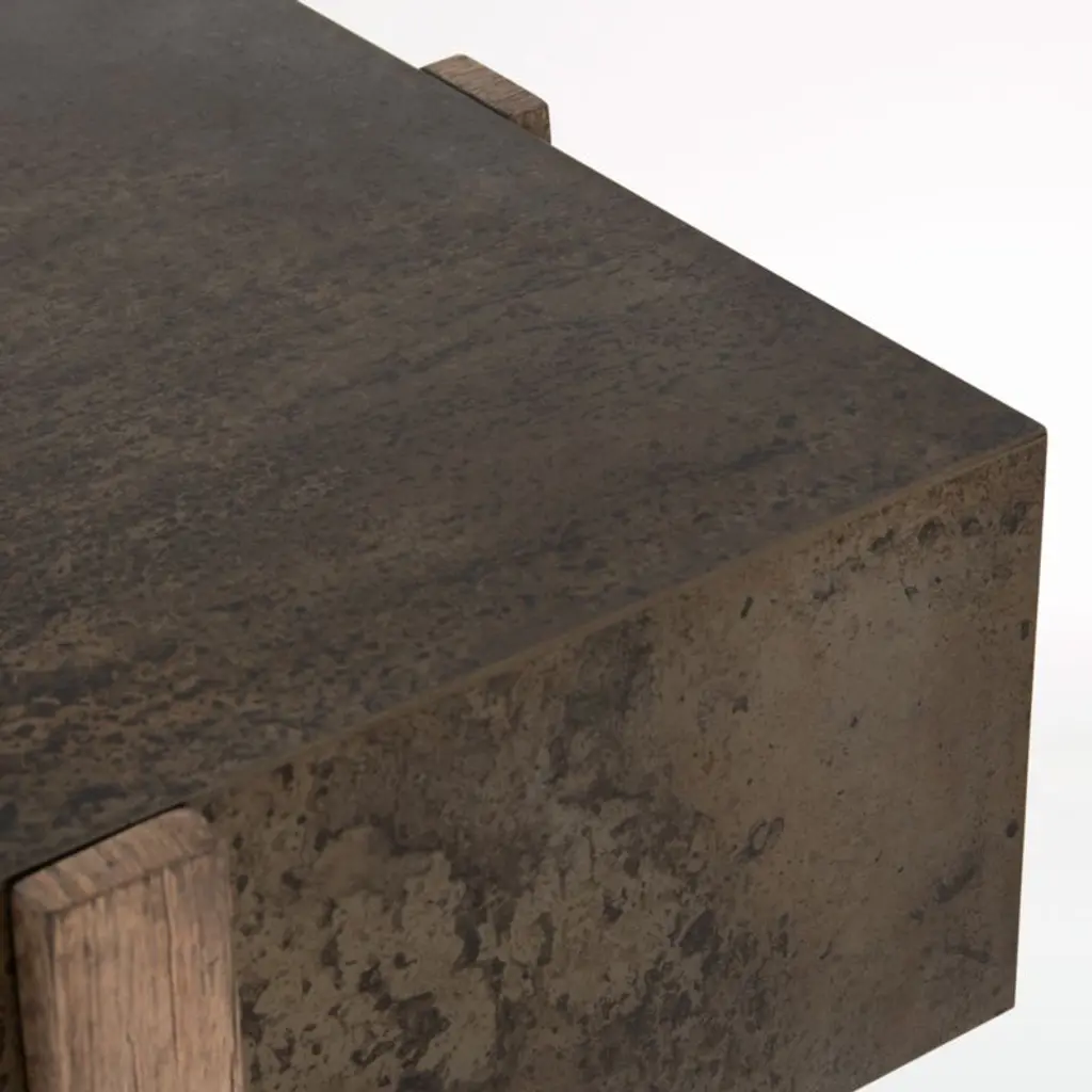 Our Mackinley console table mixes materials in a sculptural design that's organic in spirit. Character-rich oak veneer crafts the table's sculptural base composed of two plank-style legs set at right angles to a solid wall of vertical boards. Set within the legs, the thick rectangular iron top displays the unique markings and color of the distressed patina. Beautiful at any angle, the console table anchors the back of a sofa or floats in the room as a space divider with a dramatic industrial-meets-rustic look.