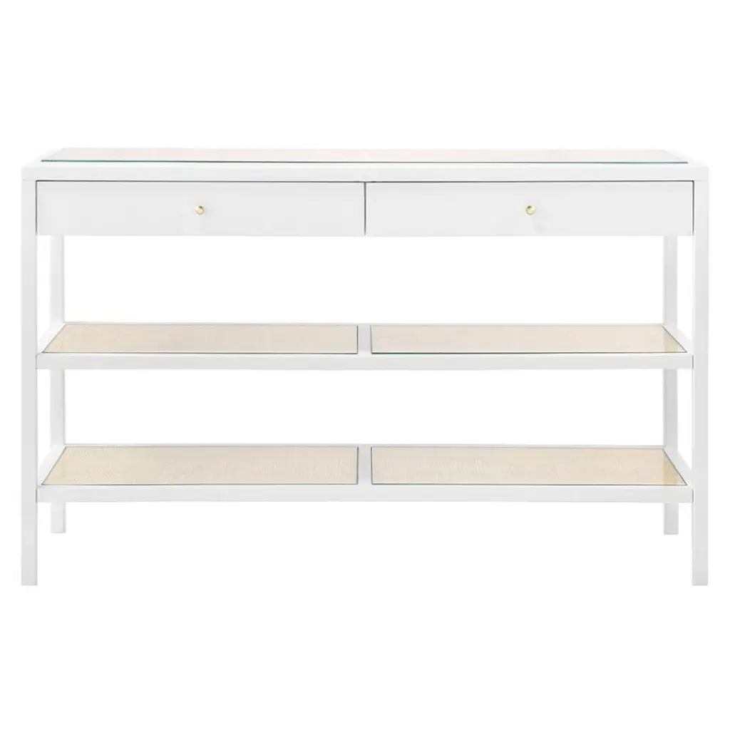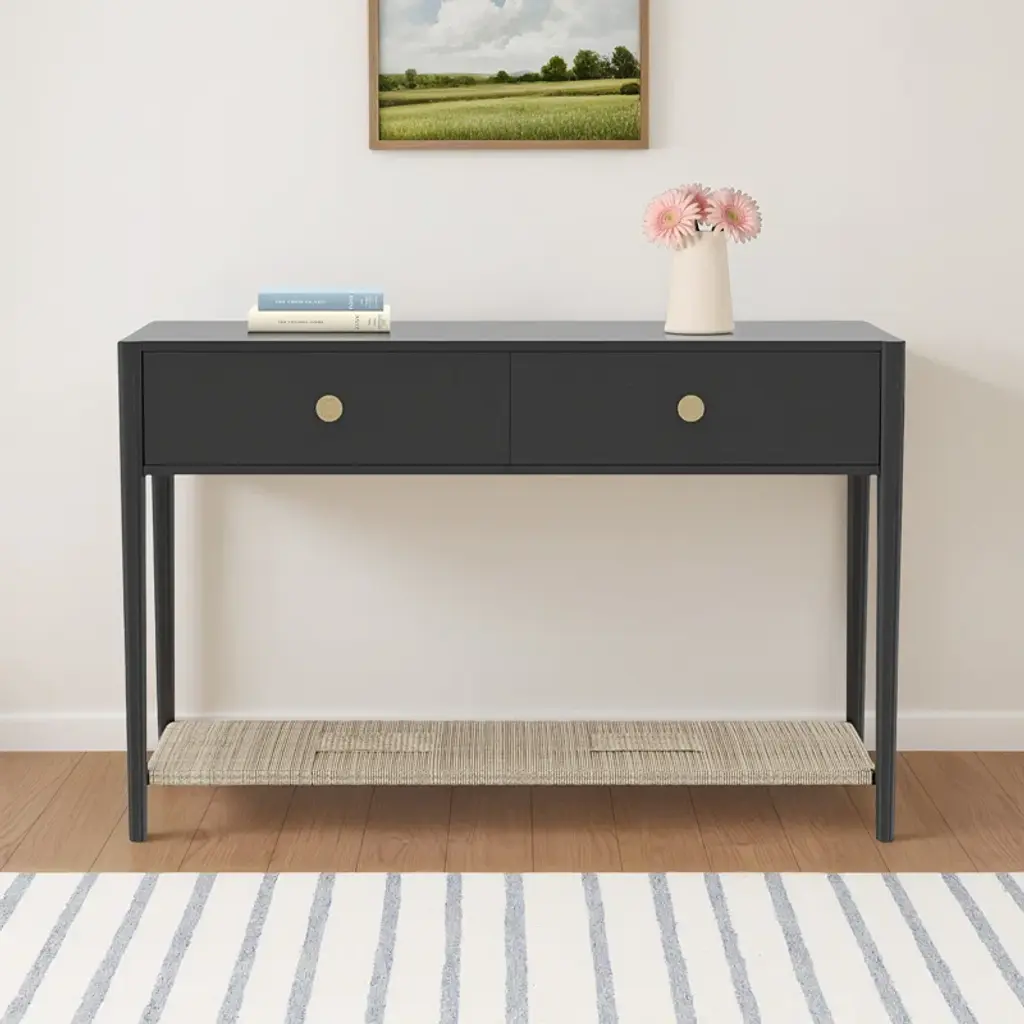 Add timeless elegance to your entryway or living space with the Eichhorn Console Table. Featuring a woven bottom shelf for added texture and storage, this console is designed with two smoothly gliding drawers on metal ball-bearing tracks. The brass-finish knobs provide a refined touch, while its fully assembled construction ensures effortless setup. Whether placed in a hallway, behind a sofa, or as a statement piece, the Eichhorn Console Table offers both beauty and functionality.