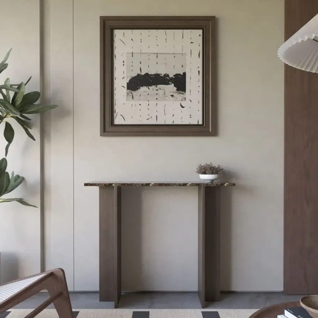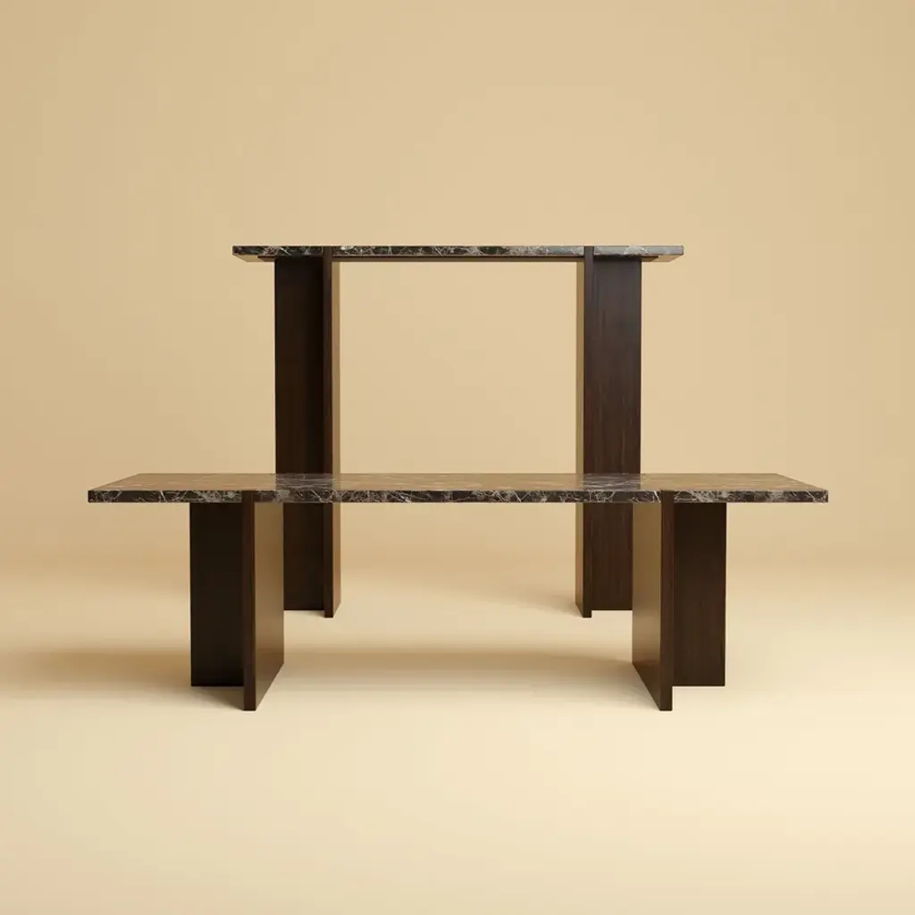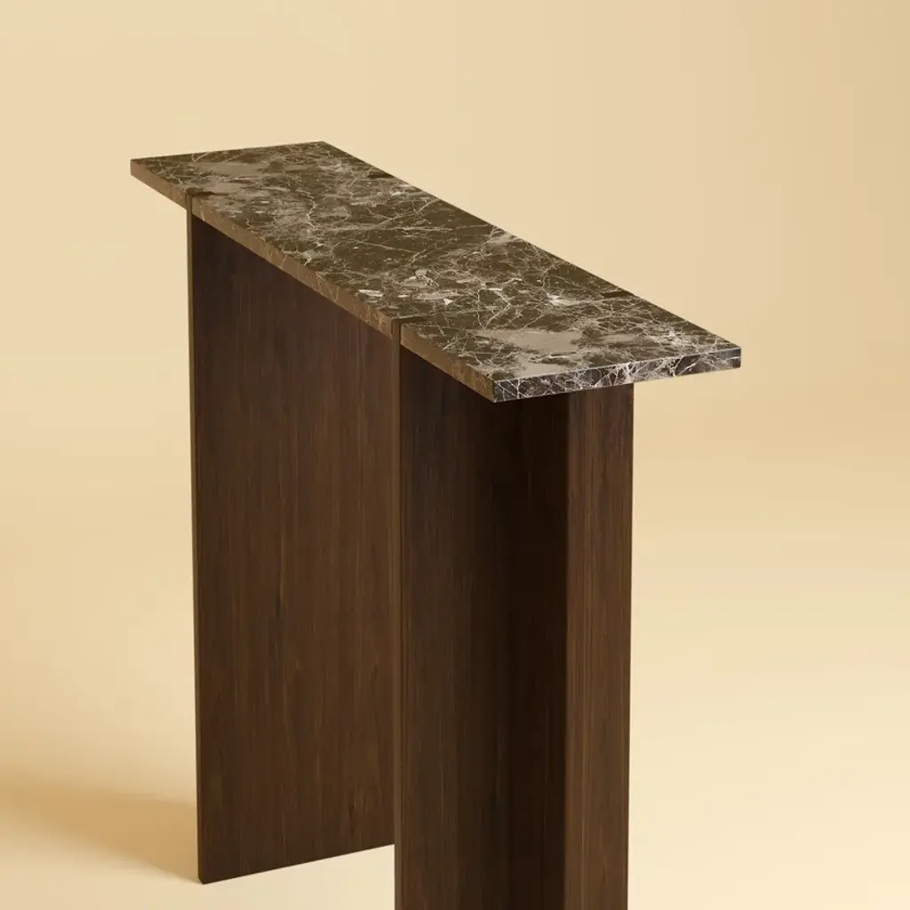 Maha is rectangular wooden and marble Emperador Dark console table.The Maha console table by Lebanto is a stunning blend of natural materials and expert craftsmanship, designed to bring timeless elegance to your home. Featuring a luxurious marble or travertine tabletop and solid oak legs, this console table is a true statement piece. Its standout feature is the intricate interlocking leg design, where the solid oak legs seamlessly connect with the tabletop, creating an eye-catching and sophisticated detail that enhances the overall aesthetic. Perfect for use in an entryway, along a hallway, or in a living room, the Maha console table offers both beauty and functionality. The marble or travertine top provides a durable, high-end surface for displaying décor, while the solid oak legs add warmth and stability. Whether your interior is modern or classic, this table's sleek design and premium materials make it a versatile addition to any space.