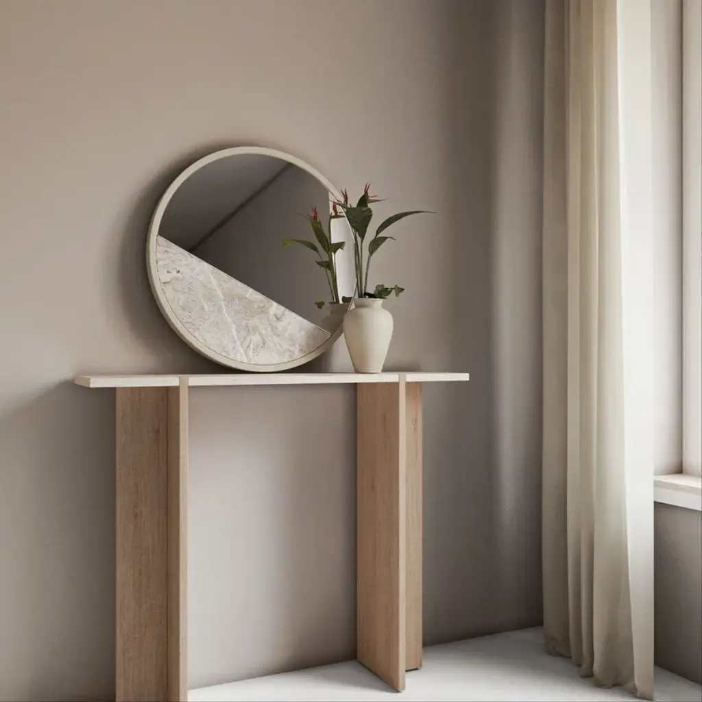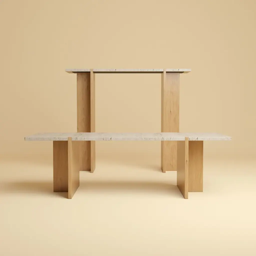 Maha is rectangular wooden and Roman travertine console table.The Maha console table by Lebanto is a stunning blend of natural materials and expert craftsmanship, designed to bring timeless elegance to your home. Featuring a luxurious marble or travertine tabletop and solid oak legs, this console table is a true statement piece. Its standout feature is the intricate interlocking leg design, where the solid oak legs seamlessly connect with the tabletop, creating an eye-catching and sophisticated detail that enhances the overall aesthetic. Perfect for use in an entryway, along a hallway, or in a living room, the Maha console table offers both beauty and functionality. The marble or travertine top provides a durable, high-end surface for displaying décor, while the solid oak legs add warmth and stability. Whether your interior is modern or classic, this table's sleek design and premium materials make it a versatile addition to any space.