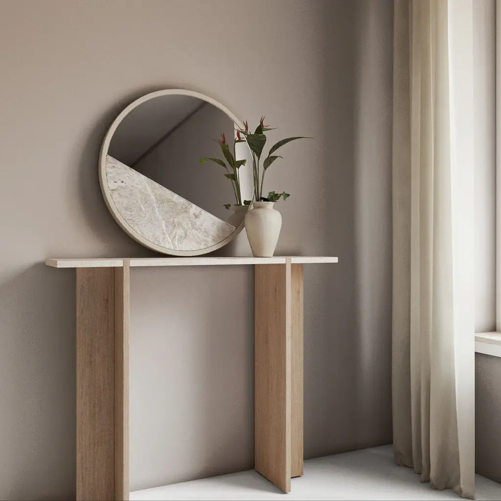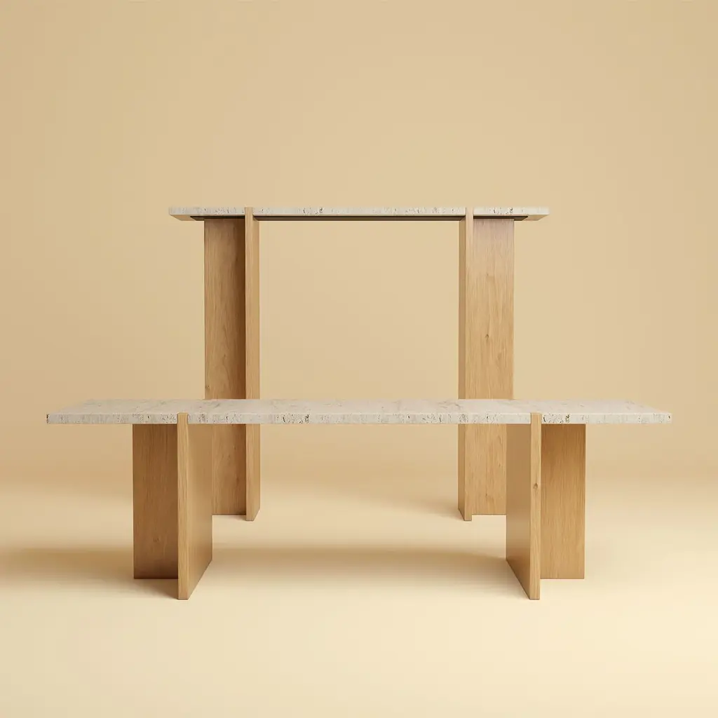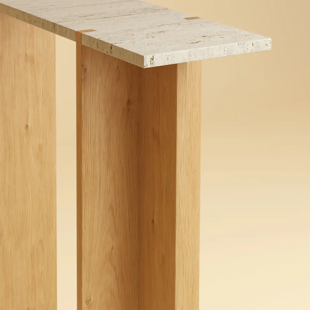 The Maha Console Table combines natural materials with expert craftsmanship, bringing timeless elegance to your home. Featuring a travertine tabletop and solid oak legs, this console table is a striking statement piece. Its intricate interlocking leg design allows the oak legs to seamlessly connect with the tabletop, creating an eye-catching detail that enhances the overall aesthetic.