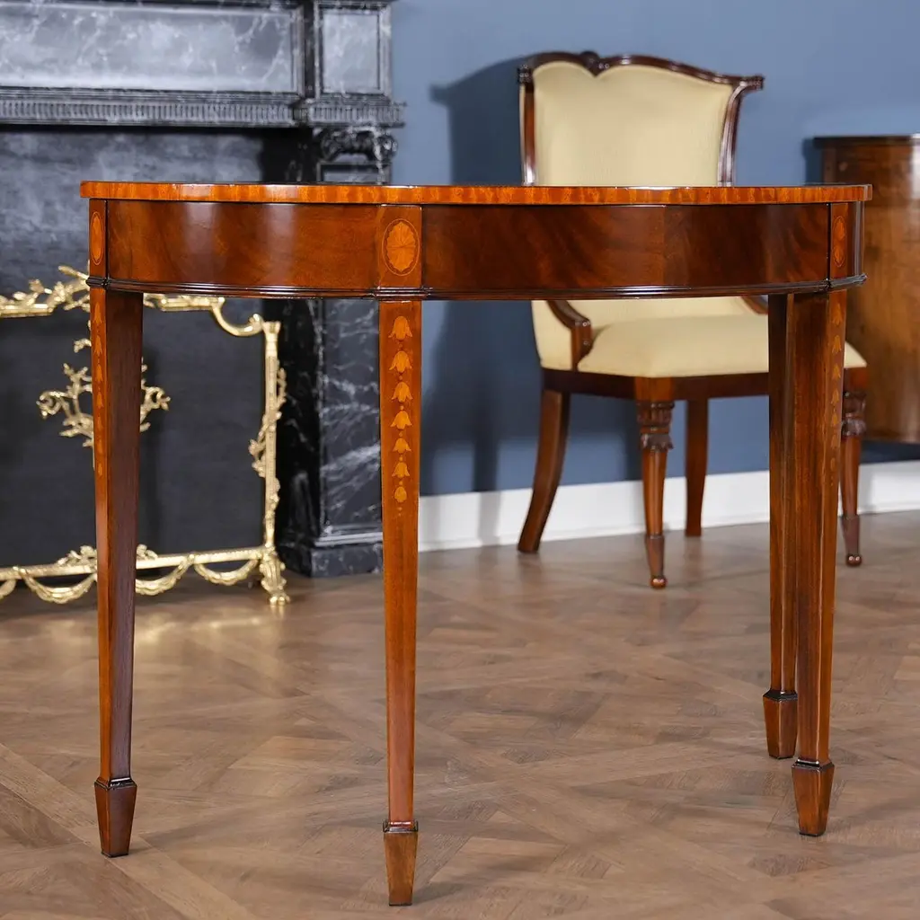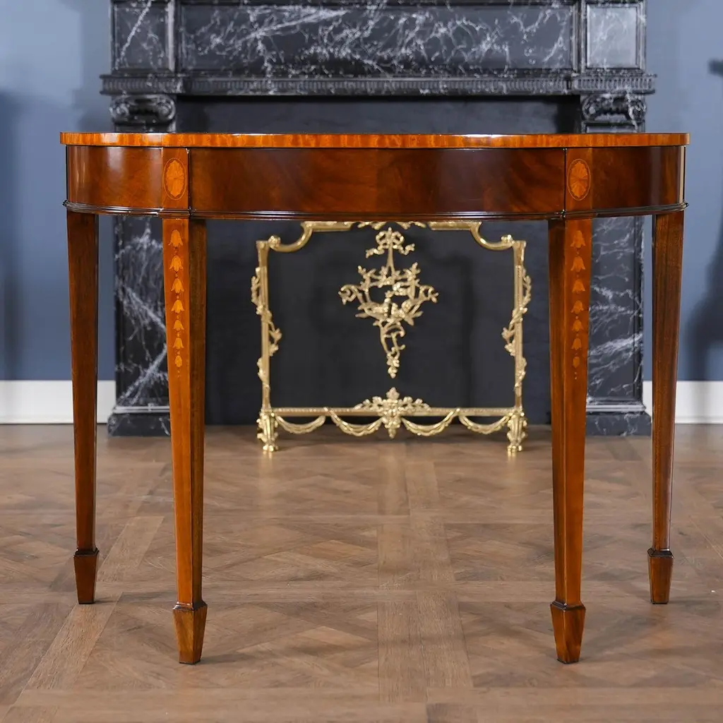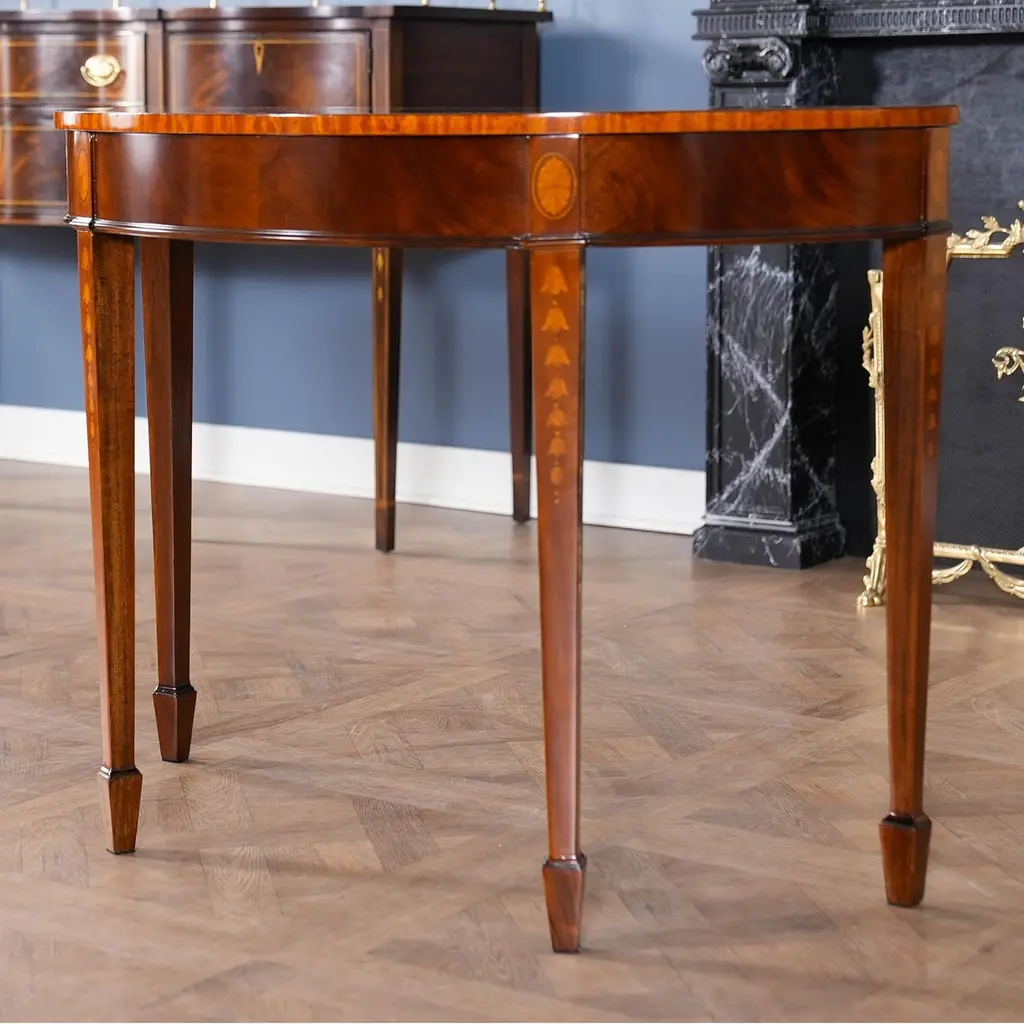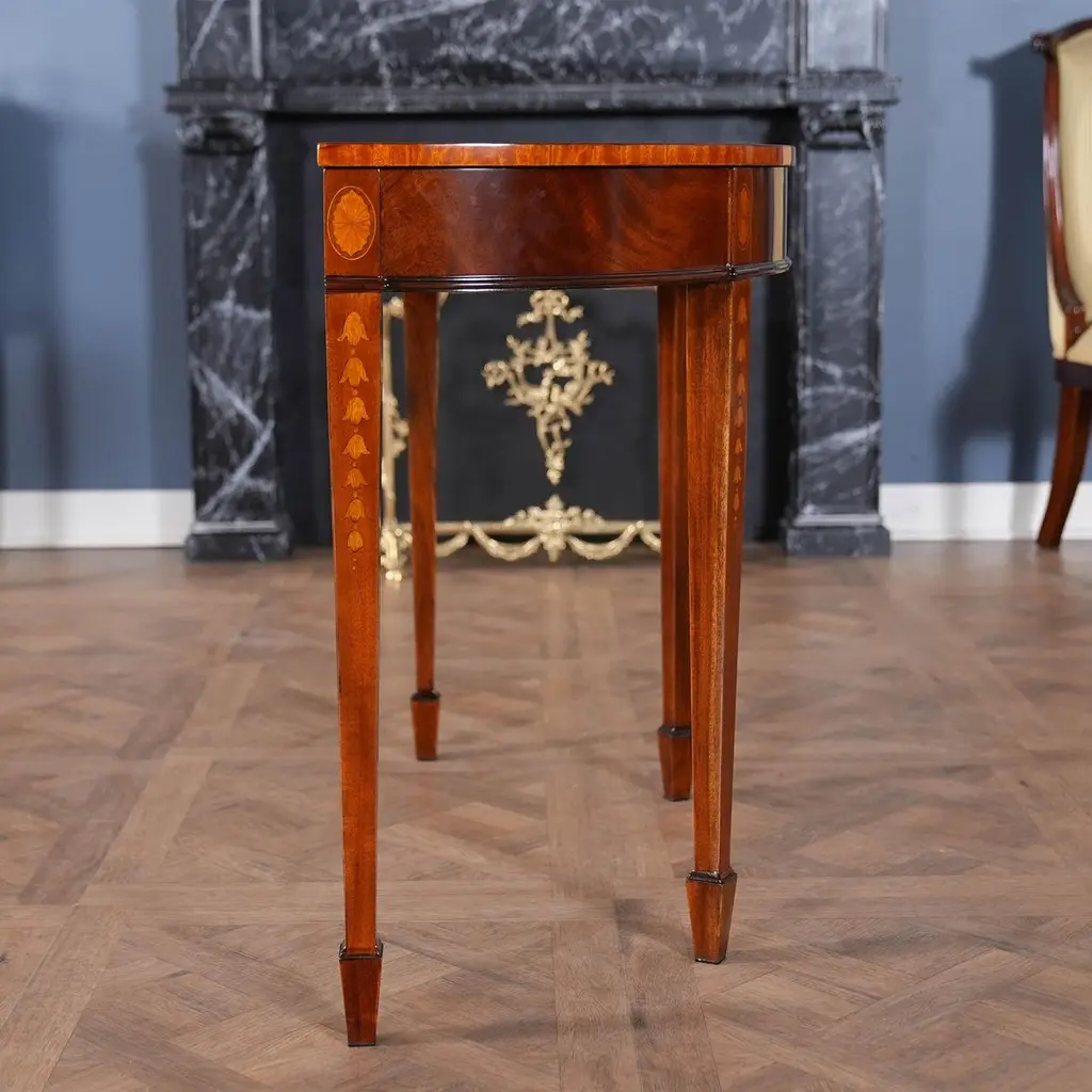 A high quality Mahogany Inlaid Sunburst Console table which makes elaborate use of hand cut inlays. The mahogany top is banded with satinwood and features a sunburst style inlay in the center, the four legs at the apron have oval fan shaped inlays and there are cascading bellflower satinwood inlays to the fronts of the legs which themselves are made from solid mahogany and end in a Hepplewhite spade foot style.Measures 43″w x 19″d x 32″h metric 109 48 81