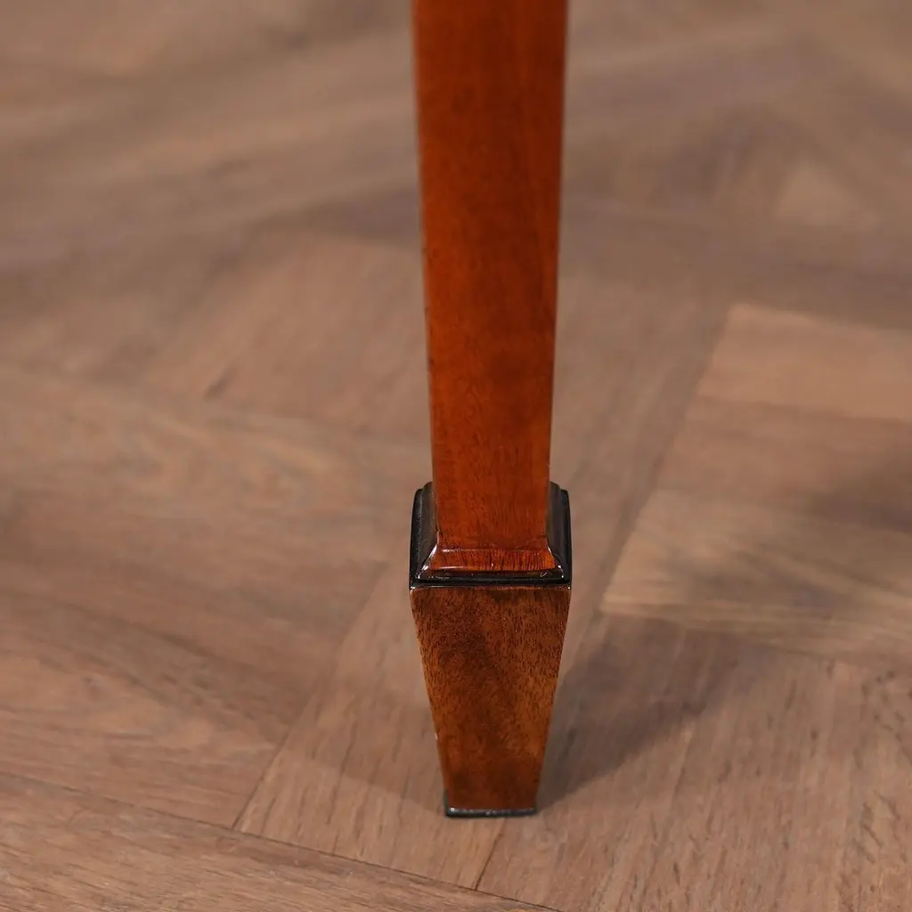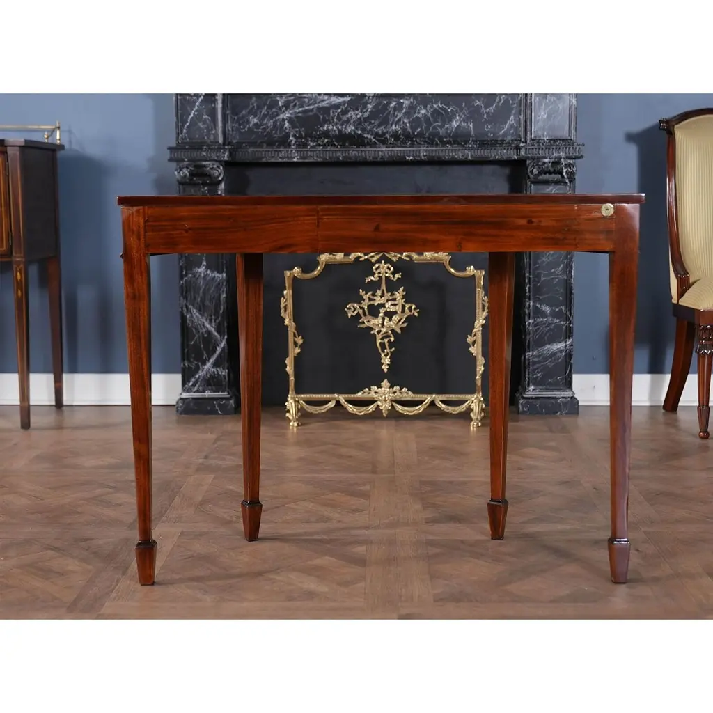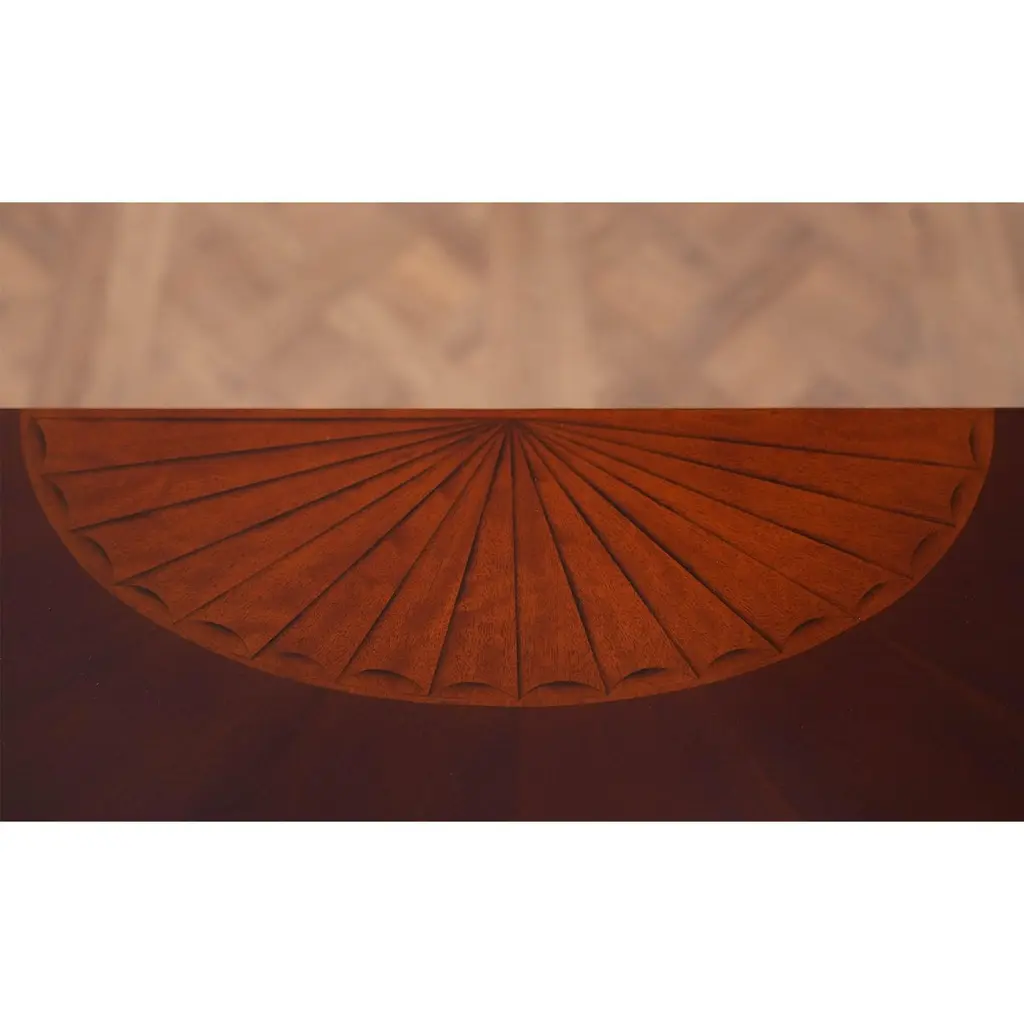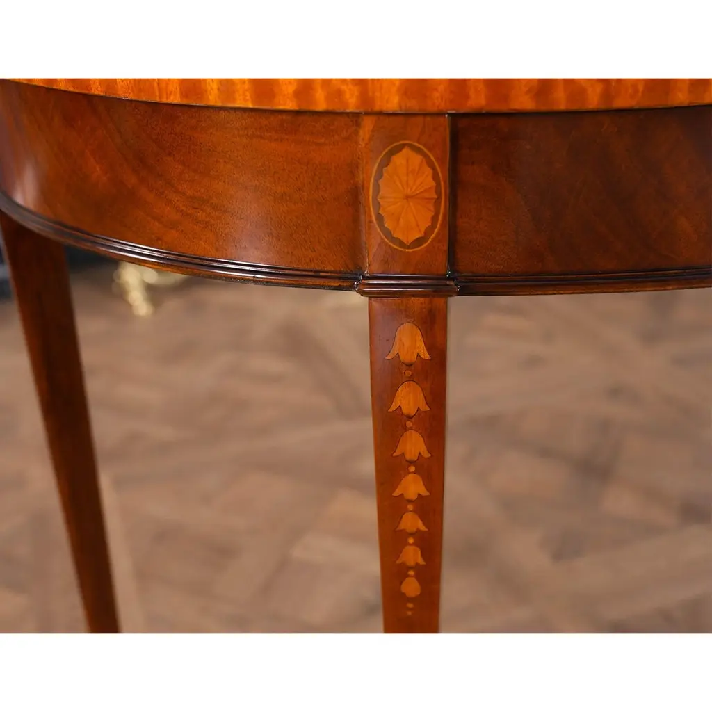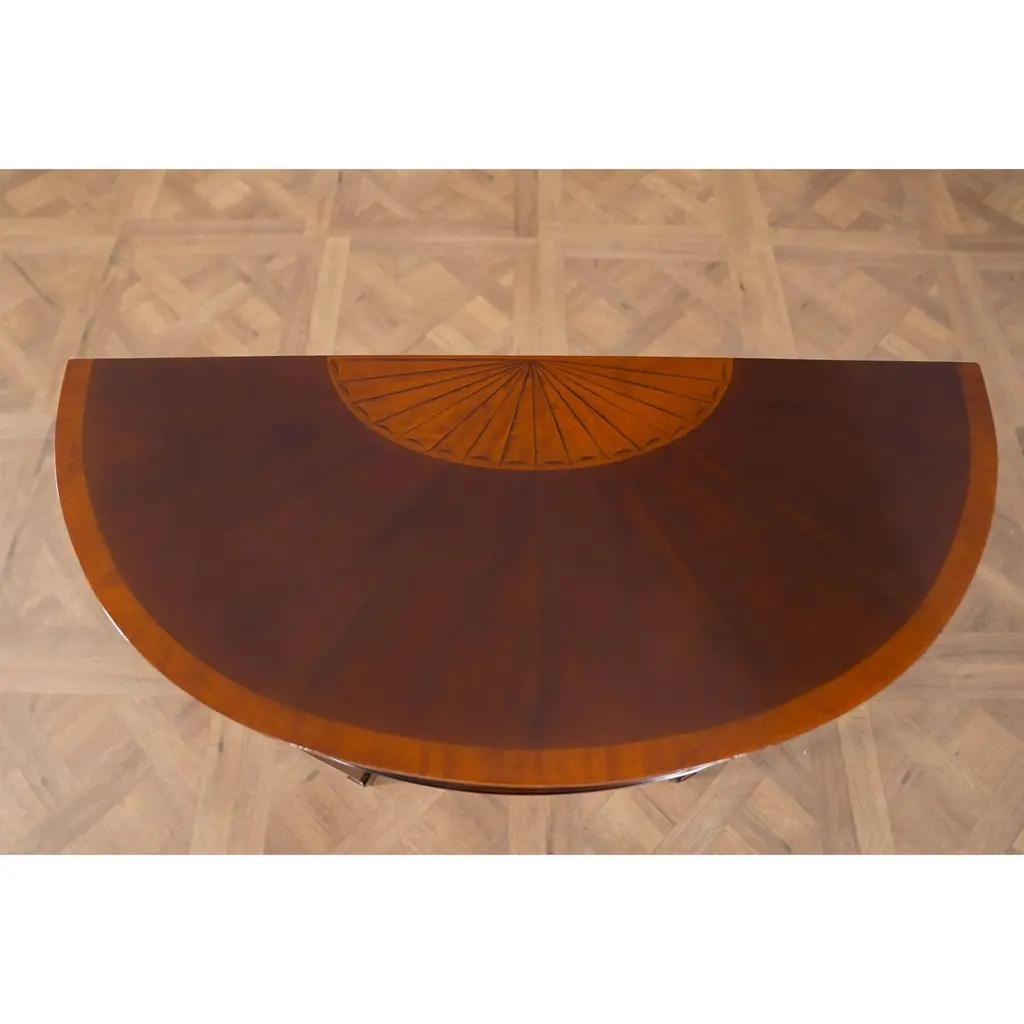 A high quality Mahogany Inlaid Sunburst Console table which makes elaborate use of hand cut inlays. The mahogany top is banded with satinwood and features a sunburst style inlay in the center, the four legs at the apron have oval fan shaped inlays and there are cascading bellflower satinwood inlays to the fronts of the legs which themselves are made from solid mahogany and end in a Hepplewhite spade foot style.Measures 43″w x 19″d x 32″h metric 109 48 81