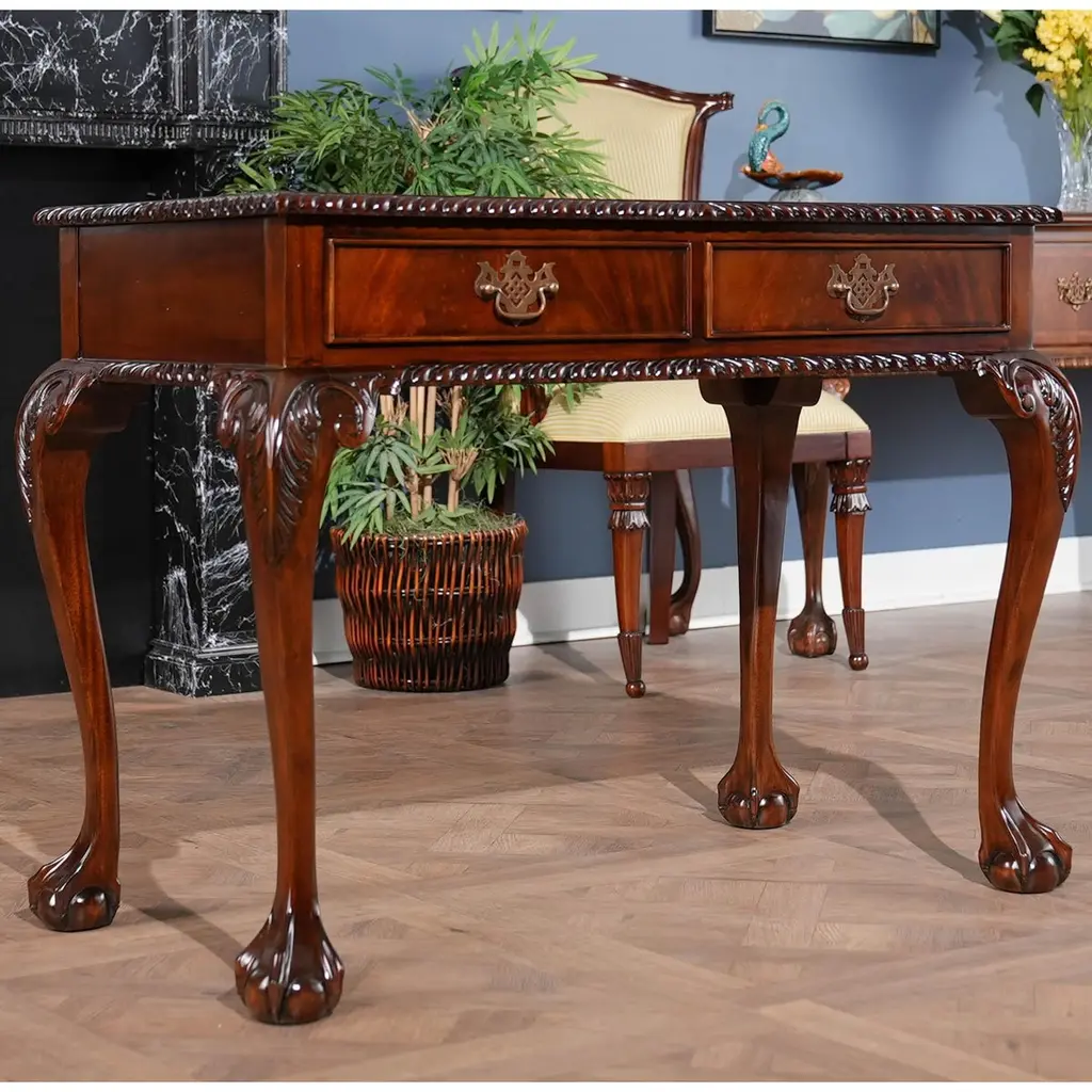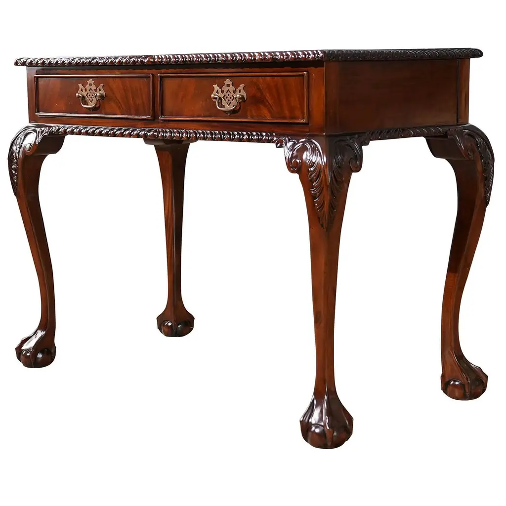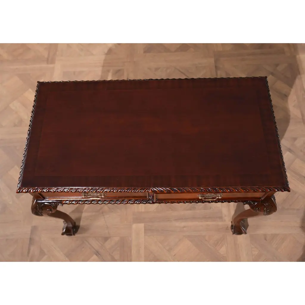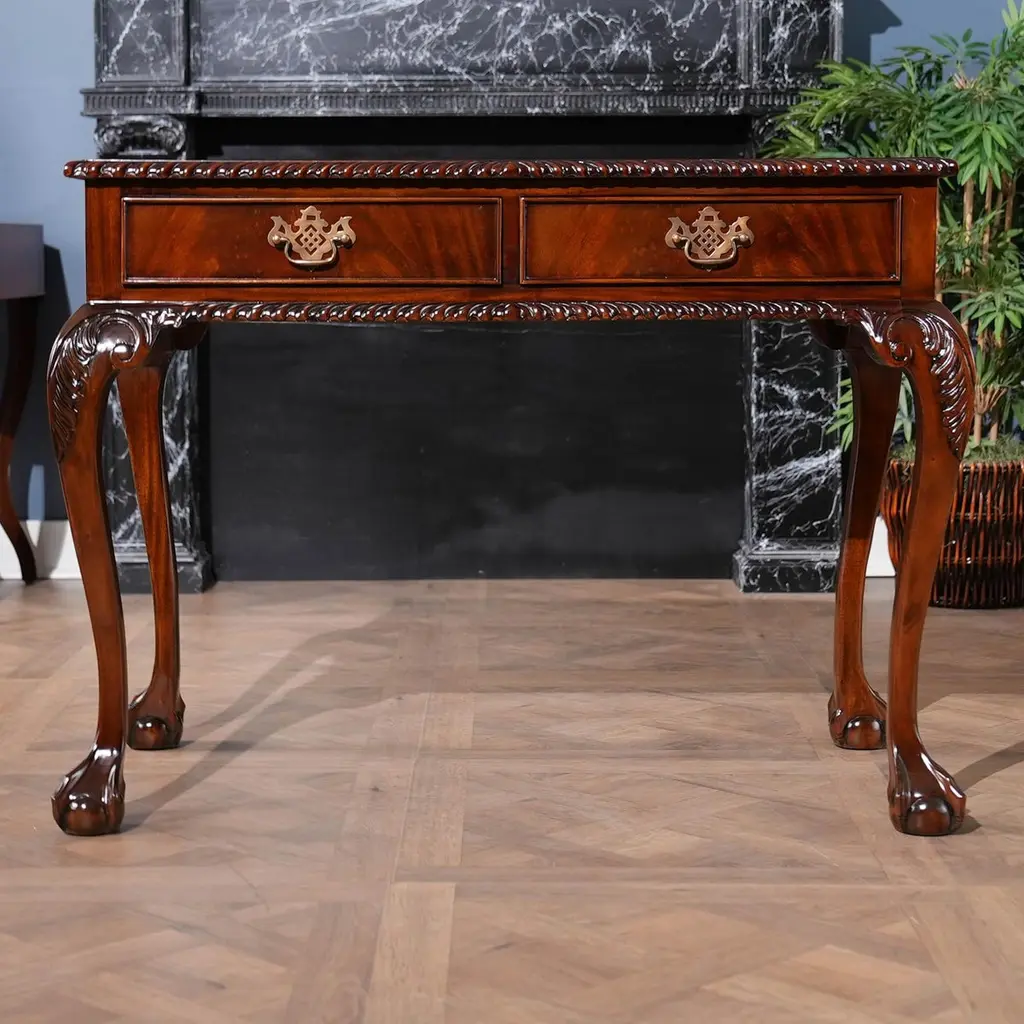A Chippendale style Mahogany Two Drawer Console with a banded mahogany top, a gadrooned (rope edged) molding over top a frieze with two dovetailed drawers which feature solid brass pulls. The cabriole legs of our Mahogany Two Drawer Console are acanthus carved at the knees while the feet are hand carved with a ball and claw design. Practical design lends itself for use in many settings through the home.Measures 41″w x 22″d x 30″h metric 104 56 76