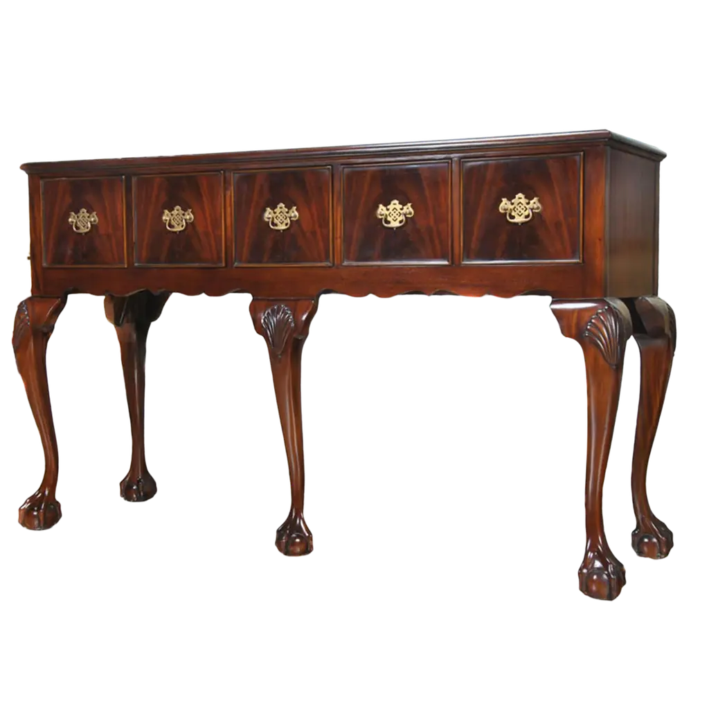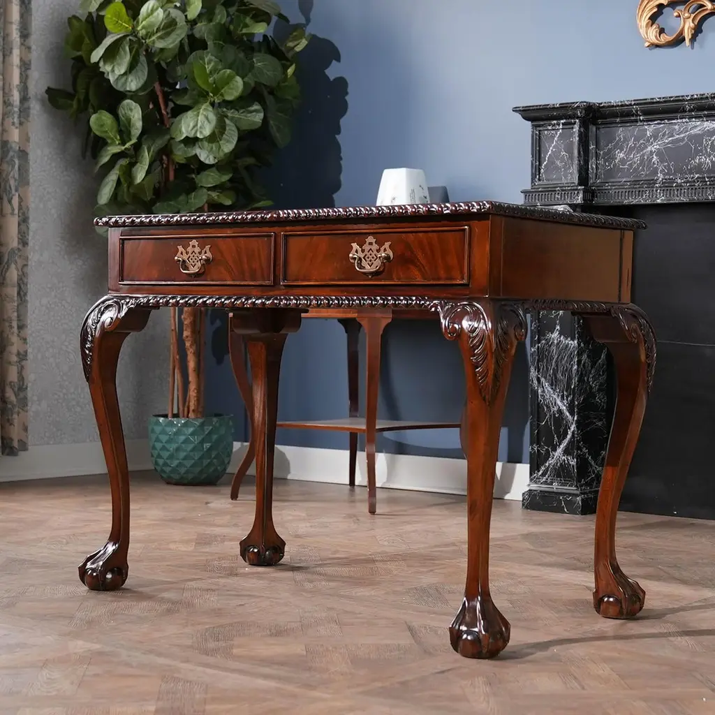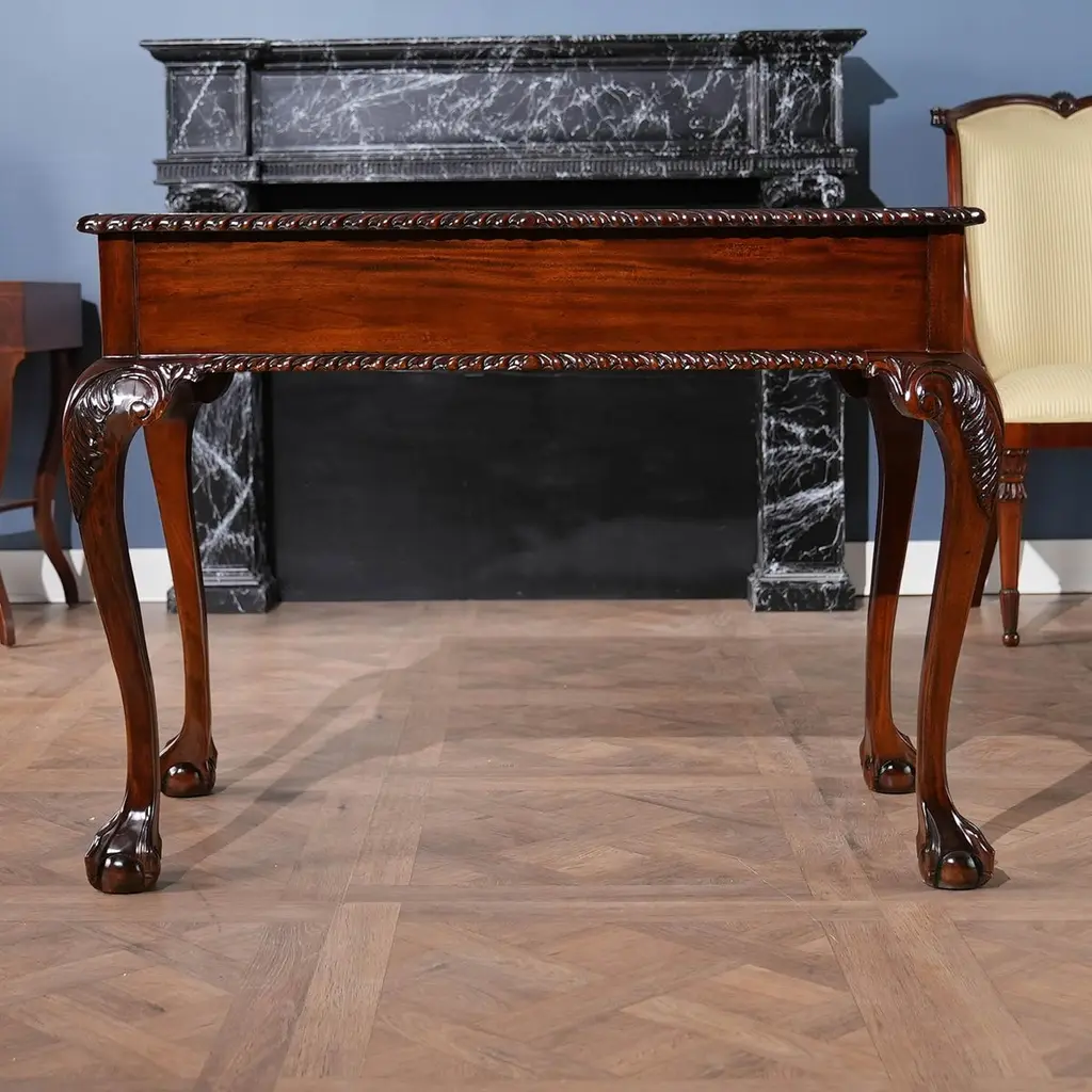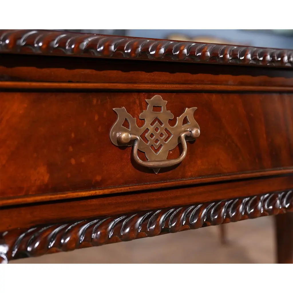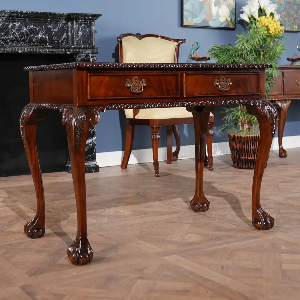 A Chippendale style Mahogany Two Drawer Console with a banded mahogany top, a gadrooned (rope edged) molding over top a frieze with two dovetailed drawers which feature solid brass pulls. The cabriole legs of our Mahogany Two Drawer Console are acanthus carved at the knees while the feet are hand carved with a ball and claw design. Practical design lends itself for use in many settings through the home.Measures 41″w x 22″d x 30″h metric 104 56 76