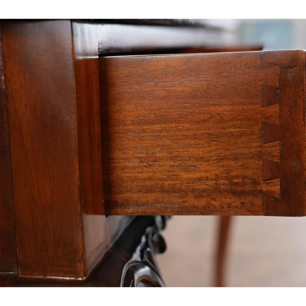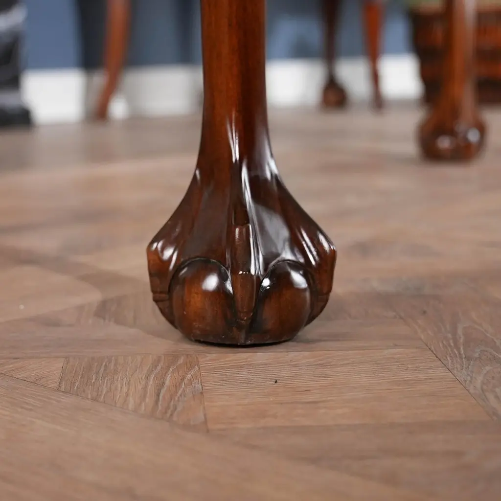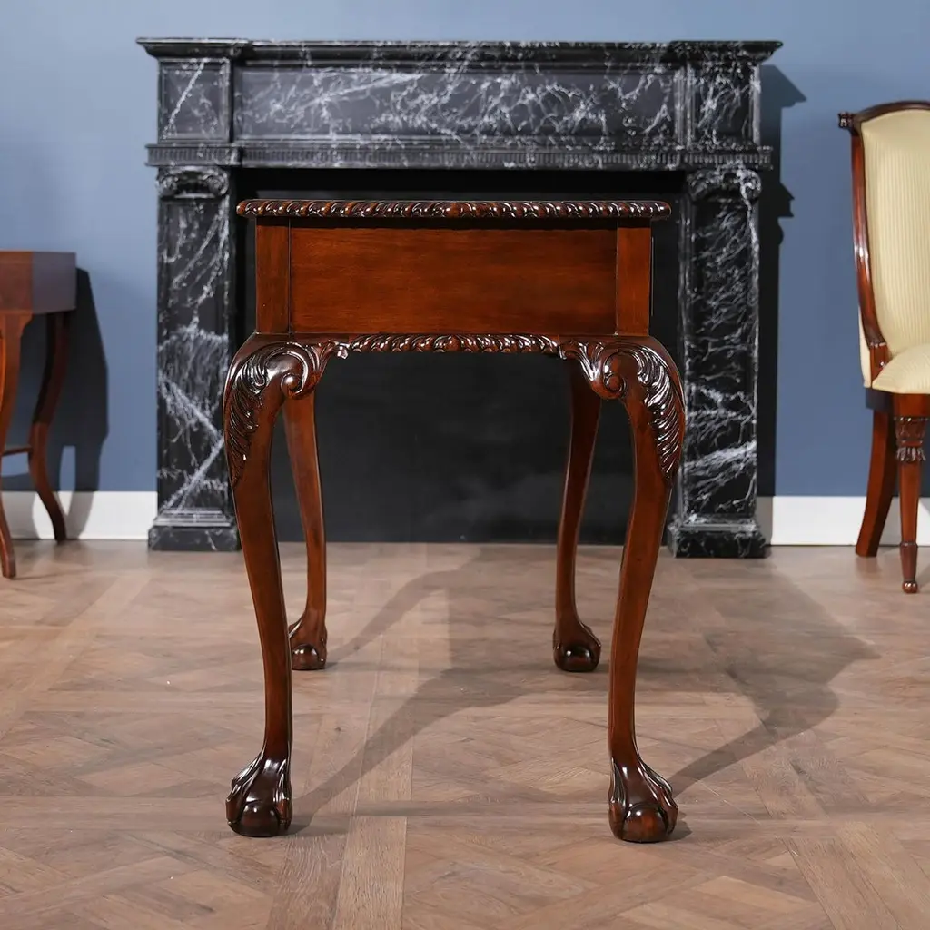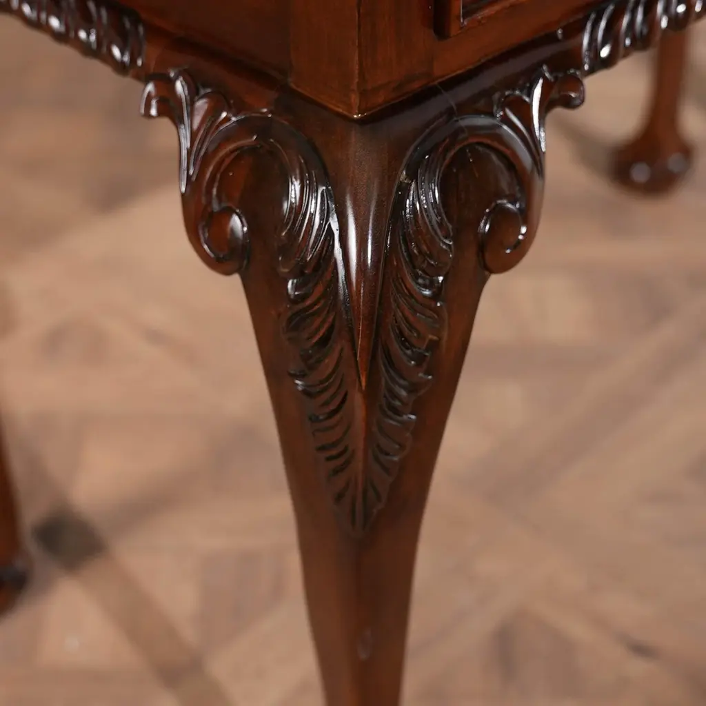A Chippendale style Mahogany Two Drawer Console with a banded mahogany top, a gadrooned (rope edged) molding over top a frieze with two dovetailed drawers which feature solid brass pulls. The cabriole legs of our Mahogany Two Drawer Console are acanthus carved at the knees while the feet are hand carved with a ball and claw design. Practical design lends itself for use in many settings through the home.Measures 41″w x 22″d x 30″h metric 104 56 76