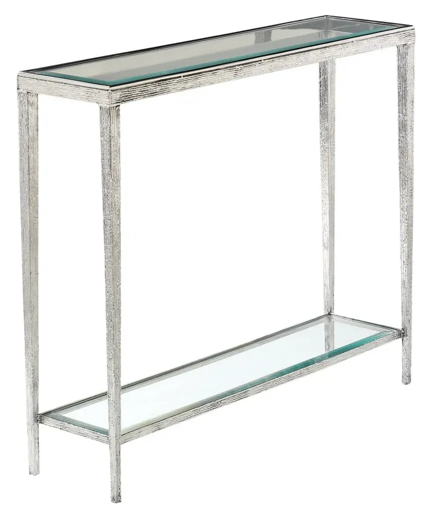 Nickel Finished Jinx Small Console Table with Inset Glass Top and Shelf