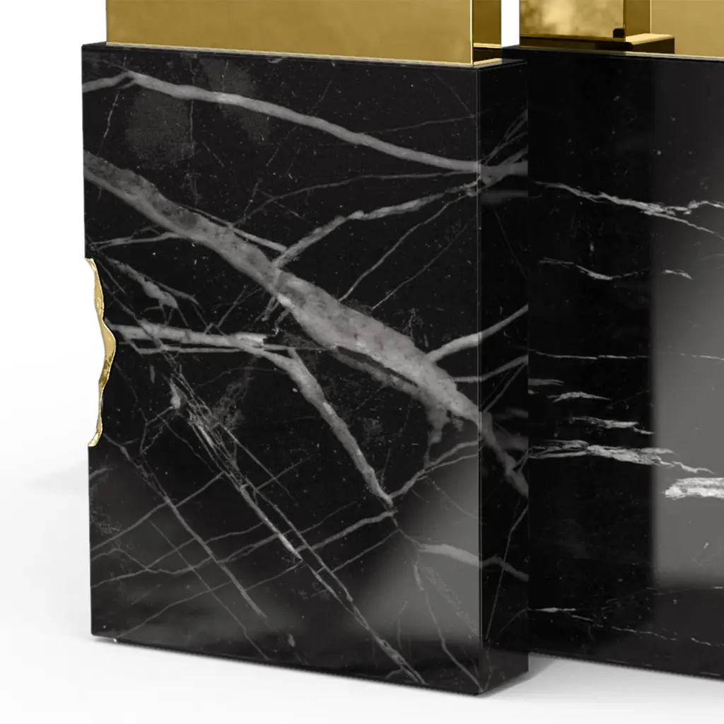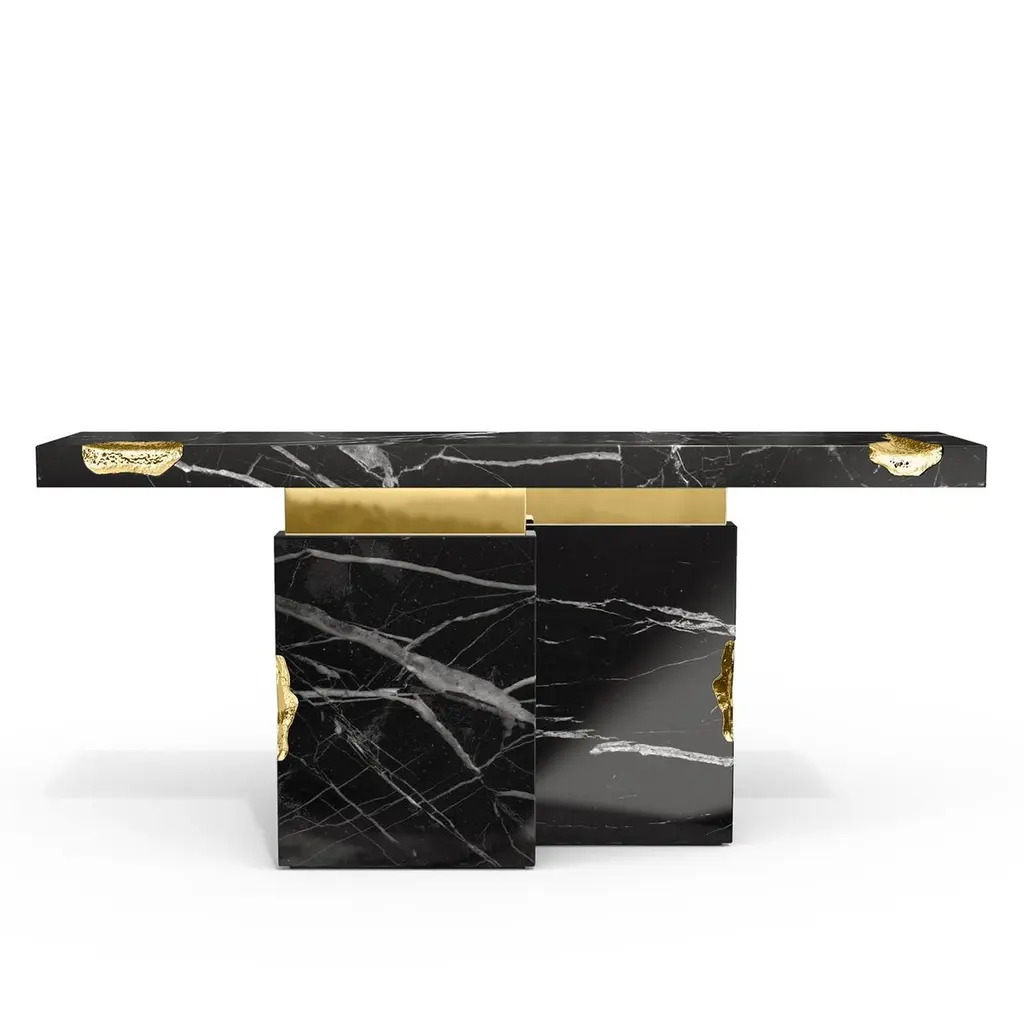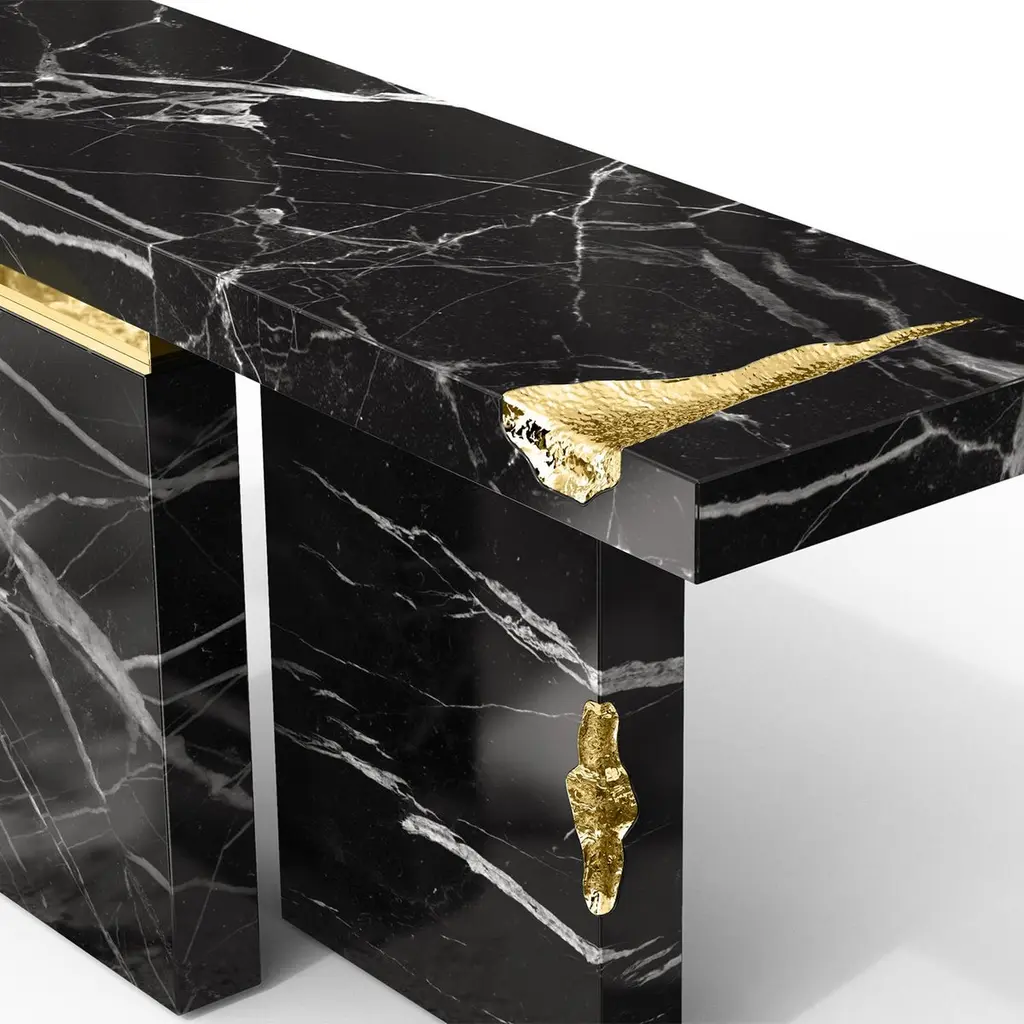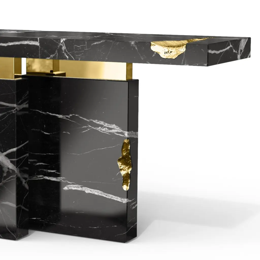 Console table Majestic Black with black marquinamarble, carved and polished. With solid polished brassand with hammered solid brass.