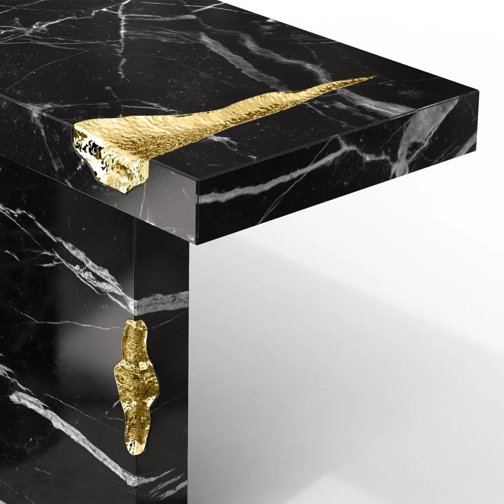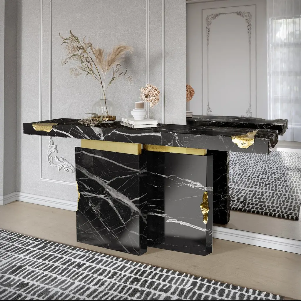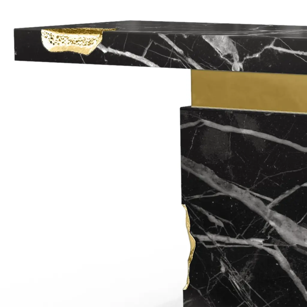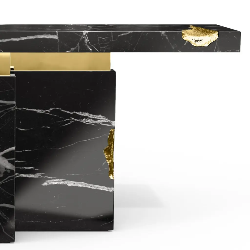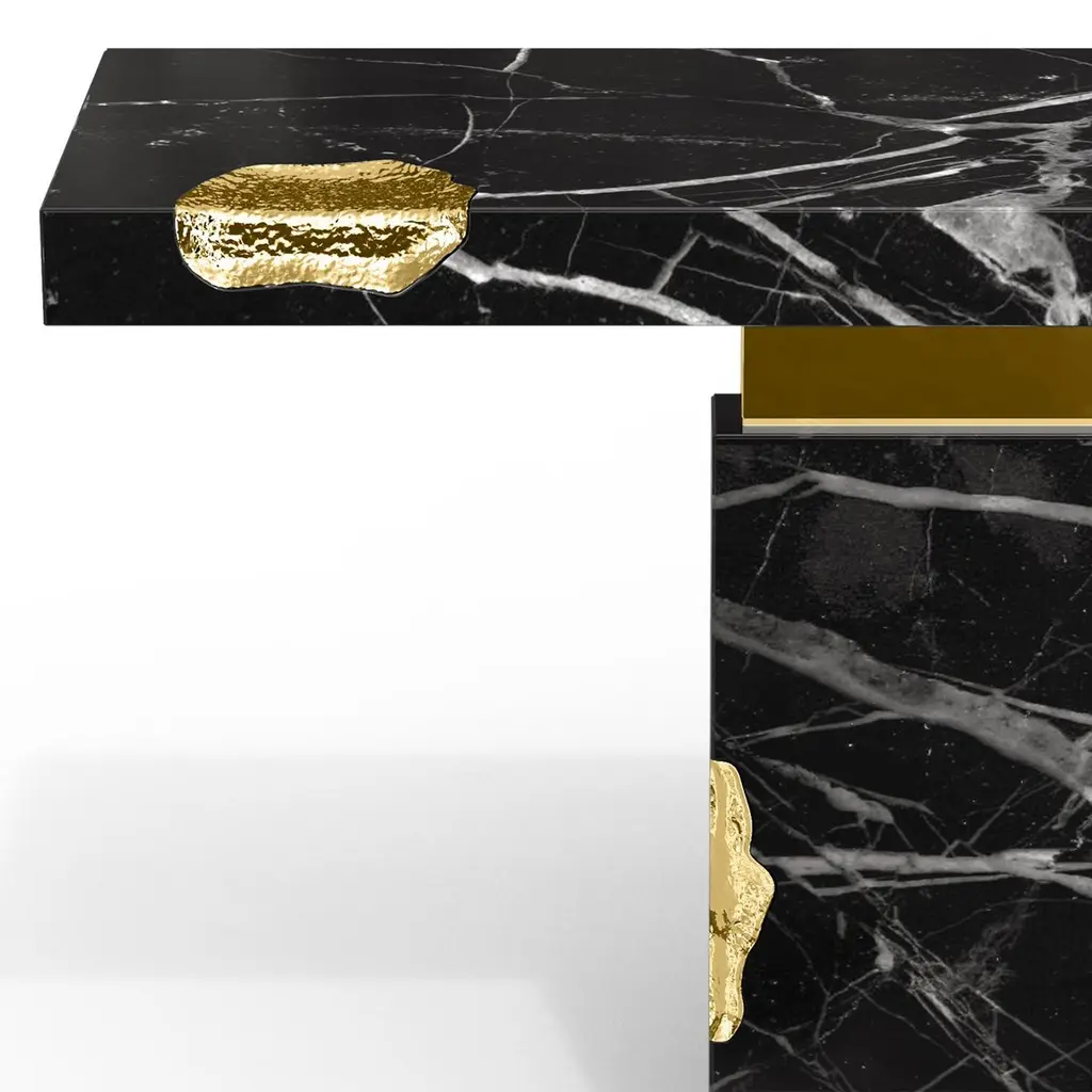 Console table Majestic Black with black marquinamarble, carved and polished. With solid polished brassand with hammered solid brass.