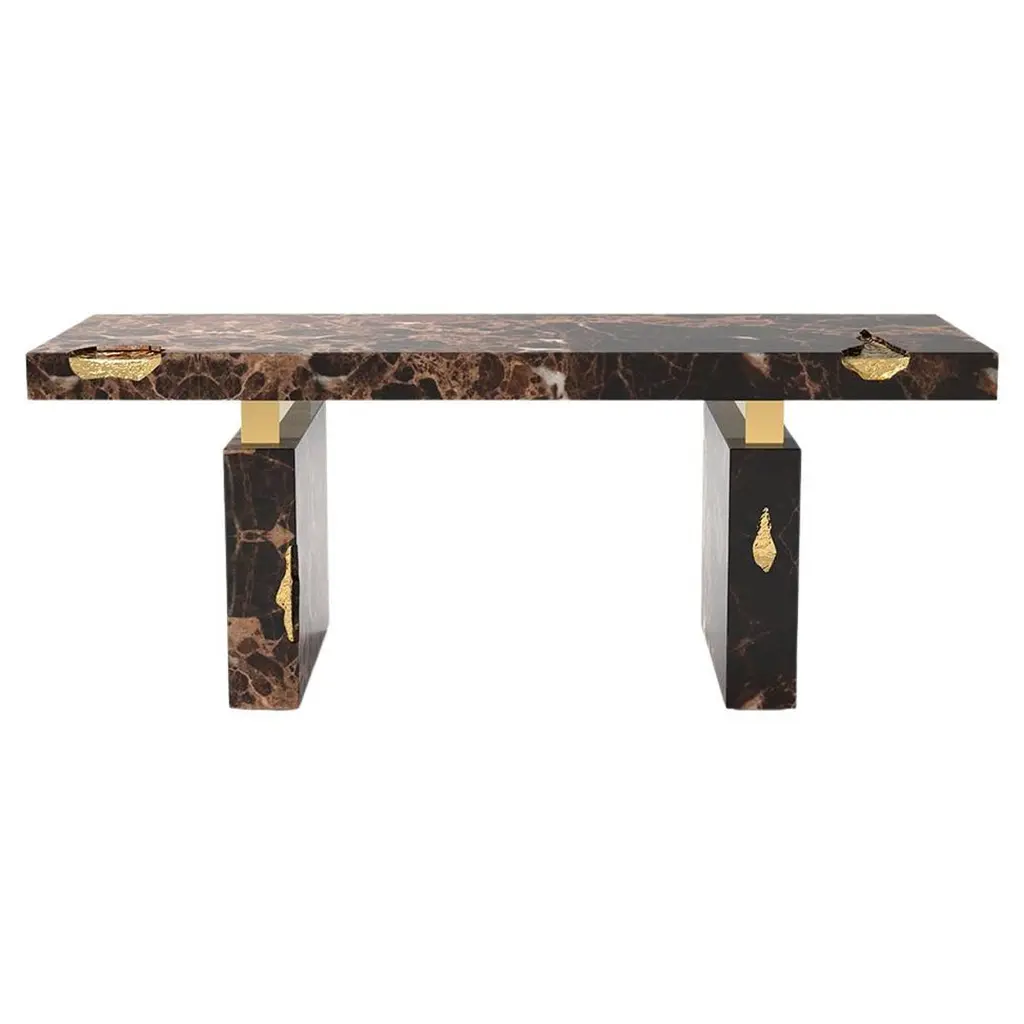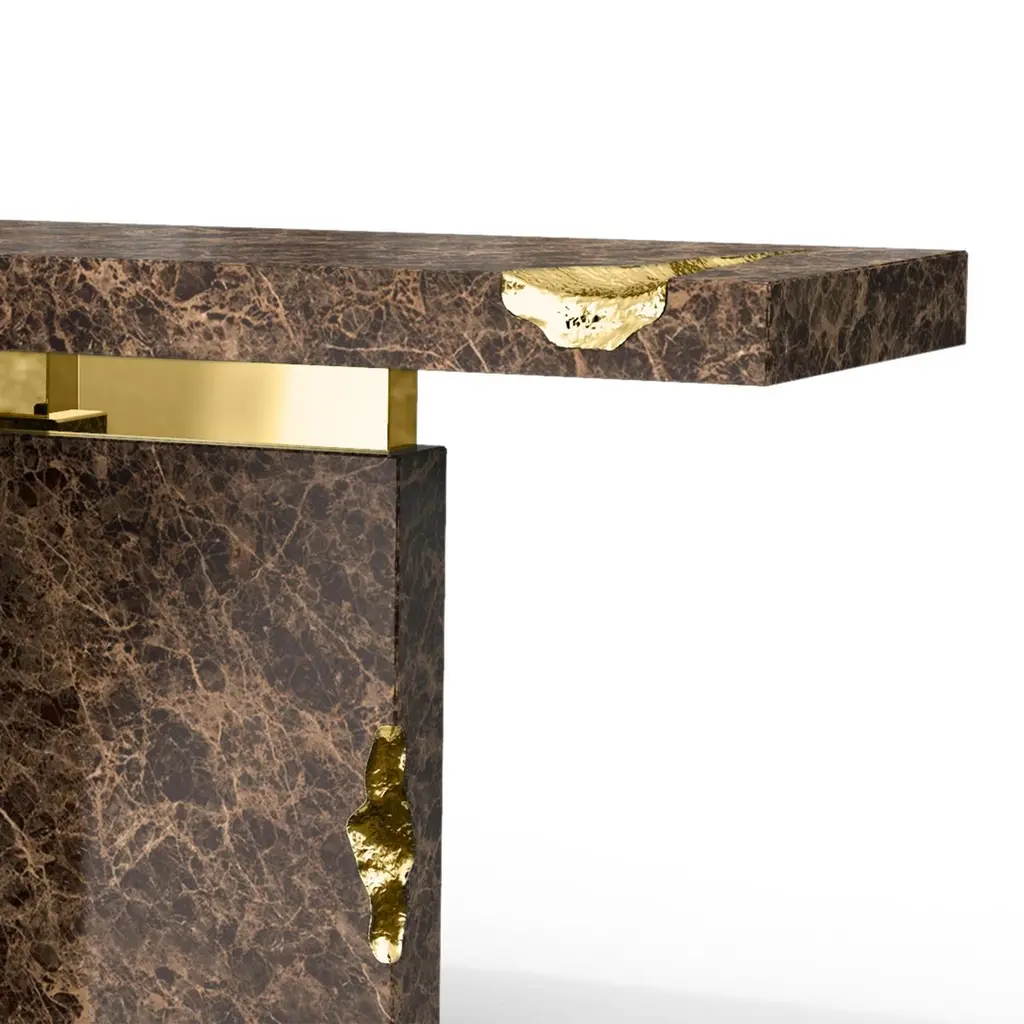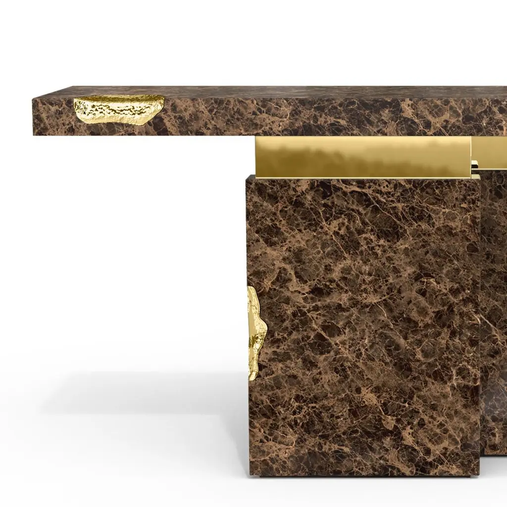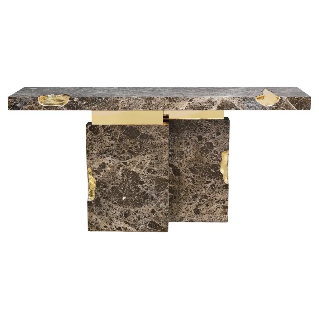 Console table Majestic brown with emperador brown marquina marble, carved and polished. With solid polished brass and with hammered solid brass.
